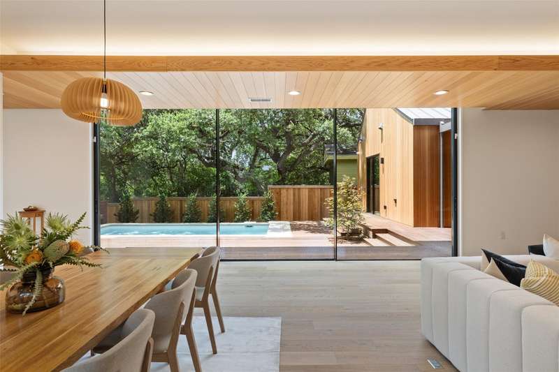 This extraordinary new construction with masterful architectural attention to space and light provides the rare opportunity to live in a modern luxury home in Travis Heights. Surrounded by majestic live oaks, this thoughtfully designed home maximizes indoor/outdoor living, with a show- stopping wall of sliding glass doors connecting the entire first floor to a sweeping Brazilian hardwood deck and pool.