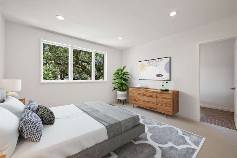 Every detail focuses on first-class materials that bring nature inside. Beautiful hardwoods, marble, quartzite, and handmade tile imbue the home with warm sophistication. Gathering areas feel both intimate and expansive with a huge entertaining kitchen containing two sinks, two dishwashers and butler pantry, and a generous open living/dining area. The primary suite features a large closet, wood- wrapped spa bath, walk-in shower, and ample storage. Two spacious ensuite bedrooms with walk-in closets and laundry complete the second floor, and the third floor provides a bonus attic space and wonderful roof terrace in the treetops with downtown views. The guest suite is conveniently located off the entry and a flex suite for an office, gym, or nanny suite resides next to the pool.