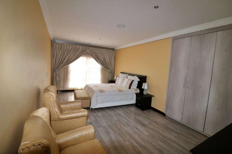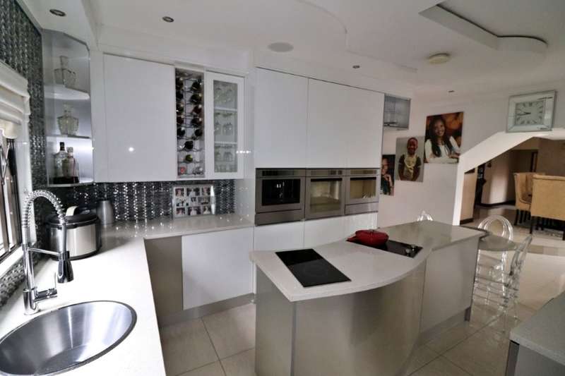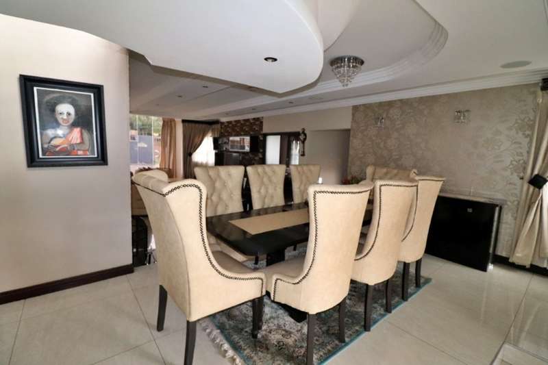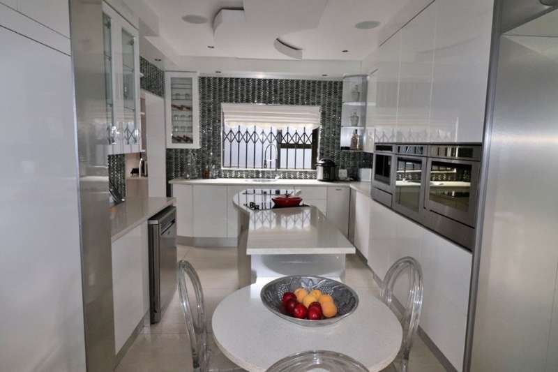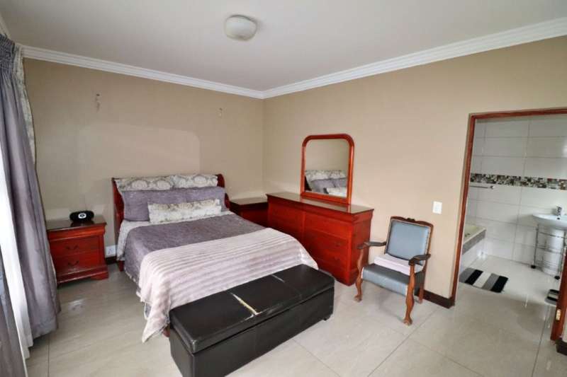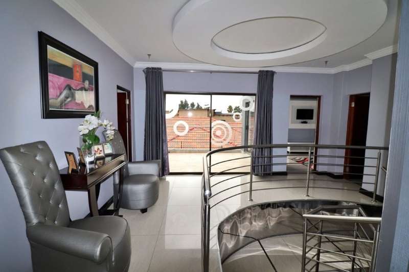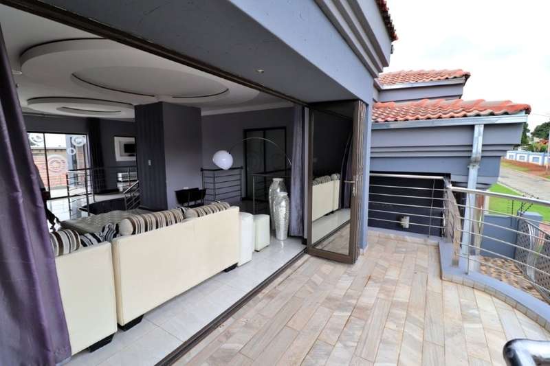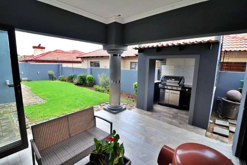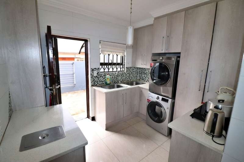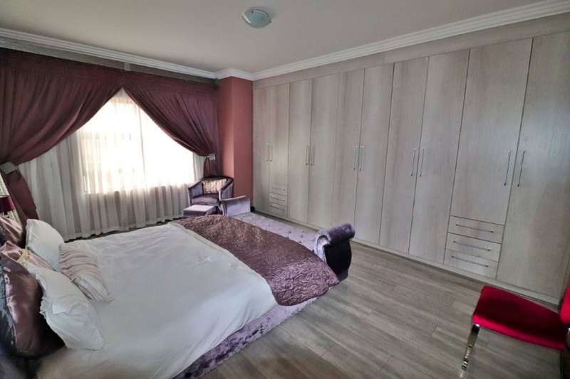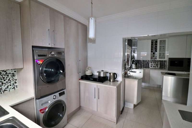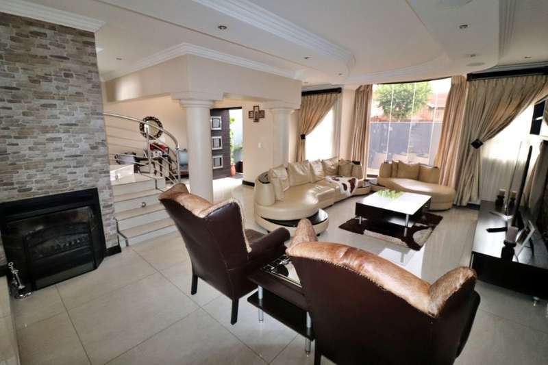 This exquisite 4-bedroom, 3-bathroom residence is the epitome of modern elegance, featuring high-end finishes and a seamless blend of style, comfort, and functionality. Property Highlights: • Elegant open-plan living and dining spaces flow effortlessly from a grand entrance hall, perfect for both entertaining and everyday family living • Three spacious upstairs bedrooms, all with built-in cupboards • Luxurious master suite with its own private lounge and walk-in wardrobe • A generously sized fourth guest bedroom is located on the ground floor, complete with built-in cupboards • Two sleek, modern bathrooms upstairs (including a main en-suite) • Full guest bathroom on the lower level Gourmet Kitchen & Utility Features: • Fully equipped contemporary kitchen with built-in oven, microwave, coffee machine, and a stylish breakfast nook • Premium stone countertops, designated space for a dishwasher • Separate scullery with space for a washing machine and tumble dryer Upstairs Retreat: • Leisure lounge and dedicated media room with stacking doors opening to a spacious balcony • Personal gym or fitness area • Private office space or business hub Outdoor & Additional Amenities: • Entertainer’s terrace featuring a built-in braai area – your very own outdoor haven • Separate staff accommodation with bedroom, full bathroom, and kitchenette • Solar geyser for energy efficiency • Automated double garage • Advanced security including alarm system, electric fencing, CCTV surveillance, and automated gates This ultra-modern home offers everything a discerning buyer could want – space, elegance, and security – all set in the sought-after neighborhood of Mimosa Park.