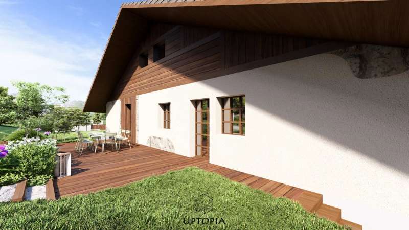 Magnificent farmhouse located in a very rural area of Combloux, sold with an Assistance à Maîtrise d'Ouvrage (AMO) contract for complete renovation. The project includes six en suite bedrooms, a vast living room under the roof, a relaxation area with indoor swimming pool, a cinema room and a garage. Over 3,000 m² of land in an agricultural zone offer real comfort in the heart of a preserved environment.