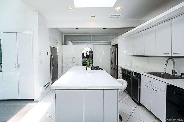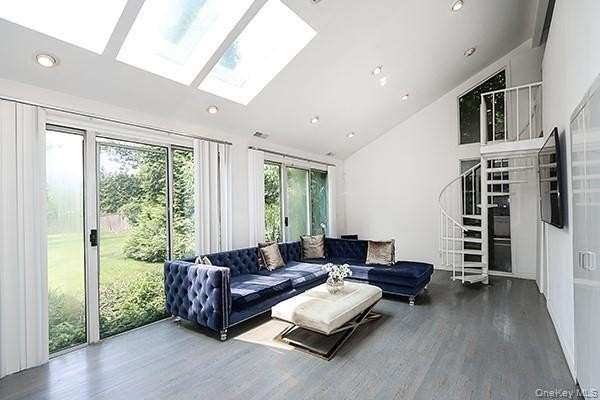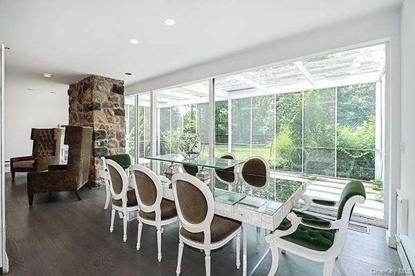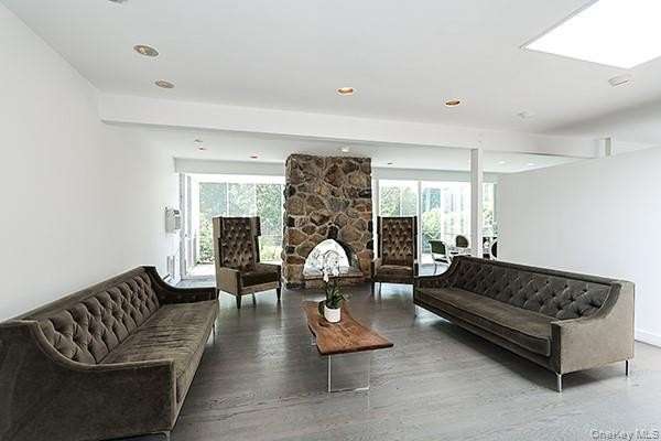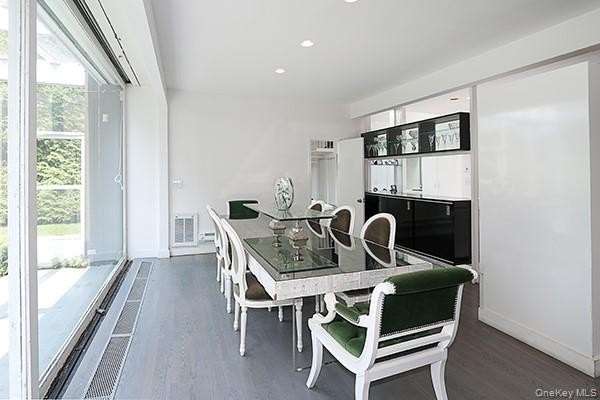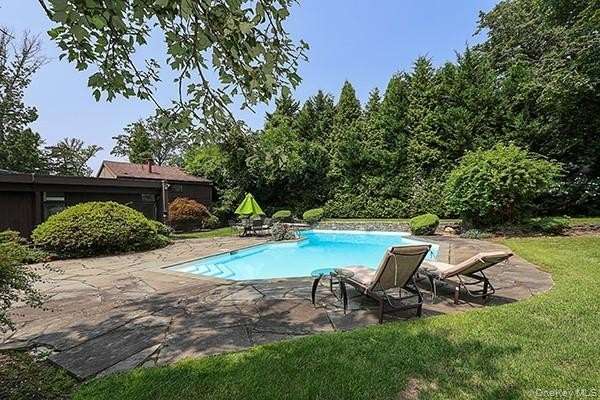 Exquisite Sun-Drenched Contemporary Ranch in the Heart of Kings Point Built by award-winning architect George Nemeni, this stunning home sits on a flat, meticulously manicured property and offers the perfect blend of elegance and comfort. The main level features a spacious primary suite with full bath, three additional bedrooms, and two full baths. The sun-filled living room with fireplace opens to a private dining room with floor-to-ceiling windows, leading to a glass-enclosed sunroom and backyard. The gourmet kitchen boasts a wide center island, white cabinetry, stainless steel appliances, and ample storage, flowing seamlessly into a large den with wet bar, oversized windows, and sliding doors to the pool and patio. A staircase from the den leads to a versatile upstairs office and storage space. Laundry room conveniently located off kitchen. Outdoors, enjoy a built-in gas grill, lush landscaping, and a pristine in-ground pool. Additional highlights include exceptionally low taxes and a prime Kings Point location.