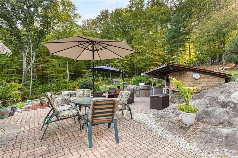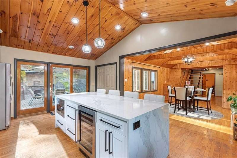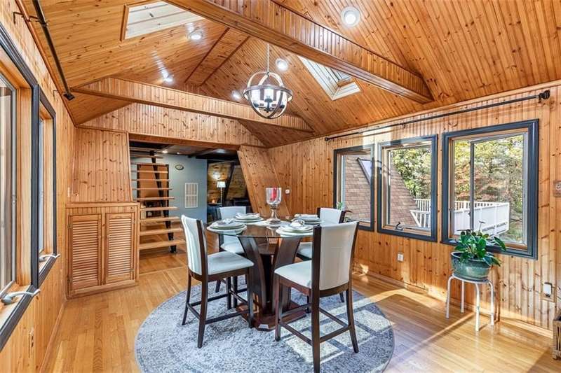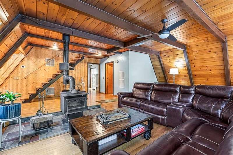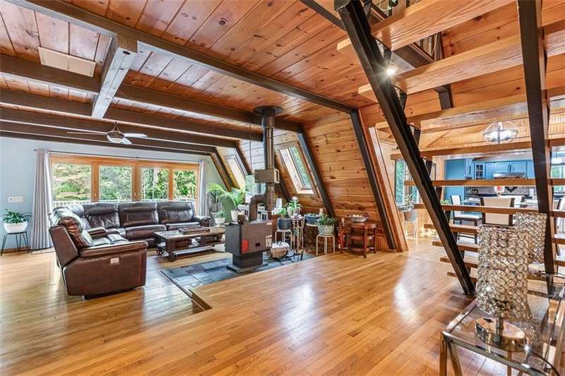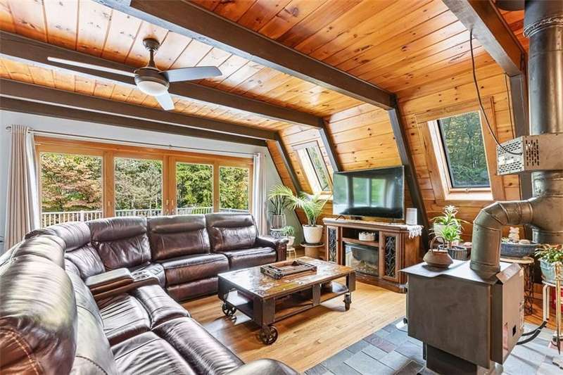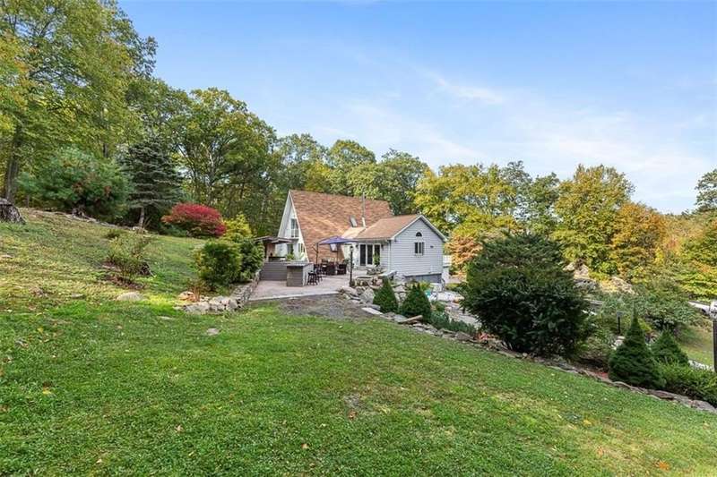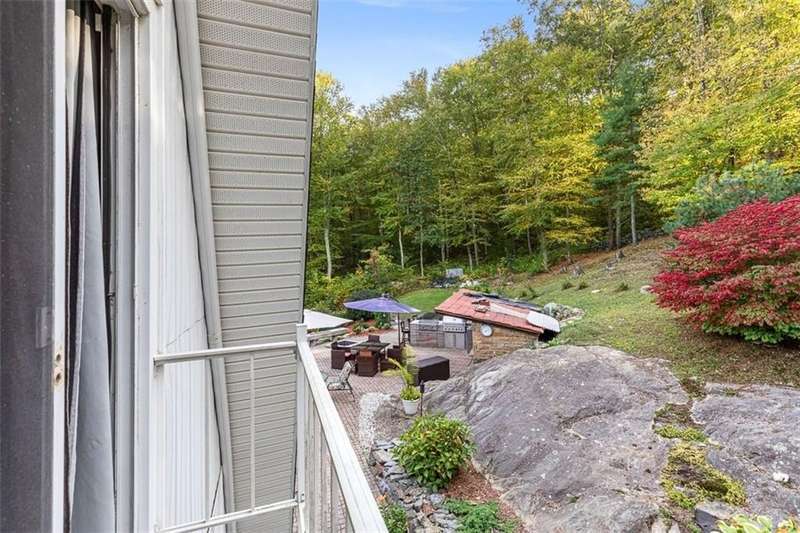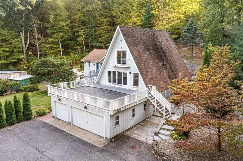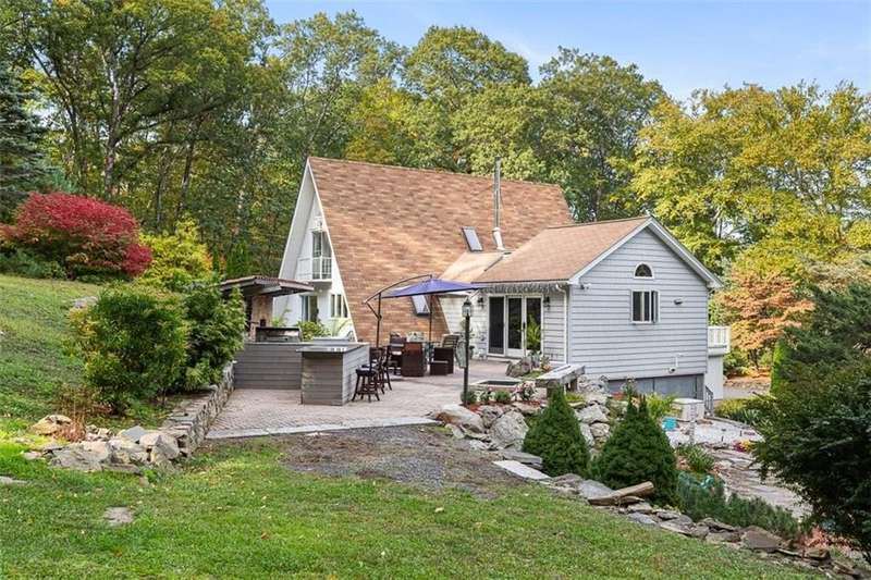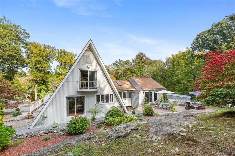 THE outdoorsy entertainer's retreat has hit the market. A charming and secluded haven - this woodsy contemporary home has everything you need for stellar backyard gatherings day or night. Just under an acre with a picturesque landscape, paved patio, outdoor grilling island with beverage cooler and two grills along with a brick oven - the outdoor area is impressive. The list goes on: sweet pergola, built in fire pit, outdoor storage port/container, chicken coop, sprinkler system, ample parking and more. Immersive wooded privacy and stunning natural ledge features are a feast for the eyes. Inside, this swanky extended 3 bed 2.1 bath A-Frame graces us with pine walls, hardwood floors, cathedral ceilings, skylights and multiple outdoor experiential access points to patios and balconies. Each bedroom flaunts a patio or balcony, as does the living room and kitchen. Cozy up by the wood stove in the living room. Enjoy a soak in the relaxing bathroom jet tub. A ravishing and bold kitchen checks all the boxes. Stainless steel appliances, beverage cooler, oversized island with a quartz waterfall countertop - indoor entertaining is fabulous, too! Additional boastful amenities include central air, finished basement with bar, 3 car garage, and newer Generac generator to cover the essentials. Didn't think your wishlist could be met? Welcome to the ultimate wishlist home of the season.