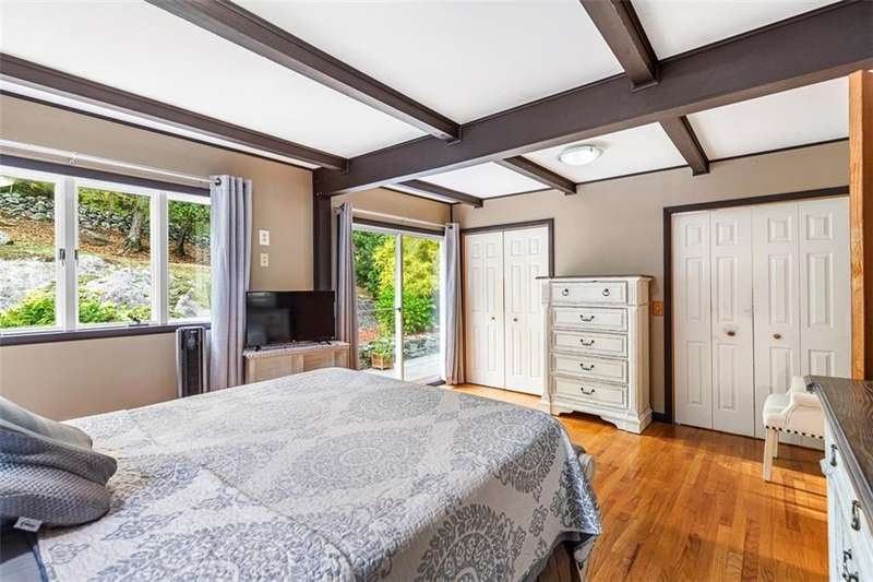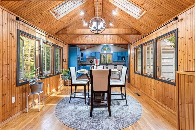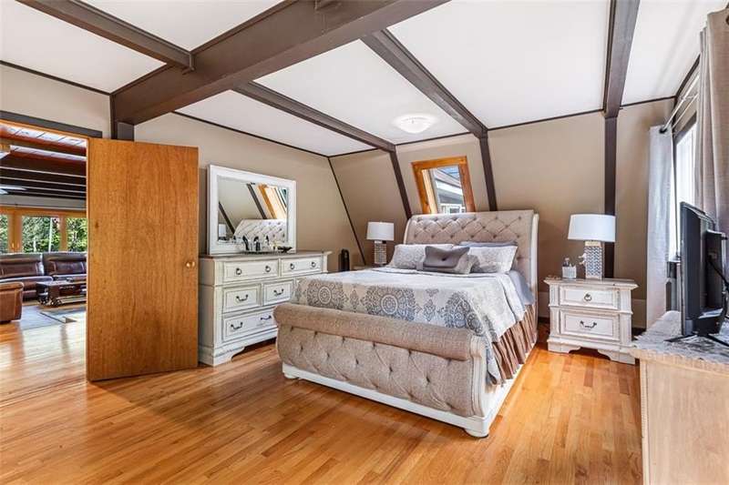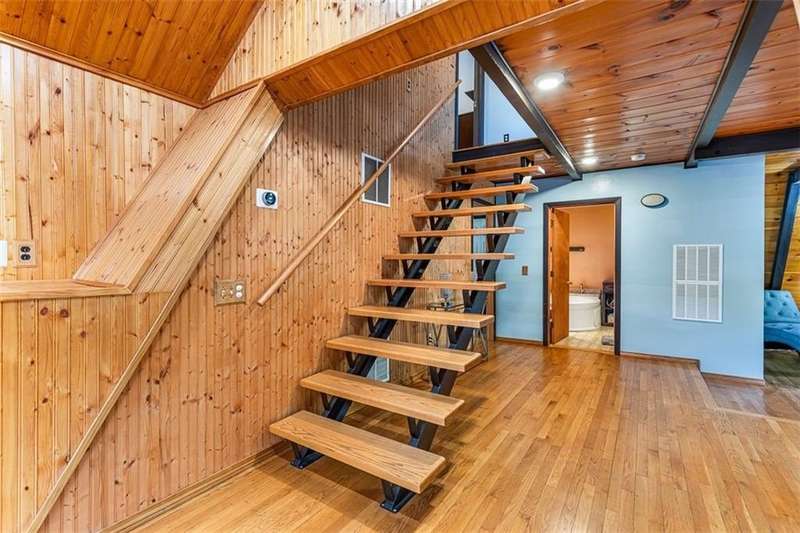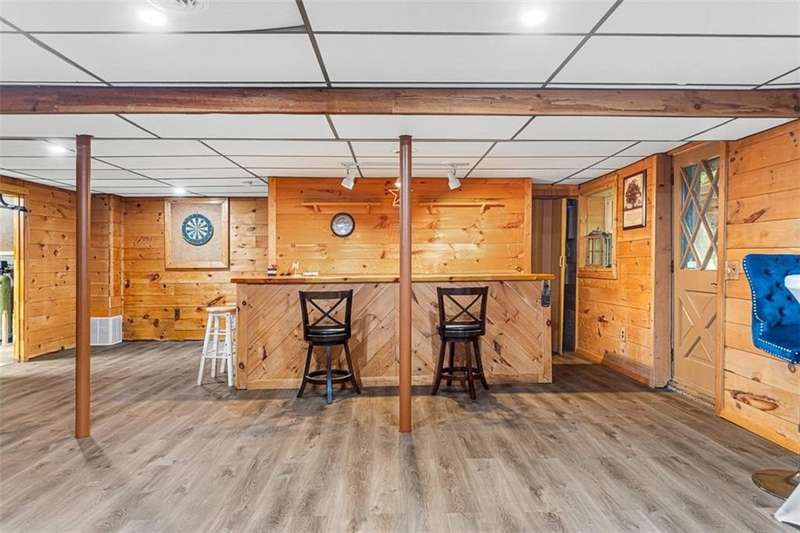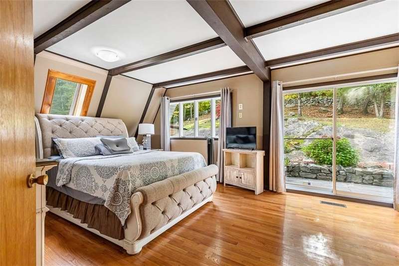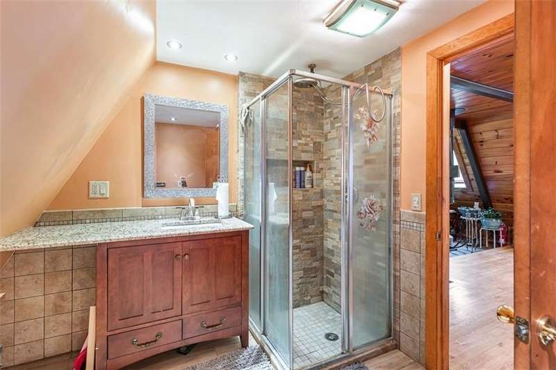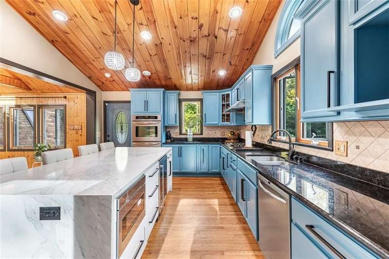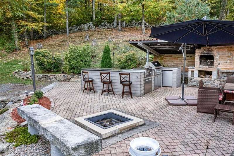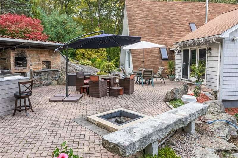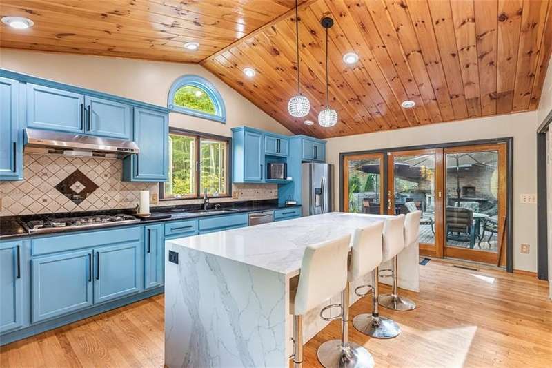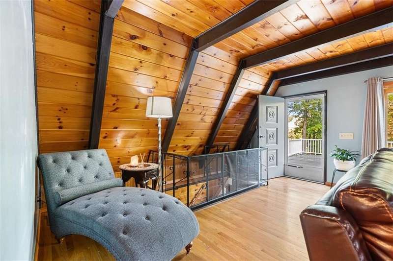 THE outdoorsy entertainer's retreat has hit the market. A charming and secluded haven - this woodsy contemporary home has everything you need for stellar backyard gatherings day or night. Just under an acre with a picturesque landscape, paved patio, outdoor grilling island with beverage cooler and two grills along with a brick oven - the outdoor area is impressive. The list goes on: sweet pergola, built in fire pit, outdoor storage port/container, chicken coop, sprinkler system, ample parking and more. Immersive wooded privacy and stunning natural ledge features are a feast for the eyes. Inside, this swanky extended 3 bed 2.1 bath A-Frame graces us with pine walls, hardwood floors, cathedral ceilings, skylights and multiple outdoor experiential access points to patios and balconies. Each bedroom flaunts a patio or balcony, as does the living room and kitchen. Cozy up by the wood stove in the living room. Enjoy a soak in the relaxing bathroom jet tub. A ravishing and bold kitchen checks all the boxes. Stainless steel appliances, beverage cooler, oversized island with a quartz waterfall countertop - indoor entertaining is fabulous, too! Additional boastful amenities include central air, finished basement with bar, 3 car garage, and newer Generac generator to cover the essentials. Didn't think your wishlist could be met? Welcome to the ultimate wishlist home of the season.