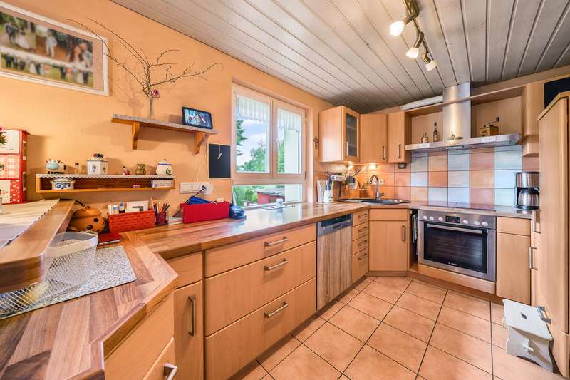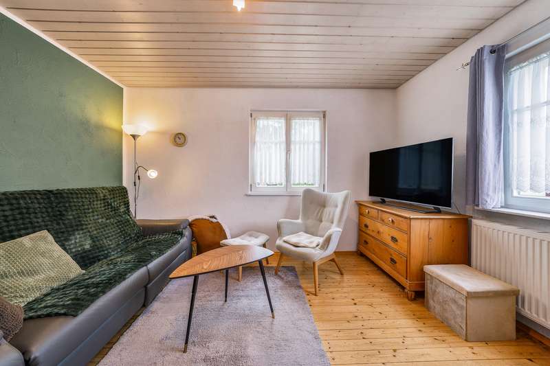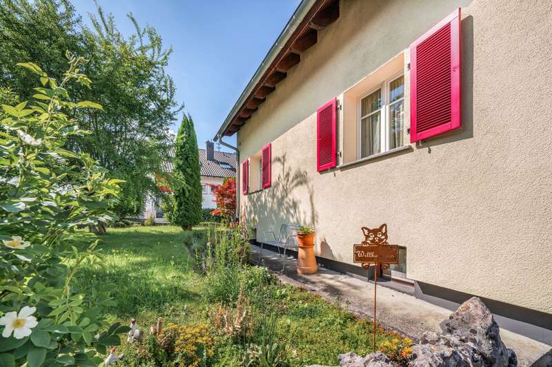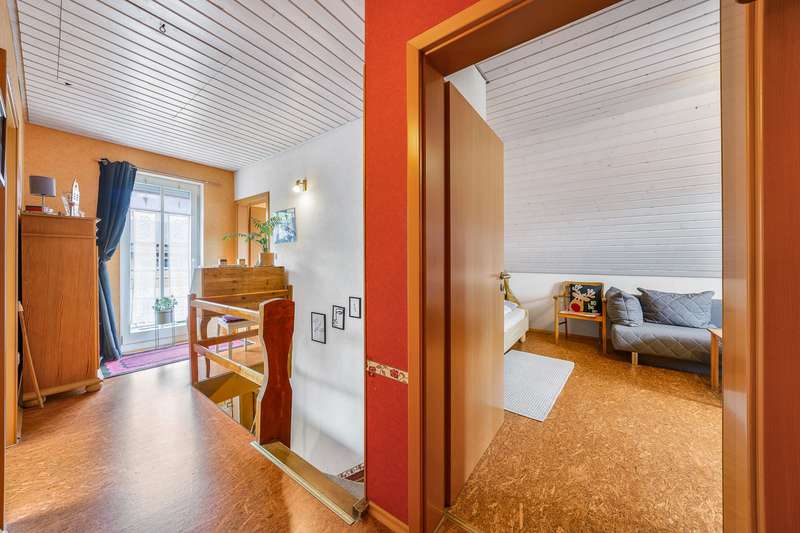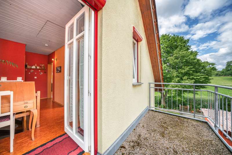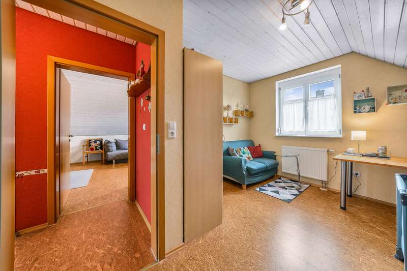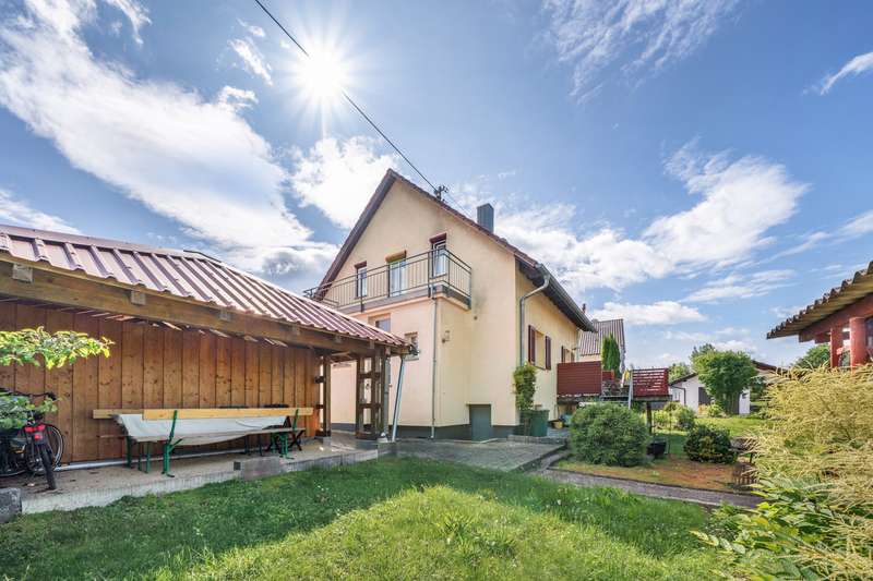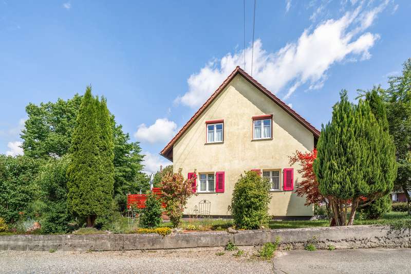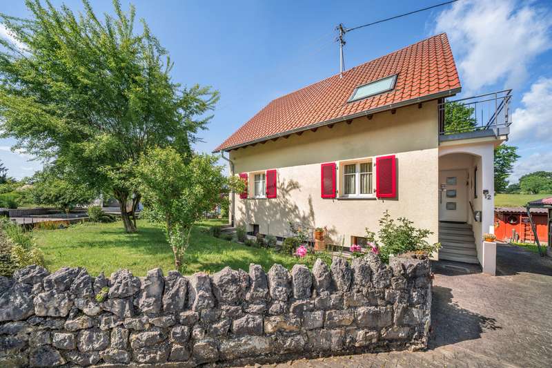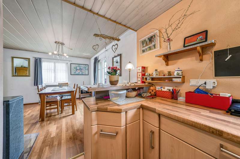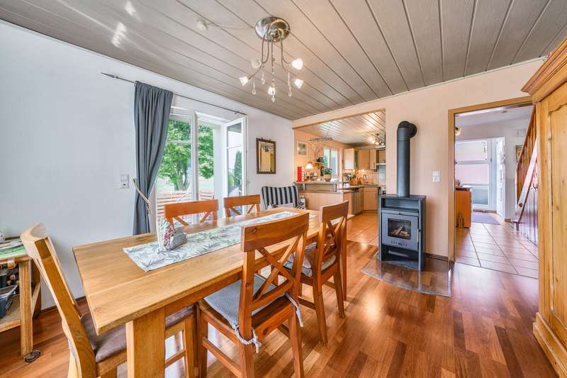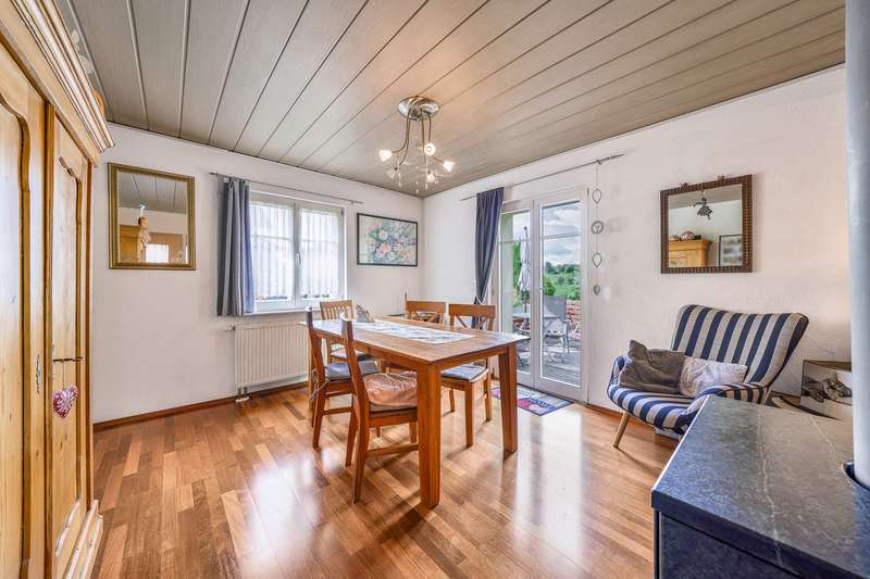 It is our pleasure to be able to offer you this well-kept, cozy, approximately 100 square meter detached house for sale, which was originally built in 1952 in solid construction on a spacious plot of approximately 755 square meters on the outskirts of the village. The top floor of the property was completely demolished in 2005, a new top floor in timber frame construction was added and the remaining substance was completely renovated. The property is now a mixed construction. Due to the key data of the property, it could be particularly suitable for young families, animal lovers and hobby gardeners. The property's living space of around 100 square meters is spread over six rooms on the first floor and the top floor. A dining room, a living room, three bedrooms and an office. These are complemented by a kitchen, a bathroom and a guest WC. Upon entering the house, a hallway, which also contains the staircase of the property, leads to the kitchen, the dining room, one of the bedrooms and the guest WC. From the dining room with its cozy fireplace, you can access both the kitchen and the living room as well as a terrace in the garden. The staircase in the hallway leads to the top floor, where another hallway connects all the rooms here. It provides access to two further bedrooms, an office and the house's bathroom, which features a shower, a bathtub, a washbasin, a WC and a large skylight for natural light. The hallway also provides access to a balcony and the attic via a hatch in the ceiling. The basement can also be accessed via the staircase. There are four rooms here, which give the house an additional 56 square meters of usable space. This includes an old bathroom equipped with a bathtub and washbasin, which is currently used as a laundry room. The garden can also be accessed via the basement. This offers plenty of space for a variety of activities with the family, pets or for relaxing gardening work and projects and even provides access to the adjacent small course of the Heudorf stream. There is also a double carport and a gazebo on the property, which offers the opportunity to sit under cover and enjoy the garden regardless of the weather. In 2005, all water and sewage pipes, the entire electrical system, all windows and the heating system were replaced and the building was completely insulated as part of the core renovation. A solar system was also installed on the new roof, which is used to heat water. The solid building fabric and the modernizations already carried out in 2005 lay the foundation for long-term use and offer interested parties the opportunity to customize the rooms to their own taste without having to invest time or money in energy-related or other renovations. Interested parties are invited to arrange a viewing appointment to gain a personal impression of this property and discover the possibilities and special features of the property at first hand. If you are interested, we will be happy to provide you with further information, arrange a viewing appointment and answer any questions you may have.