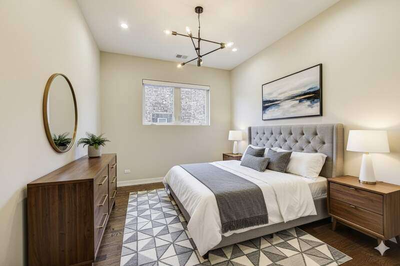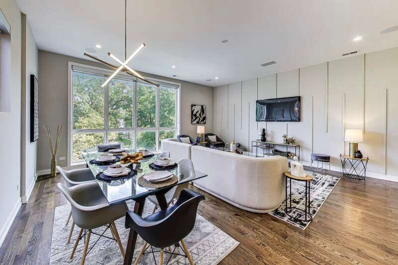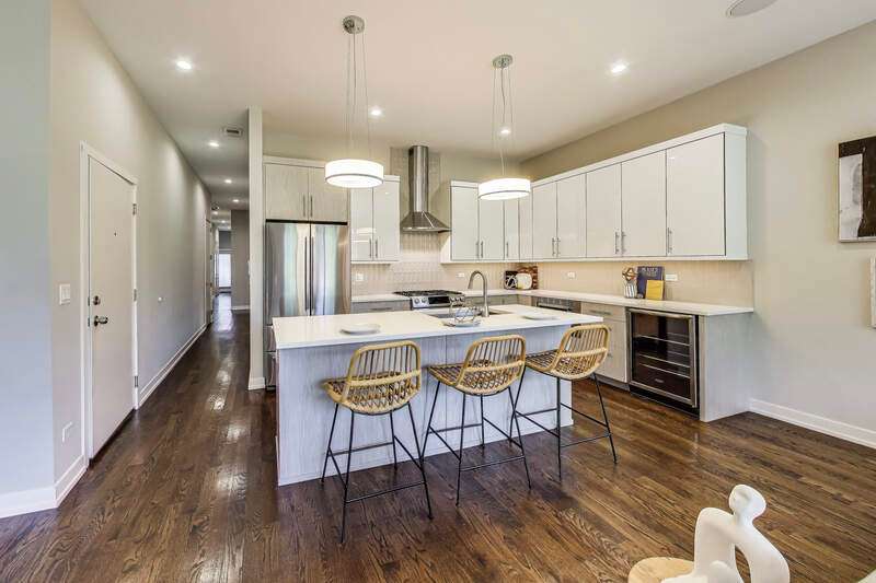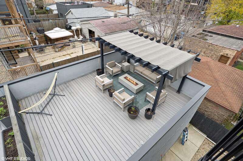 Incredible extra wide 3BR/2BA condo in Logan Square with a massive 450 square foot private garage rooftop deck. This newer construction home, built in 2018, features 21-ft wide interior, 10-ft ceilings and over-sized windows to give a very bright & airy feel overlooking the treetops. The fantastic open kitchen with large island boasts two toned custom cabinets, quartz countertops, stainless steel appliances by Bosch including a beverage cooler & a direct exhaust hood, undermount lighting, and a designer tile backsplash. The giant living & dining room combo with an accent wall, includes integrated 5.1 surround sound. The luxurious primary bedroom can easily accommodate a king-sized bedroom set and includes another accent wall and a walk-in closet. The magnificent primary bathroom has a walk-in rain shower with steamer, double quartz vanities and a heated floor. Both the 2nd & 3rd bedrooms are generously sized that can fit queen-sized bedroom sets easily and are perfect for a nusery/guest room/office. The secondary bathroom is nicely finished with a deep soaking tub & designer tile work. This homes has great storage with organized closets throughout, a large coat closet, pantry closet, and laundry closet with a side-by-side washer & dryer. The TWO outdoor spaces includes a large back terrace with a gas line for a grill. The amazing garage rooftop deck is upgraded with composite decking and an aluminum pergola for ultra low maintenance. The outdoor furniture and garage parking are included! Phenomenal location that's steps to The 606, Palmer Square, some of the city's best dining/coffee/cocktails, shops, and nightlife.