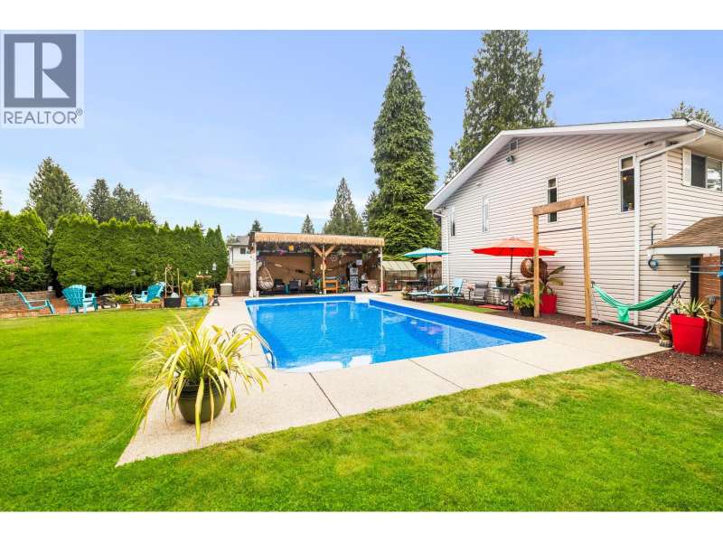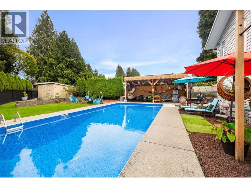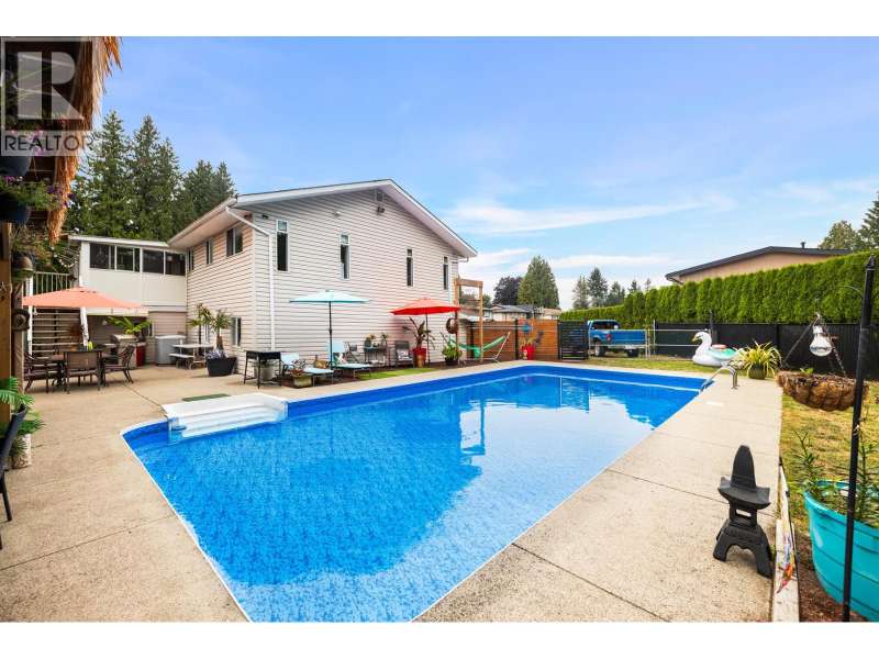 Welcome to your private oasis in West Maple Ridge! Sitting on a spacious ¼ acre lot, this one-of-a-kind property offers the ultimate in outdoor living with a stunning 38x18 heated in-ground pool featuring a new sand filter and liner. Entertain year-round under a massive custom tiki hut, gather around the fire pit, or relax in the sunroom-perfect as a gym, office, or art studio. The completely private yard also boasts an outdoor patio, 12x12 shed, large pool house, garden shed, and ample RV/boat parking with 50-amp service. Inside, enjoy central A/C, granite countertops, built-in security cameras, all-new PVC plumbing, a newer hot water tank, and a luxurious spa-inspired ensuite with a two-person shower (wall jets, rain shower, handheld) and jacuzzi tub. This home is easily suitable. (id:58403)