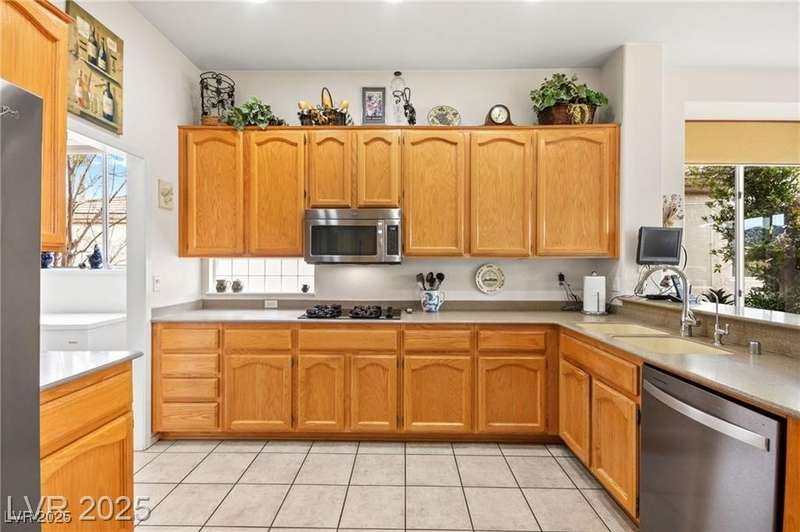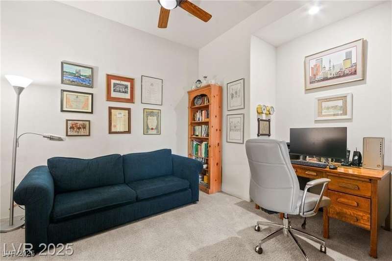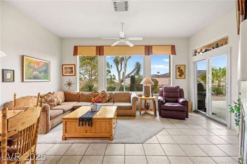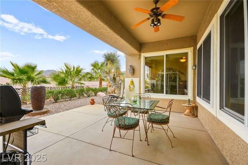 This charming 2-bedroom, 2-bathroom home in Sun City MacDonald Ranch offers a spacious, light-filled layout with character and style. The open floorplan features high ceilings, elegant coffered details, and east-facing windows with stunning mountain views. Immaculately maintained with neutral tones, the home is both inviting and functional. A versatile den with double doors can serve as an office, media room, or guest bedroom. The private backyard includes a covered patio, perfect for enjoying sunrise views over the mountains, along with low-maintenance desert landscaping. The kitchen boasts granite countertops, tile flooring, a breakfast bar, and updated appliances. The garage offers additional storage with built-in cabinetry. Community amenities include a clubhouse, golf course, pool/spa, exercise room, pickleball court, recreation room, social calendar, and tennis courts—everything you need for both relaxation and recreation.