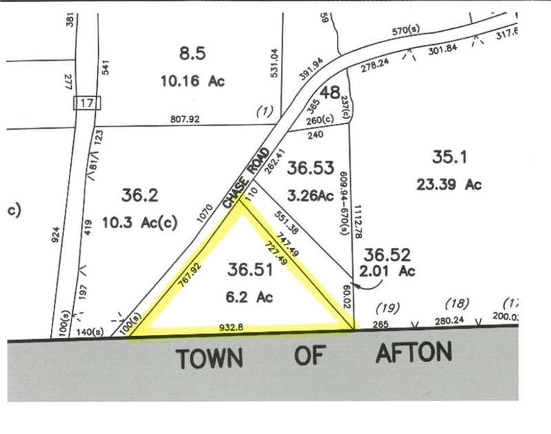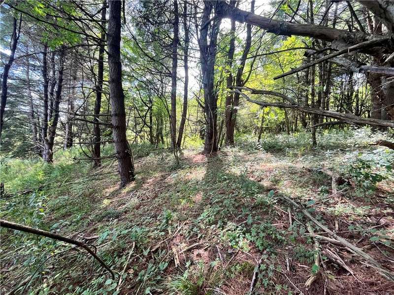 Triangle shaped lot with 767' of road frontage. The land is sloped down from the road, in some spots steeper than others. There are a couple of areas that would be suited for a driveway and with a bit of land clearing, a nice spot to put a cabin, have a travel camper set up, or make it into your dream homesite. Kelsey Creek runs along the back, on and off the property. It's a private setting but still just a few miles from the Village of Afton.