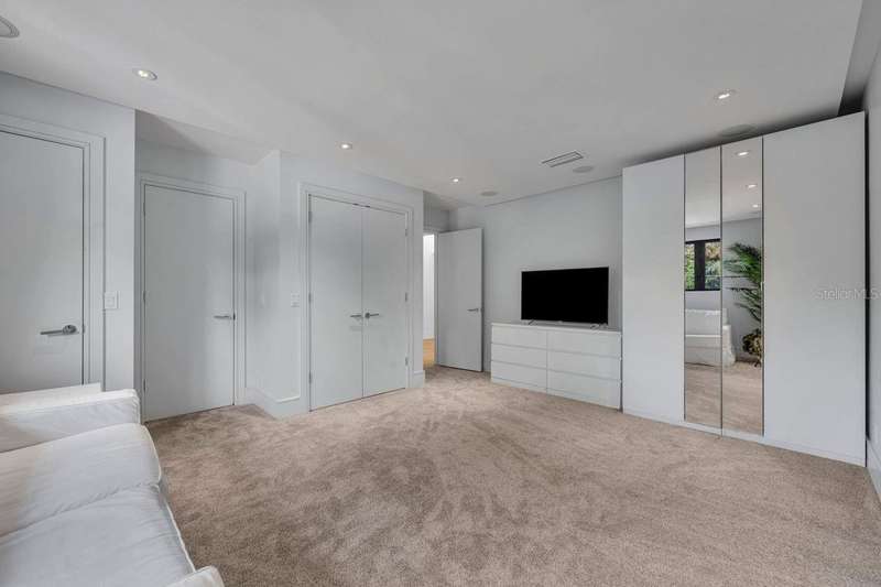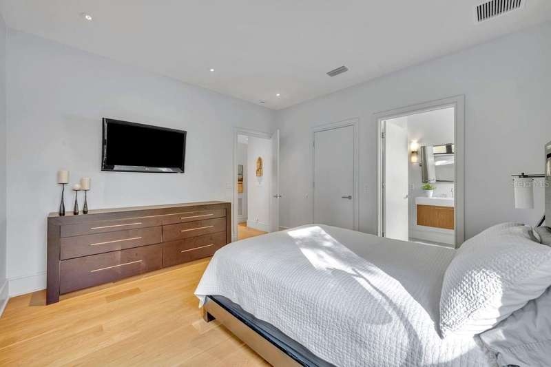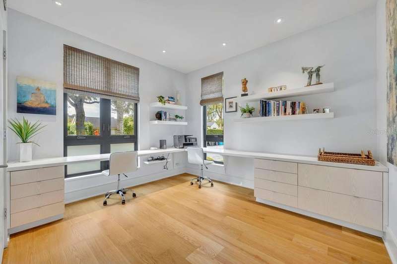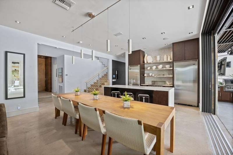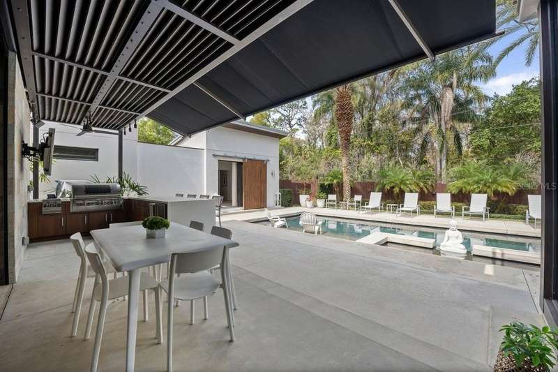 This contemporary five-bedroom, three-and-a-half-bath home with a detached 384 SF casita in desirable Beverly Shores/Rose Isle showcases designer-inspired finishes and a resort-style pool retreat. Custom-built with a modern aesthetic and open floor plan, it features a gourmet kitchen with an island, breakfast bar, stainless steel appliances including a Viking refrigerator and separate freezer, espresso cabinetry, and Caesarstone countertops. The open dining area flows seamlessly into the spacious great room, highlighted by polished concrete floors, a custom-built media center, a wine room, bedroom with en-suite bath, and aan office with wrap around desk. Twelve-foot retractable sliding glass doors fill the main living area with natural light and open to spectacular views of the heated saltwater pool and spa. Upstairs, the primary suite offers a serene retreat with a custom-designed walk-in closet, Caesarstone dual vanities, soaking tub, separate shower, and a private balcony overlooking the pool and Mead Gardens. Two additional bedrooms share a Jack-and-Jill bath, while another flexible space serves perfectly as a media room, gym, or nursery. A secondary washer and dryer upstairs add convenience. The outdoor living area is an entertainer’s dream, complete with a summer kitchen, bar area, gas grill, and retractable awning. Guests will love the detached guest house with its private entrance and pool views. The garage provides flexibility, accommodating either two or four cars. Ideally located near both Orlando and Winter Park, and just steps from scenic Mead Gardens, this home offers luxury living at its finest—a perfect blend of modern design, functionality, and resort-style comfort.