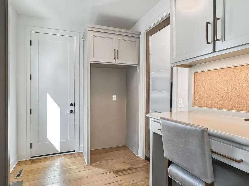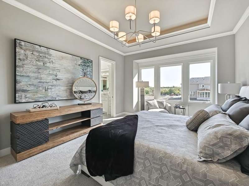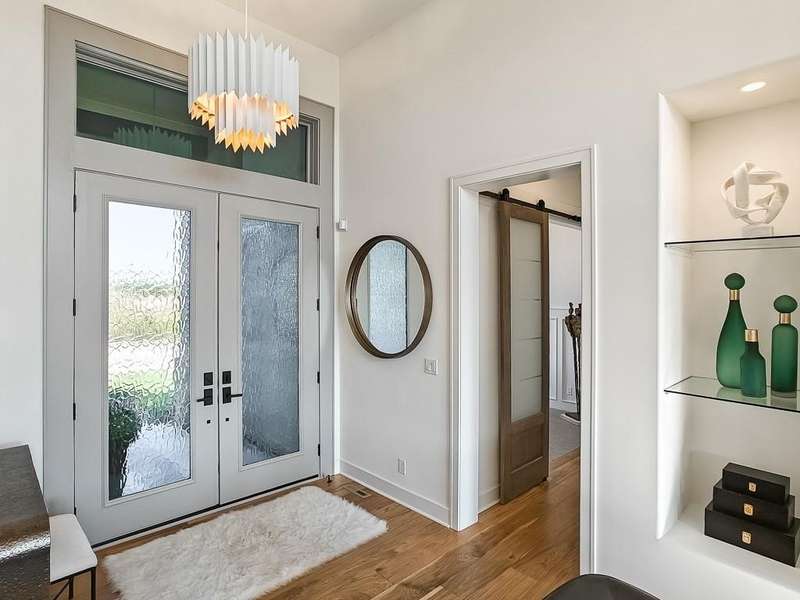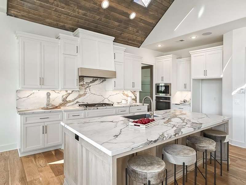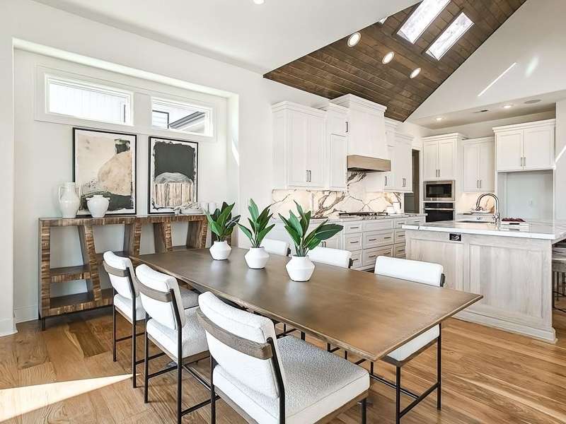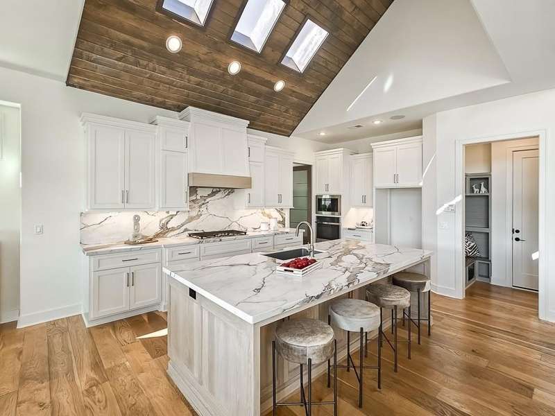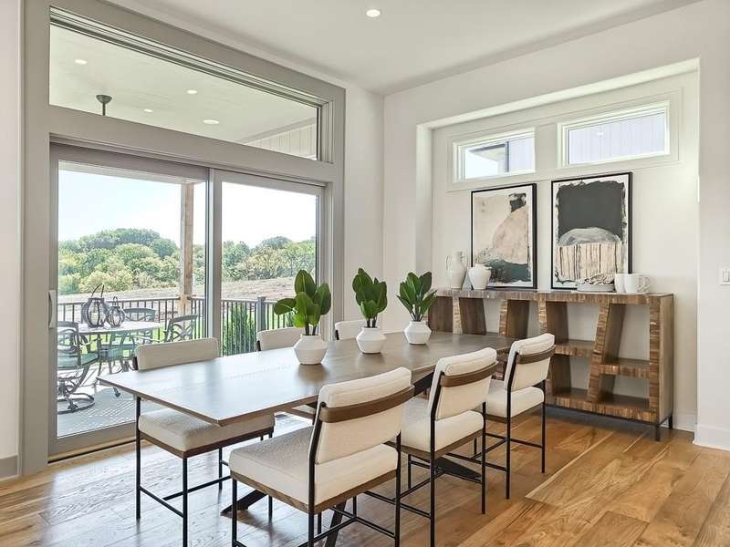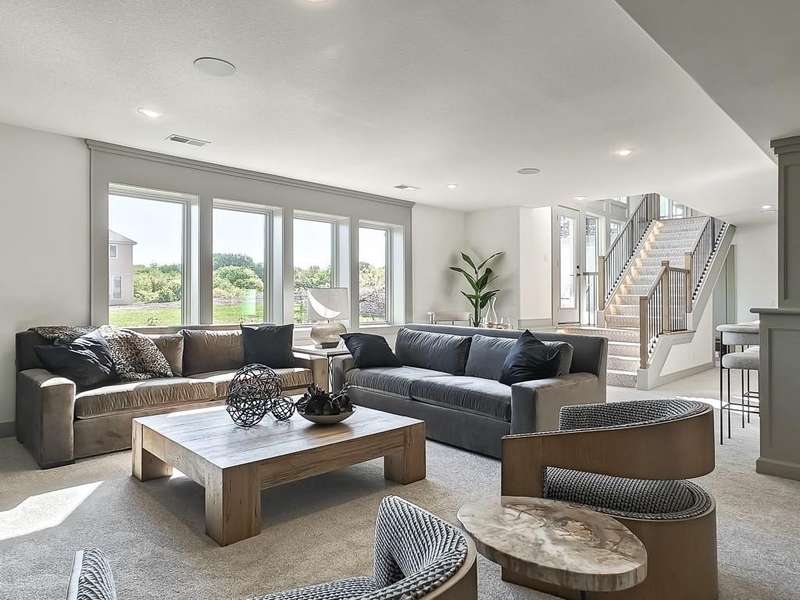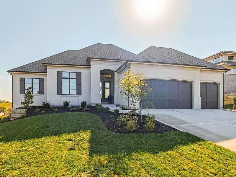 Welcome to the gold award-winning Brookridge IV by the esteemed Don Julian Builders. This reverse 1.5-story model in Bristol Highlands Estates blends luxury with livability. Enter through double doors into a dramatic foyer and great room with 2-story windows, vaulted wood-beamed ceiling, and a striking stone fireplace to impress from the moment you step inside. The kitchen shines with an oversized island, 5-burner gas cooktop, custom hood, vaulted ceiling with skylights, and a massive walk-in pantry with prep space and second fridge. Just off the dining area, step onto the covered deck—perfect for morning coffee or unwind in the evening with a view. The main-level primary suite offers a spa bath with dual vanities, soaking tub, tiled shower, and a walk-in closet that connects to the laundry. Two more bedrooms, a full bath, and a powder room for guests round out the main floor. Downstairs, the finished walkout basement is built for fun with a media wall, rec room, game space, spectacular bar, plus 2 more bedrooms with private bathrooms that walks out to a patio for another outdoor entertaining space. Nestled in the rolling hills of Shawnee, Bristol Highlands offers stunning views and a peaceful setting. Enjoy top-rated De Soto schools, shopping, dining, and outdoor recreation with nearby parks, trails, Shawnee Mission Park, and multiple golf courses. It’s the perfect balance of convenience and natural beauty. THIS IS A MODEL - NOT FOR SALE on lot 13.