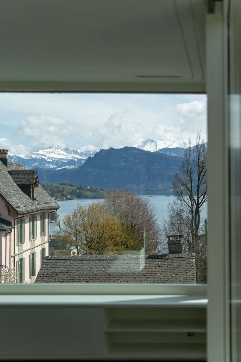 The floor-to-ceiling windows and spacious terrace open up a view of a world of vastness: Lake Lucerne glitters in the sun, while behind it the imposing peaks of the Central Swiss Alps rise majestically. Whether it's sunrise over the lake or a glass of wine at sunset, this panorama enchants day after day.Translated with DeepL.com (free version)