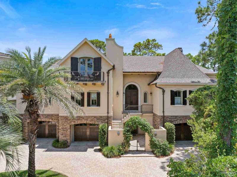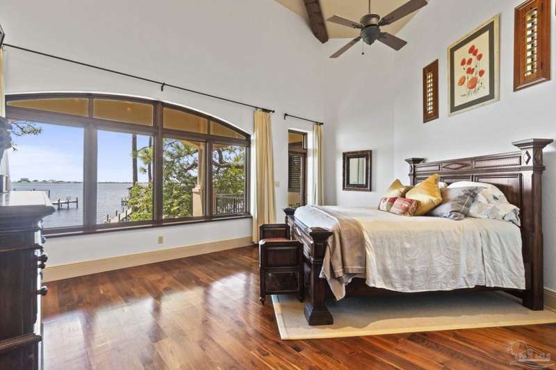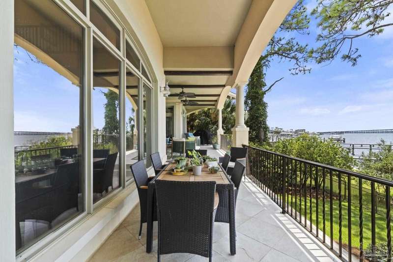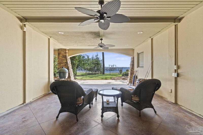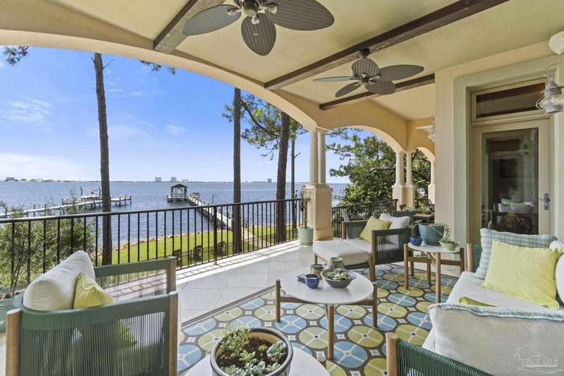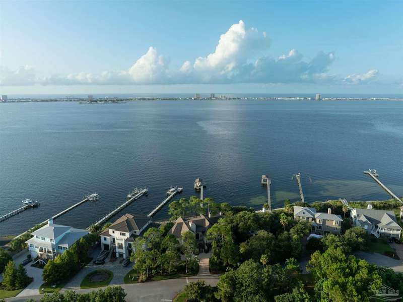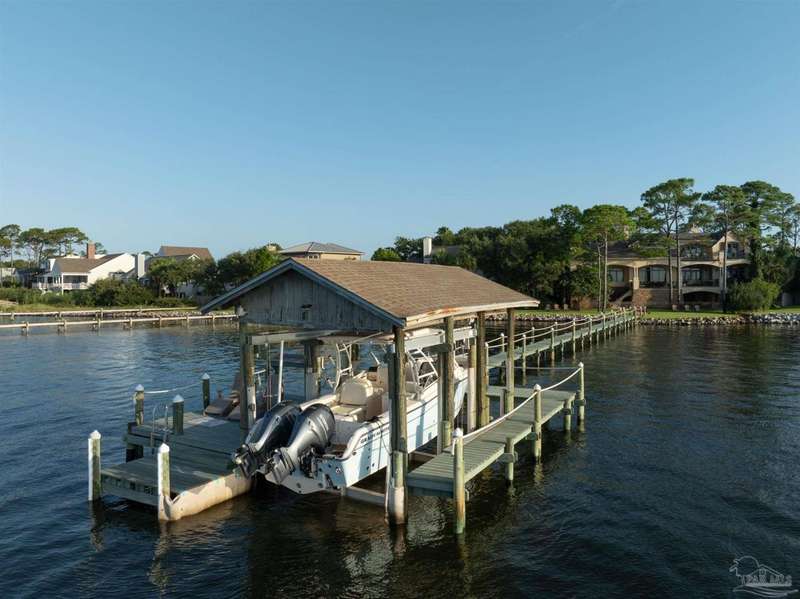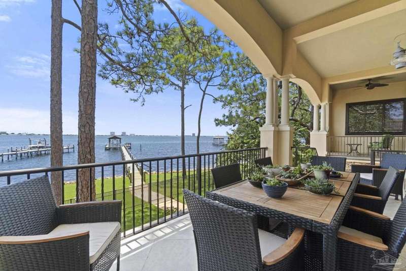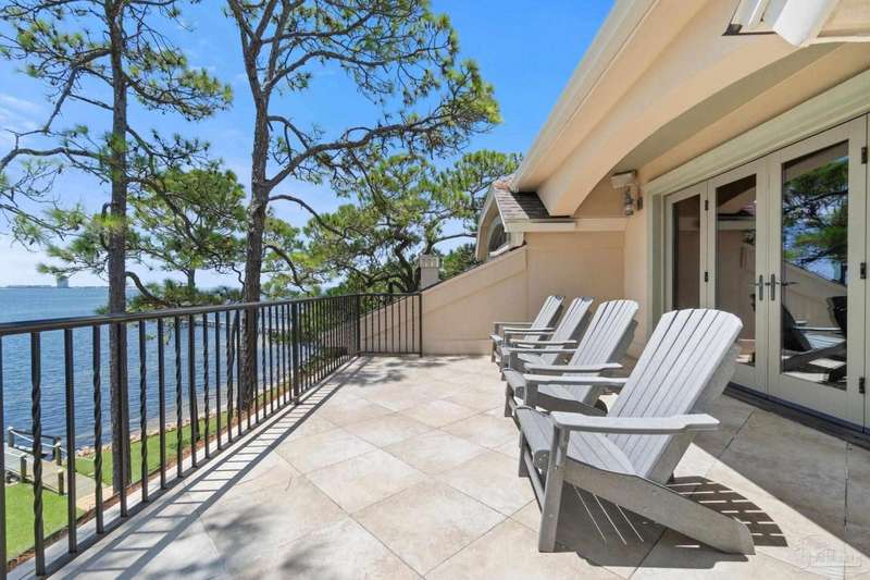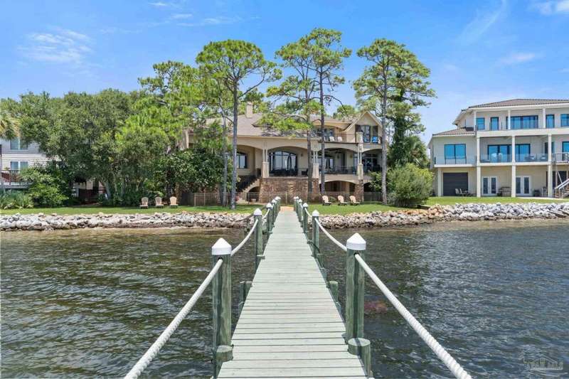 This elegant waterfront French Country home provides a panoramic view of Pensacola Sound and breathtaking sunrises and sunsets. From the courtyard and stacked stone/stucco facade to the end of the boat house and dock with boatlift, you will appreciate the construction and attention to detail. Dramatic travertine floors inlaid with a walnut accent extend into the hallway and kitchen. The 2 story vaulted living room ceiling and beams provide visual interest and large natural wood beams accent the ceilings in the entry, living room, dining area and master suite. The view of the Sound is enhanced by the windows, French doors and balconies facing south. Both the living and dining rooms enjoy the fireplace with custom stone surround, wall sconces, and custom cabinetry. The master bedroom with a 20' ceiling overlooks the water. The spacious master bath features a double vanity area, designer fixtures, built-in cabinetry, a spacious shower and a freestanding tub. The separate his and her closets are walk-in, one has a cedar closet and attic access for additional storage. The kitchen shows chef's level high end appliances and a large kitchen island provides abundant work space and bar style seating. The wet bar and ice maker add to easy entertaining. A small office space is perfect for a computer work station. Note the dramatic beauty of the library/office with 8' double entry doors from New Orleans and a dramatic coffered ceiling. The large laundry houses a second refrigerator. The elevator or the stairway lead upstairs to the bedrooms have walk-in closets and full baths. A private sitting area overlooks the living room, and could be converted into a 4th bedroom. The Geothermal A/C units, ICF construction and Icynene insulation keep this space (and the entire house) cool and quiet. Enjoy the huge 4 car garage! Fifty-four concrete pilings add stability and safety to the home.