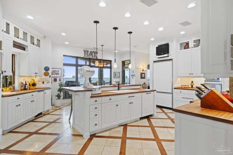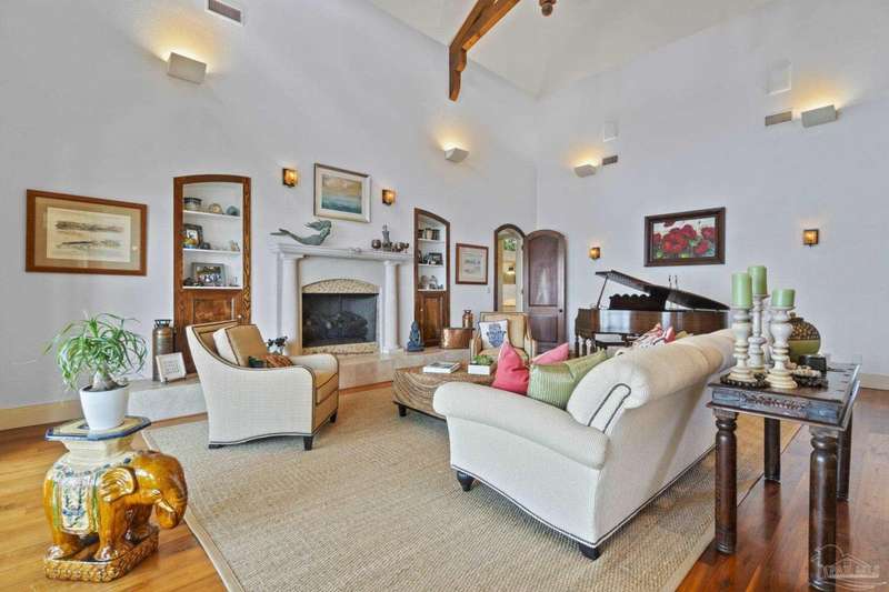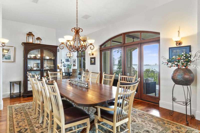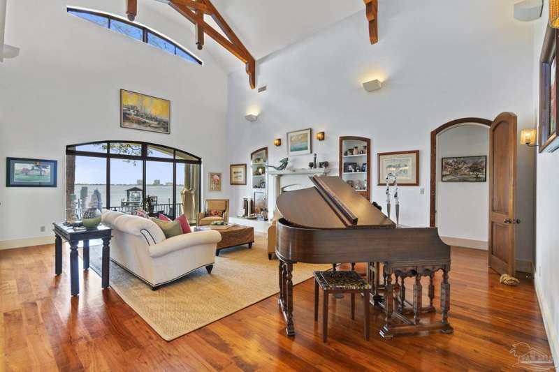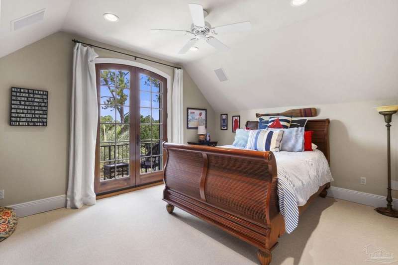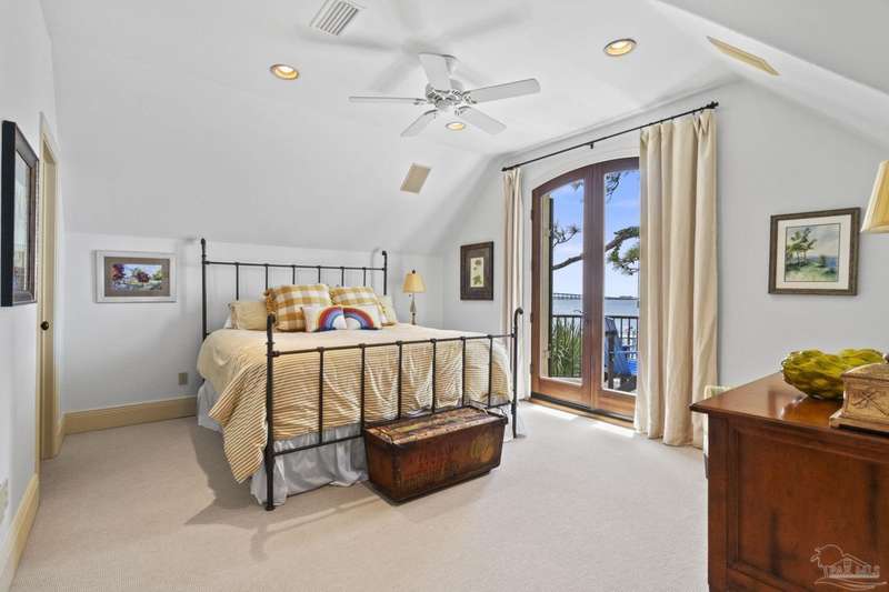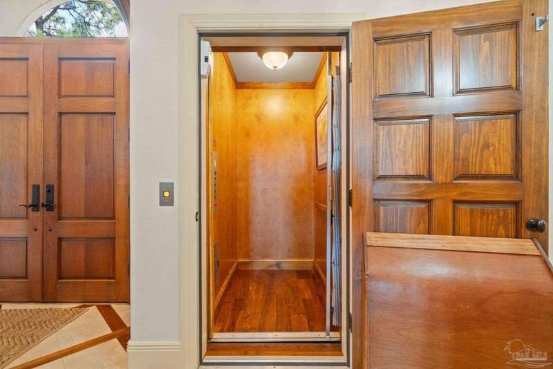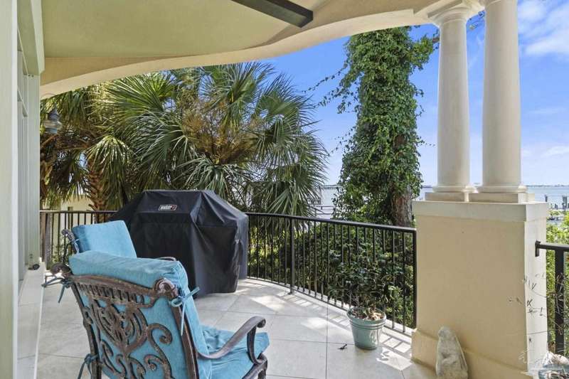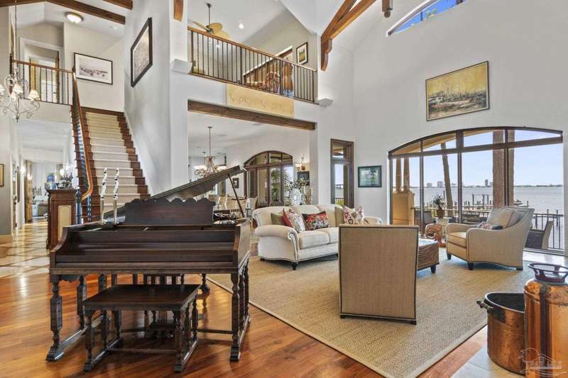 This elegant waterfront French Country home provides a panoramic view of Pensacola Sound and breathtaking sunrises and sunsets. From the courtyard and stacked stone/stucco facade to the end of the boat house and dock with boatlift, you will appreciate the construction and attention to detail. Dramatic travertine floors inlaid with a walnut accent extend into the hallway and kitchen. The 2 story vaulted living room ceiling and beams provide visual interest and large natural wood beams accent the ceilings in the entry, living room, dining area and master suite. The view of the Sound is enhanced by the windows, French doors and balconies facing south. Both the living and dining rooms enjoy the fireplace with custom stone surround, wall sconces, and custom cabinetry. The master bedroom with a 20' ceiling overlooks the water. The spacious master bath features a double vanity area, designer fixtures, built-in cabinetry, a spacious shower and a freestanding tub. The separate his and her closets are walk-in, one has a cedar closet and attic access for additional storage. The kitchen shows chef's level high end appliances and a large kitchen island provides abundant work space and bar style seating. The wet bar and ice maker add to easy entertaining. A small office space is perfect for a computer work station. Note the dramatic beauty of the library/office with 8' double entry doors from New Orleans and a dramatic coffered ceiling. The large laundry houses a second refrigerator. The elevator or the stairway lead upstairs to the bedrooms have walk-in closets and full baths. A private sitting area overlooks the living room, and could be converted into a 4th bedroom. The Geothermal A/C units, ICF construction and Icynene insulation keep this space (and the entire house) cool and quiet. Enjoy the huge 4 car garage! Fifty-four concrete pilings add stability and safety to the home.