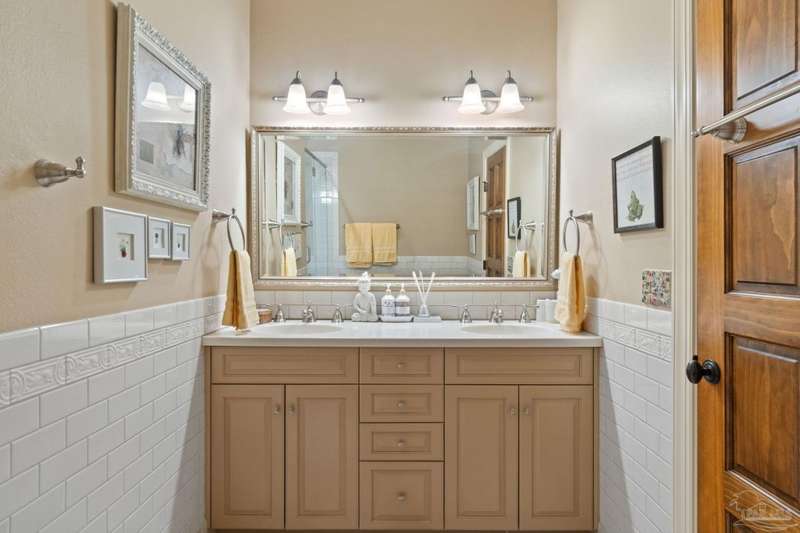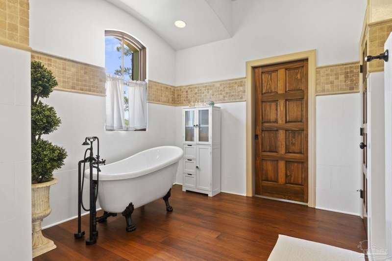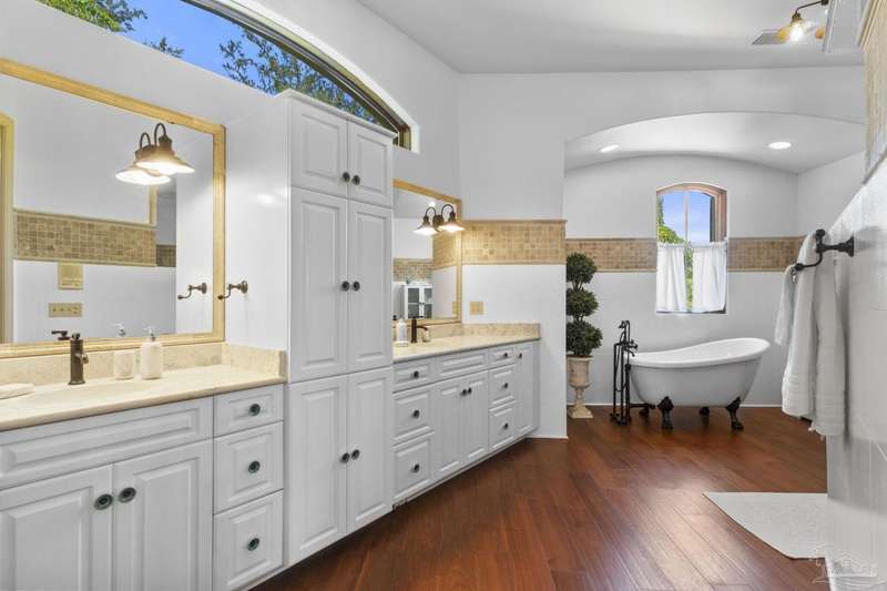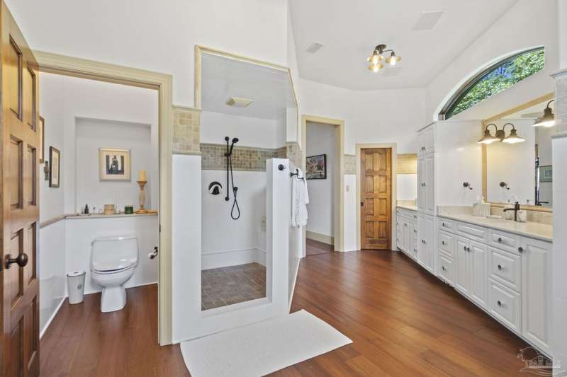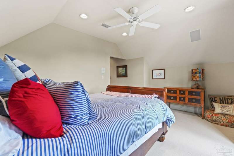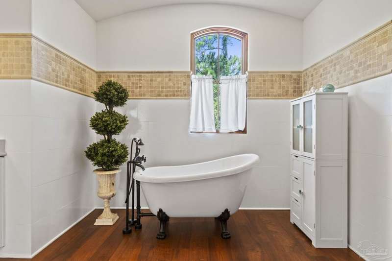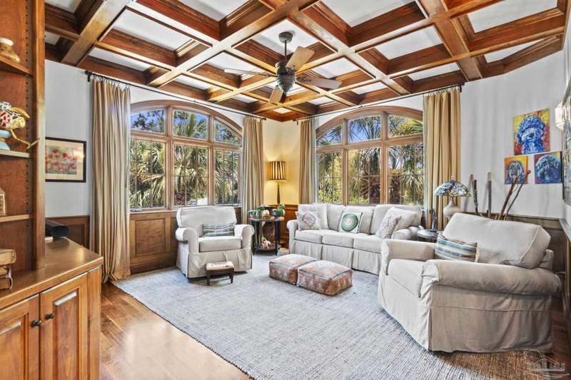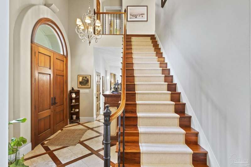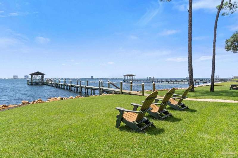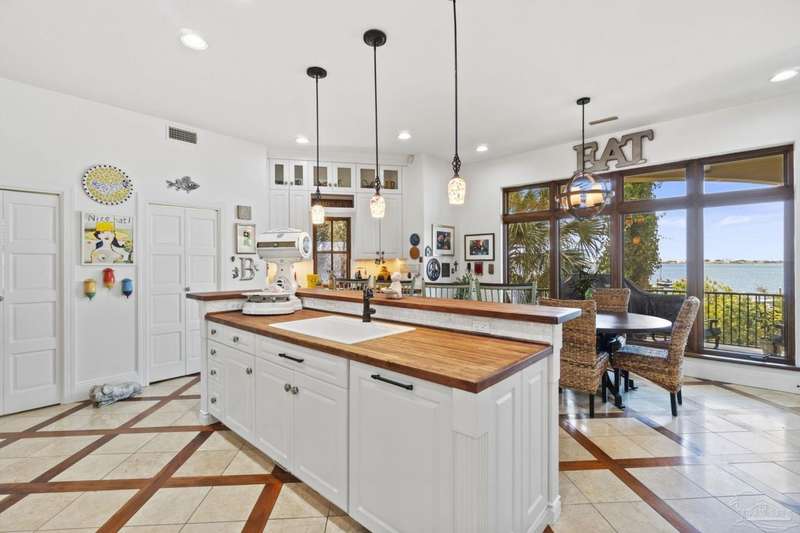 This elegant waterfront French Country home provides a panoramic view of Pensacola Sound and breathtaking sunrises and sunsets. From the courtyard and stacked stone/stucco facade to the end of the boat house and dock with boatlift, you will appreciate the construction and attention to detail. Dramatic travertine floors inlaid with a walnut accent extend into the hallway and kitchen. The 2 story vaulted living room ceiling and beams provide visual interest and large natural wood beams accent the ceilings in the entry, living room, dining area and master suite. The view of the Sound is enhanced by the windows, French doors and balconies facing south. Both the living and dining rooms enjoy the fireplace with custom stone surround, wall sconces, and custom cabinetry. The master bedroom with a 20' ceiling overlooks the water. The spacious master bath features a double vanity area, designer fixtures, built-in cabinetry, a spacious shower and a freestanding tub. The separate his and her closets are walk-in, one has a cedar closet and attic access for additional storage. The kitchen shows chef's level high end appliances and a large kitchen island provides abundant work space and bar style seating. The wet bar and ice maker add to easy entertaining. A small office space is perfect for a computer work station. Note the dramatic beauty of the library/office with 8' double entry doors from New Orleans and a dramatic coffered ceiling. The large laundry houses a second refrigerator. The elevator or the stairway lead upstairs to the bedrooms have walk-in closets and full baths. A private sitting area overlooks the living room, and could be converted into a 4th bedroom. The Geothermal A/C units, ICF construction and Icynene insulation keep this space (and the entire house) cool and quiet. Enjoy the huge 4 car garage! Fifty-four concrete pilings add stability and safety to the home.