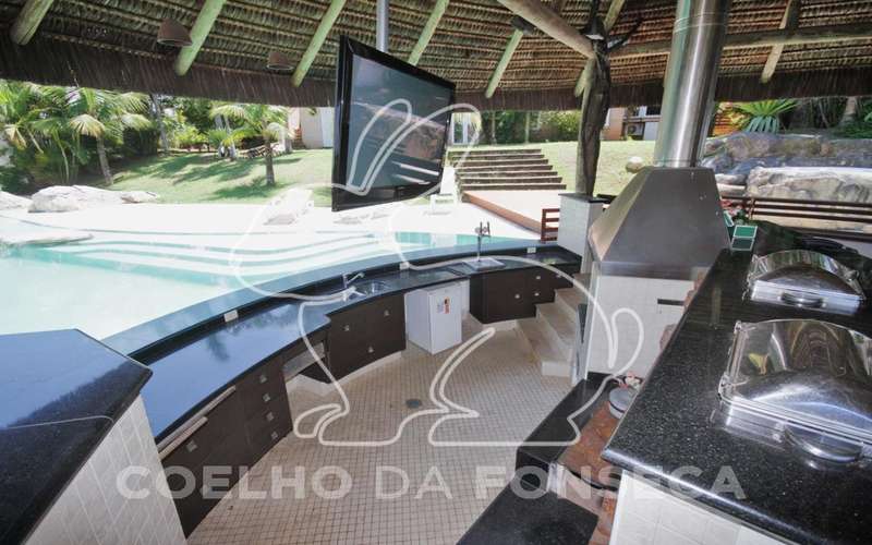 É uma casa, é um sítio e é um resort também, com sauna, vestiários M&F, sala de fitness com 2 enormes visores redondos que dão para o fundo do bar da piscina, área pronta para quadra de beach tenis/vôlei de areia ou society, piscina estilo lagoa de 180 mil litros, (aquecida por 2 trocadores de calor), com ponte, cachoeira de 4 águas e caverna. Um espaço para play-ground e um amplo quiosque gourmet com lugar para sentar mais de 50 pessoas, cozinha gourmet rebaixada com forno&fogão à lenha, churrasqueira, chopeira naja de 2 bicos e