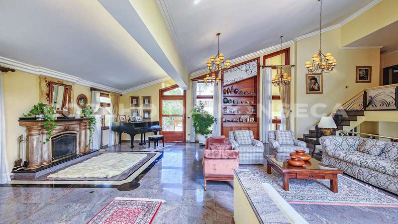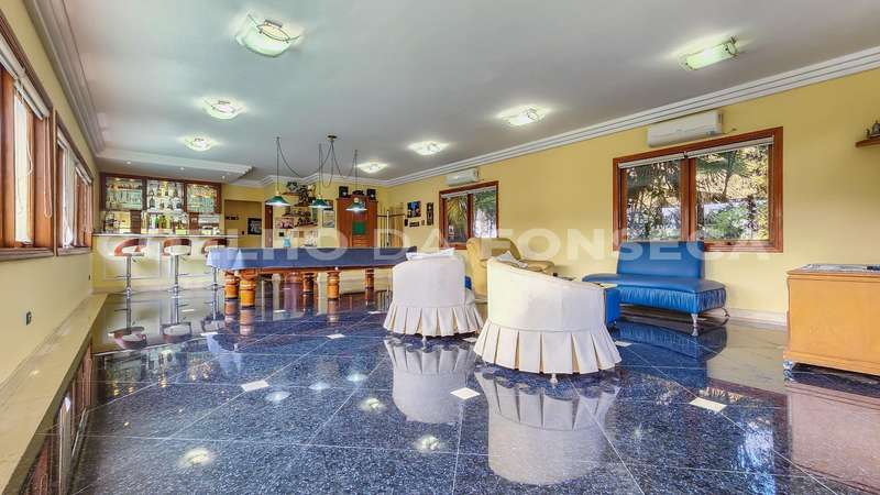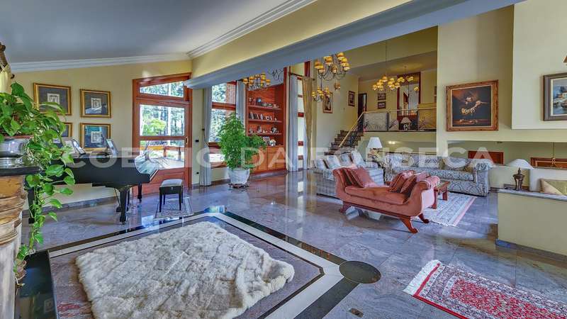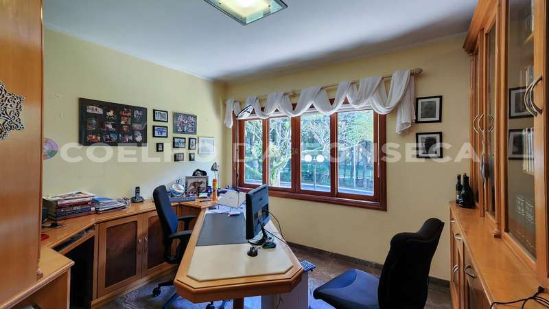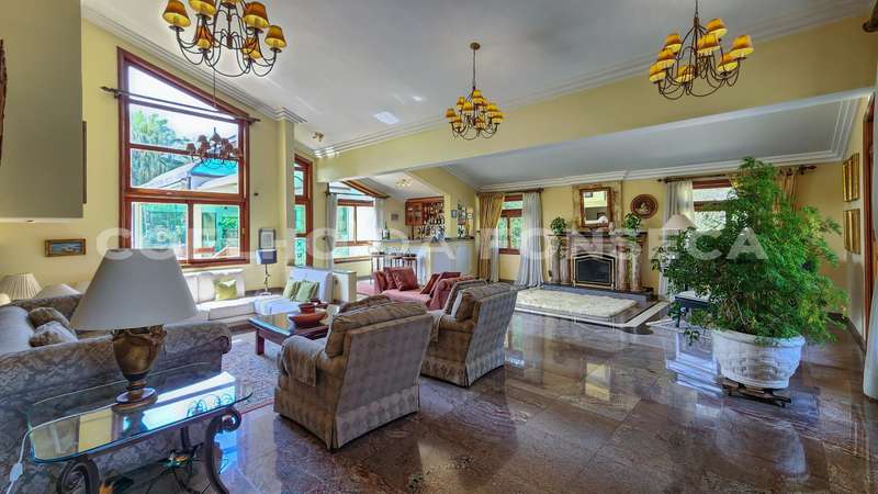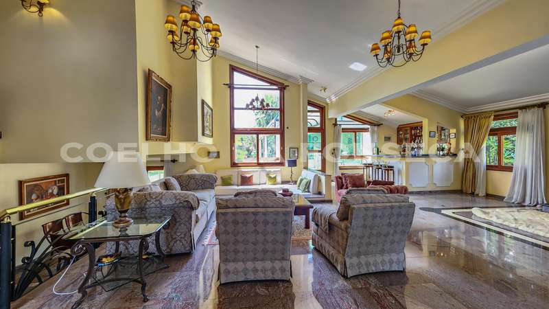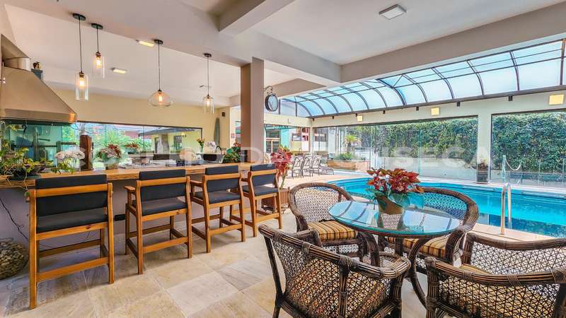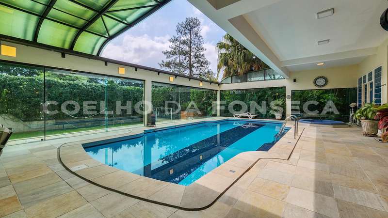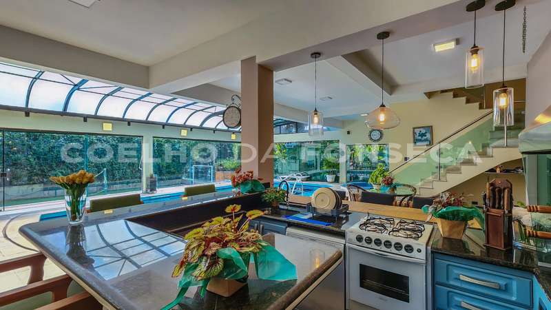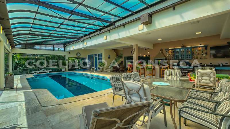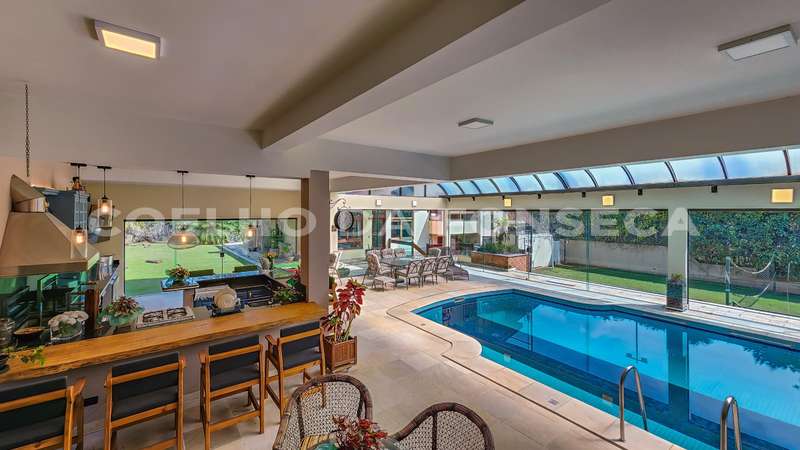 Residência de esquina com amplos espaços, incluindo escritório, lavabo, living para 4 ambientes, sala principal com pé direito duplo, lareira integrada a área interna e externa com belíssimo jardim. Conta com 4 suítes, além de dois quartos extras para hóspedes. Entretenimento de alto nível com um espaçoso home theater e salão de jogos. Área externa com gourmet, piscina climatizada com sistema retrátil, podendo ser coberta ou ao ar livre, além de campo de futebol. Estacionamento coberto para 3 carros. Copa e cozinha ampla com armários planejados. Agende sua visita agora mesmo.