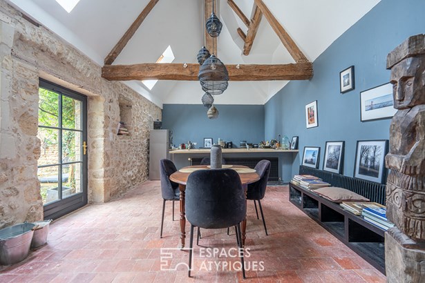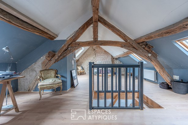 The ground floor reveals a layout designed for comfort and conviviality. Two living rooms follow one another: the first, with a stone fireplace, invites you to relax, while the second, decorated with a wood stove, opens onto the dining area and the kitchen. The latter, bright and functional, extends the warm atmosphere of the place while offering direct access to a paved, intimate and tree-lined courtyard. Perfectly suited to moments of sharing, this configuration combines charm and practicality. A single-storey bedroom, accompanied by its private bathroom, completes this level. The upper floor houses two spacious bedrooms with remarkable ceiling height, where old parquet floors and period details create a unique atmosphere. An elegant bathroom completes this level. On the second floor, an attic room, bathed in light thanks to its openings, can easily be imagined as an artist's studio or office, meeting the aspirations of creative minds.