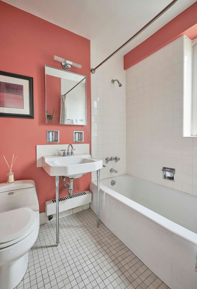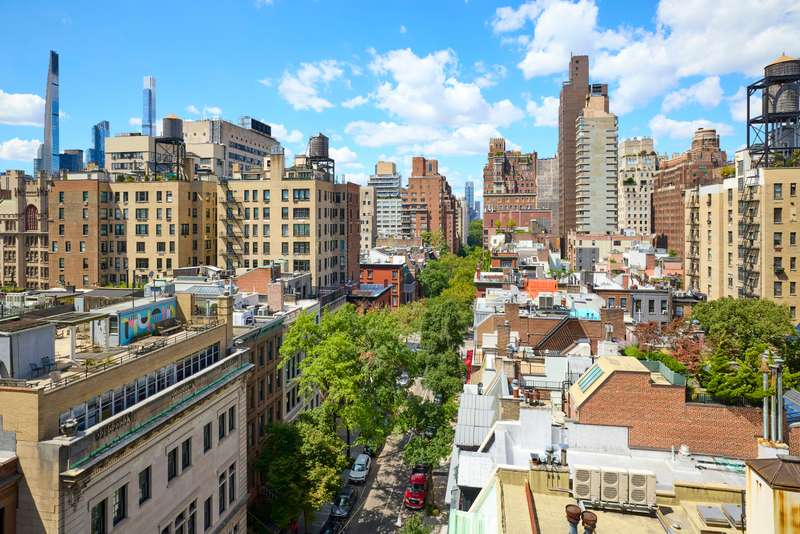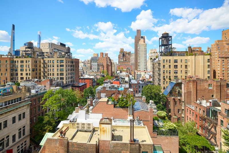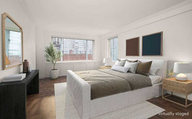 The primary bedroom and adjacent bedroom both feature double exposures (S&W and N&W, respectively) with en-suite windowed bathrooms. Both bedrooms have open views as the neighboring buildings are much lower.