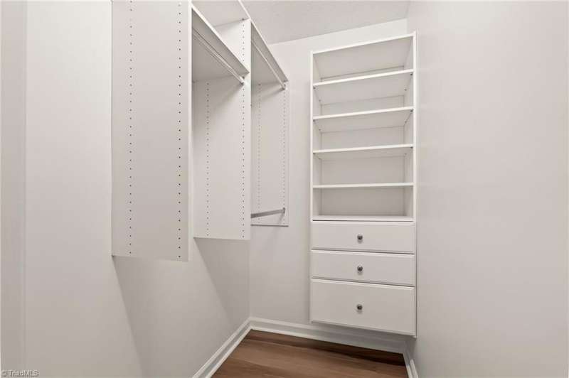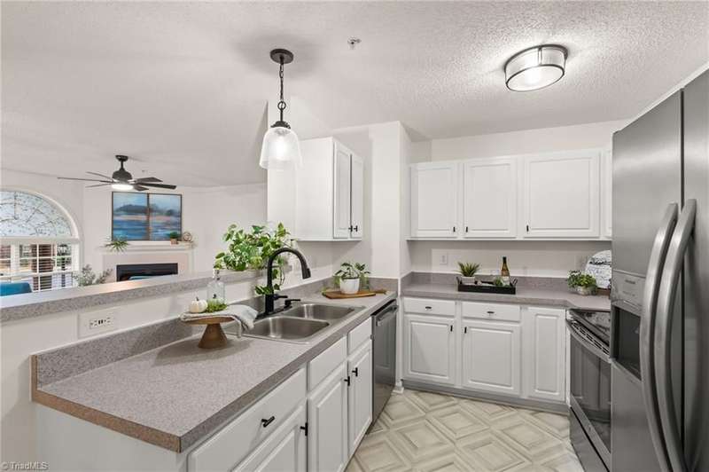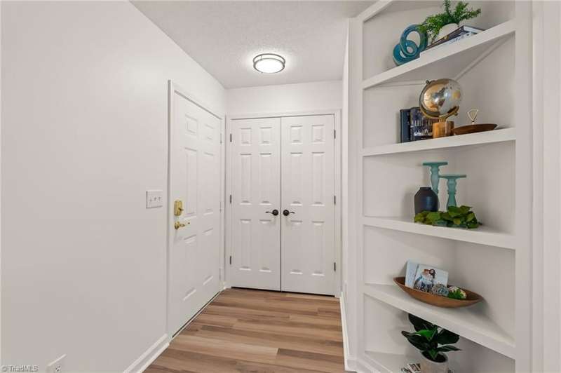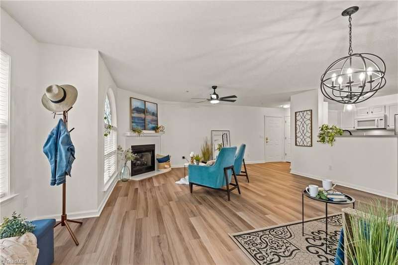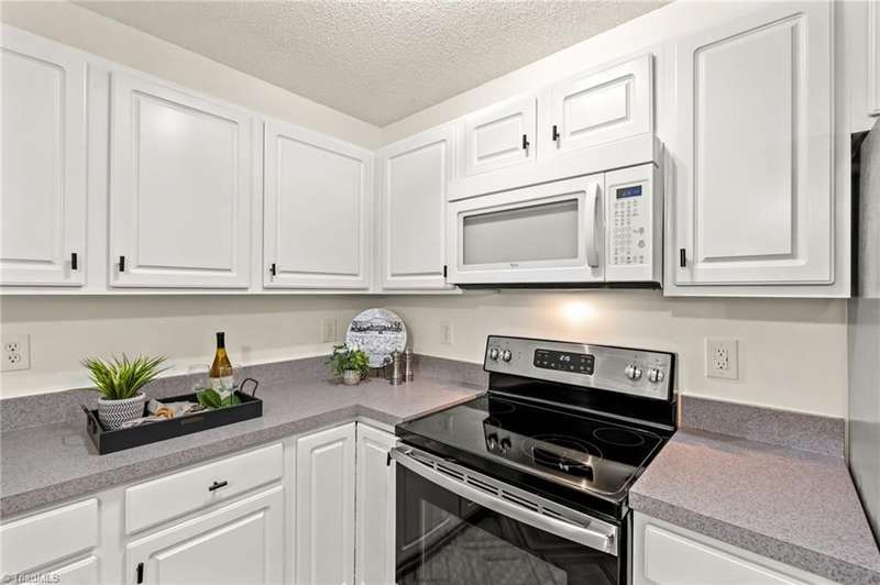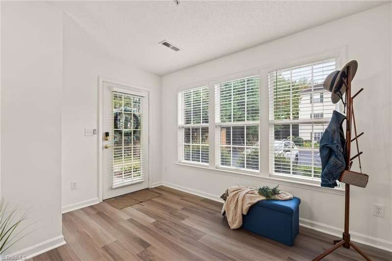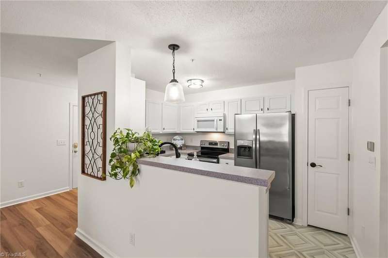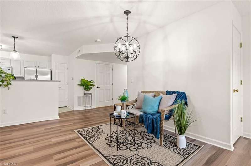 Main level condo with a rare private side entry and wooded views! This 2 bedroom, 2 bath home has been remodeled throughout with attention to detail. It feels like walking into a home - So stunning! The open floor plan offers great flow for everyday living & entertaining. Both bathrooms have been fully remodeled w/modern finishes, and all lighting throughout the unit is brand new. The kitchen and living areas are bright and open, with unique built-in corner shelving that provides space for display or storage. The primary suite includes a remodeled private bath, Plus a spacious walk in closet with built in shelving! Secondary bedroom is also roomy with access to the updated hall bath. Enjoy the convenience of main-level living with no stairs + the privacy of your own side entrance, plus the rare bonus of wooded views right outside your windows. Located within blocks of High Point University, shopping, and restaurants - An unbeatable location! Open Saturday and Sunday 1-3 pm.