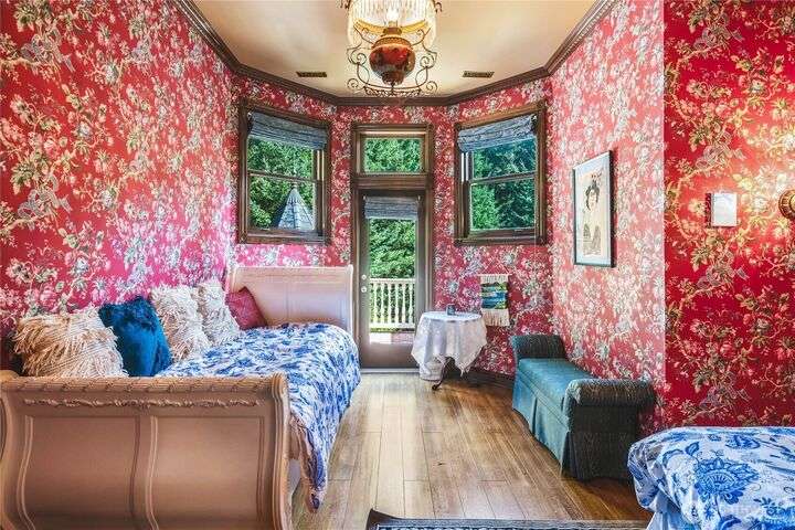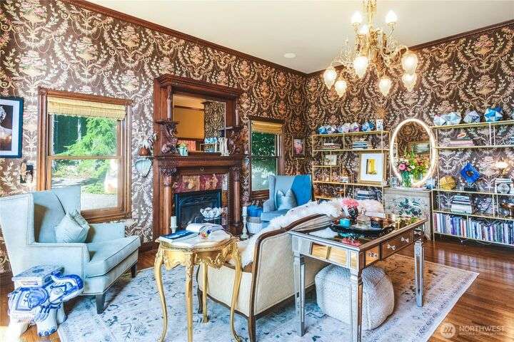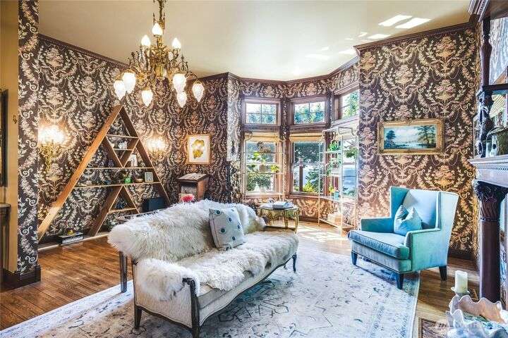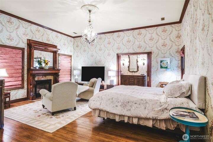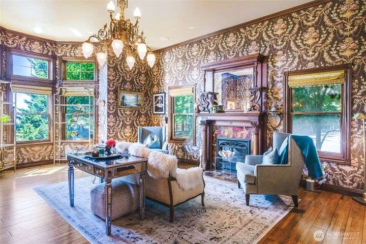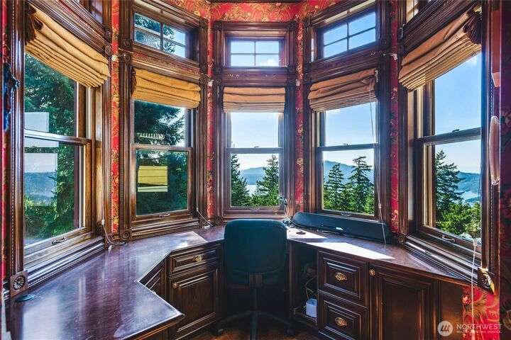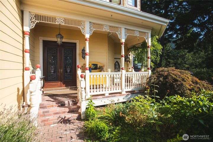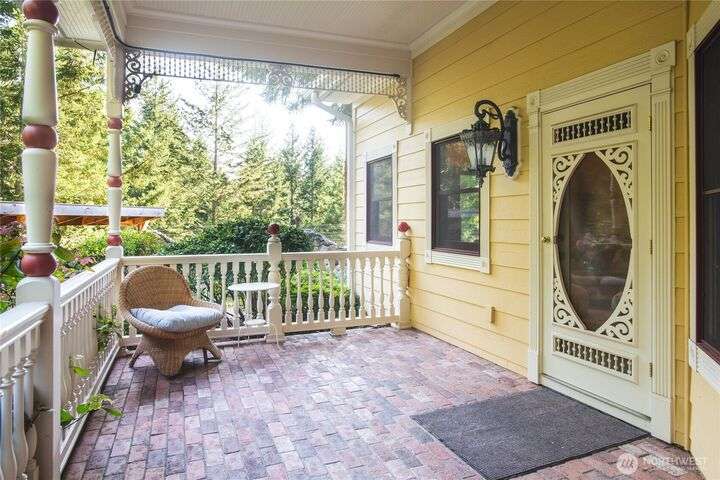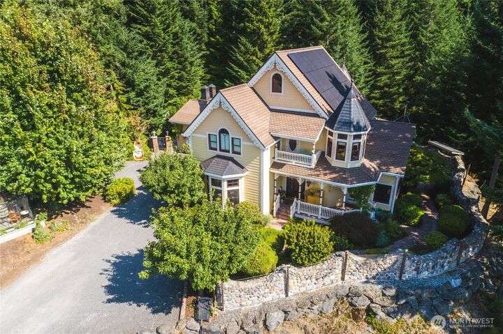 STUNNING VICTORIAN STYLE home with expansive views of Turtleback Mountain to British Columbia. Enjoy 7.5 private acres with ponds,waterfalls,gazebos,greenhouse, and walking paths, all in a serene mountain setting. Experience the property’s old growth trees, endless wildflowers in the Spring & Summer, and easy access to Moran State Park. This charming home features antique light fixtures, hand-painted wall paper, stained glass doors and 1800’s mantels, as well as modern updates like HVAC, solar panels, full irrigation, Wolf and Sub-Z appliances. Walled gardens, covered porches, and a fire pit perfect for outdoor living in the summer, while a Vermont Castings wood stove keeps winter cozy! Minutes from Eastsound amenities yet a world away.