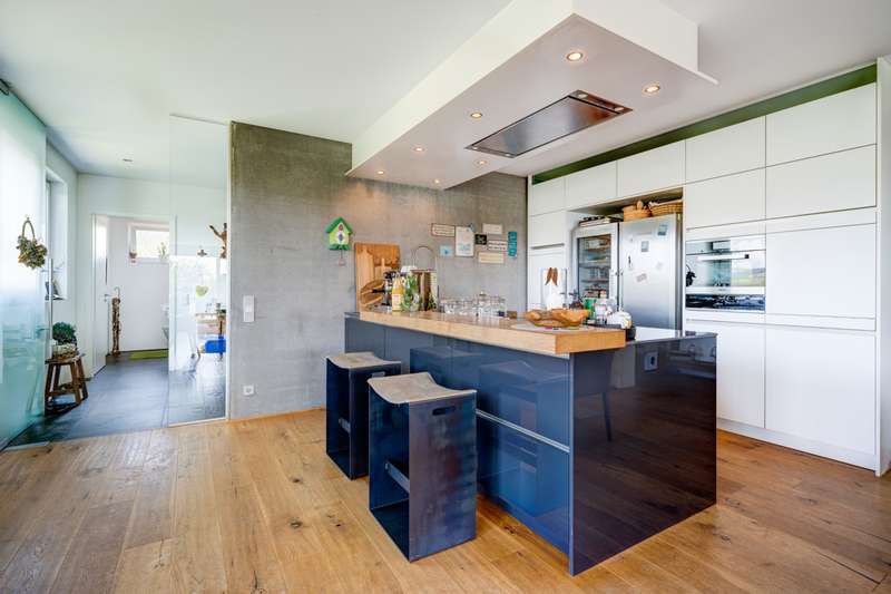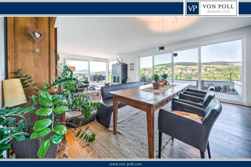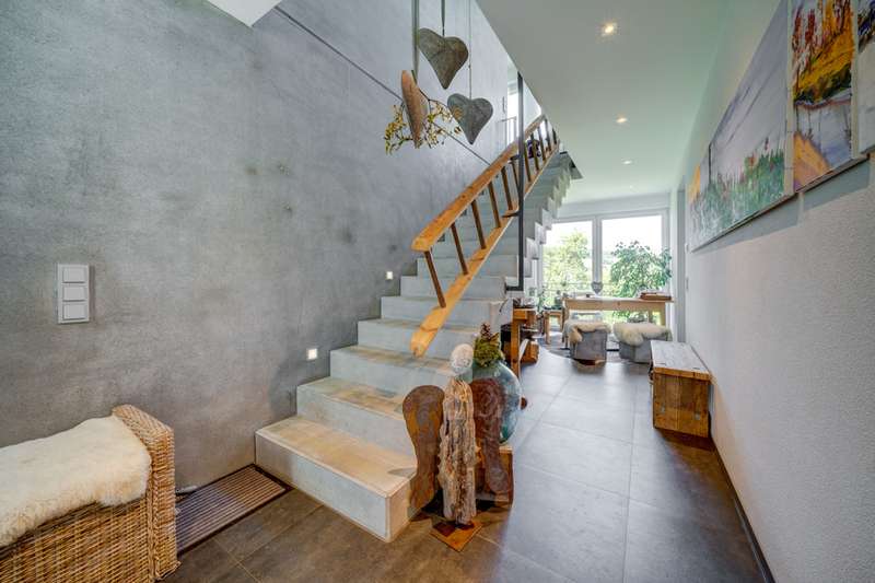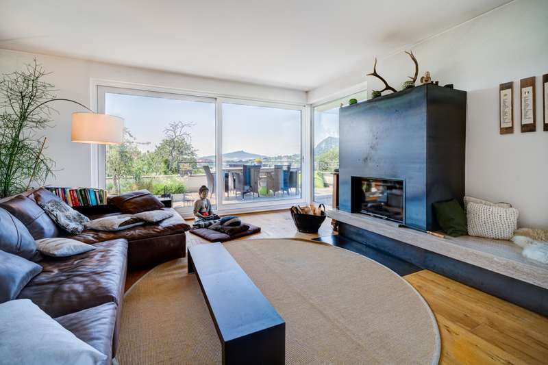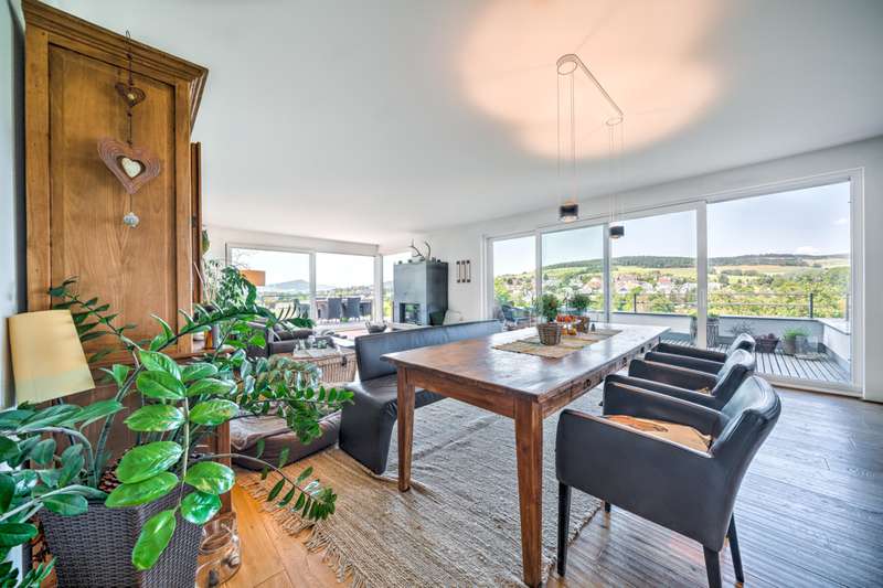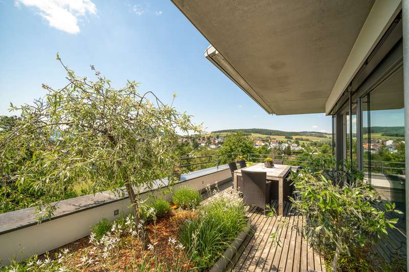 This exceptional penthouse is situated in a prime location and offers magnificent views of the surrounding countryside. Completed in 2014, the property impresses with its generous living space of approx. 210 m² and high-quality fixtures and fittings. The penthouse has 4.5 rooms, including 2 bedrooms, which offer enough space for the whole family. The light-flooded rooms have a modern design and offer a pleasant living ambience. A highlight of the property is the spacious 70 sqm roof terrace, where you can enjoy the wonderful view and spend cozy hours outdoors. This is the perfect place to spend relaxing summer evenings or organize a BBQ with friends. The penthouse also has a sauna, which contributes to relaxation and well-being. The triple-glazed windows ensure optimum sound and heat insulation and thus guarantee a pleasant living atmosphere. For security and comfort, there is a double garage and underfloor heating. Culinary delights can be prepared in the modern fitted kitchen, which is included in the purchase price. Those who like it particularly cozy can use the fireplace in the living area to warm up on cold winter days. The location of the penthouse is ideal, as it is a quiet residential area and yet has good connections to the city center and the freeway. Shopping facilities, schools and kindergartens are in the immediate vicinity. This unique property offers everything your heart desires: modern, high-quality fittings, a generous living space, breathtaking views and a quiet location. See this dream home for yourself and arrange a viewing today. Don't let this opportunity pass you by!