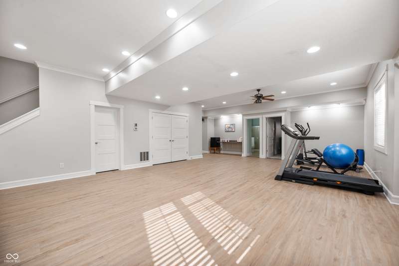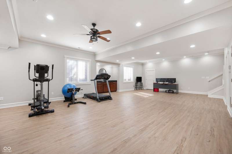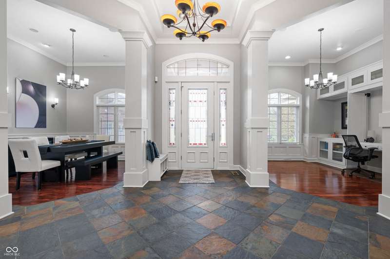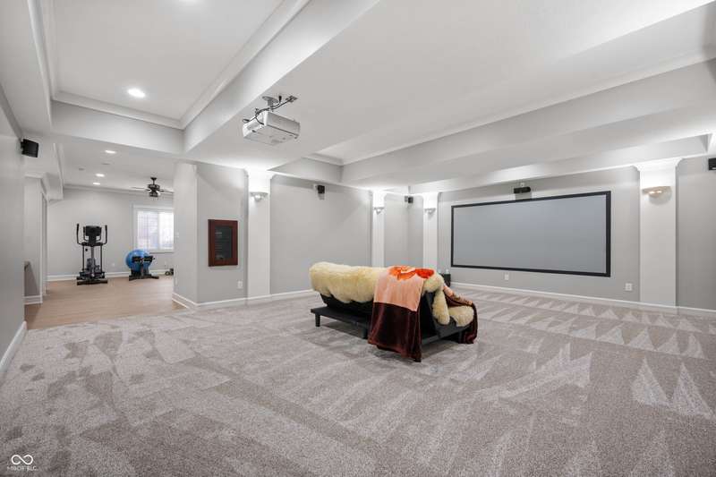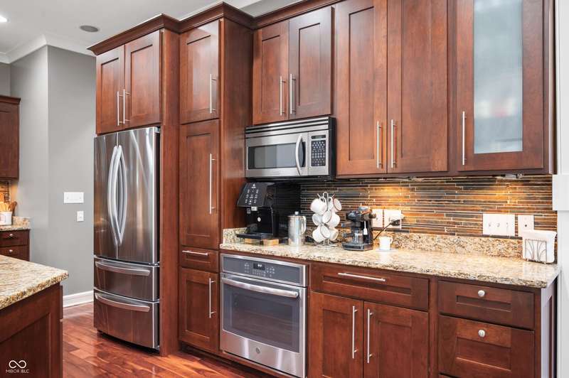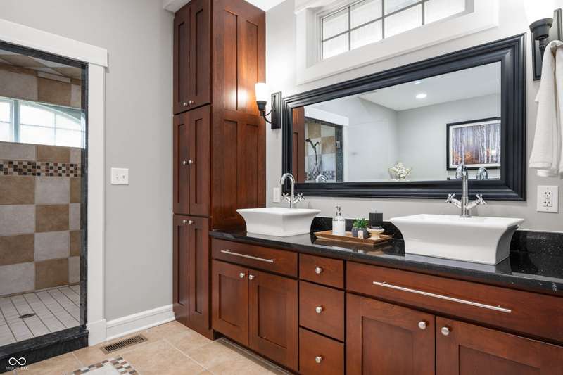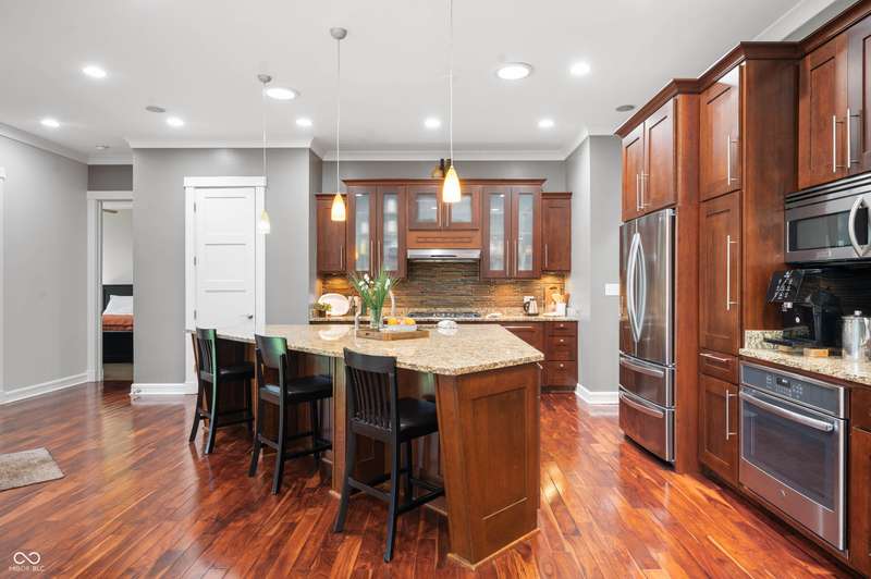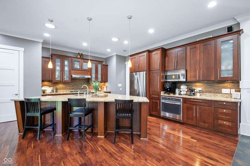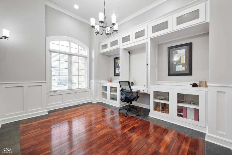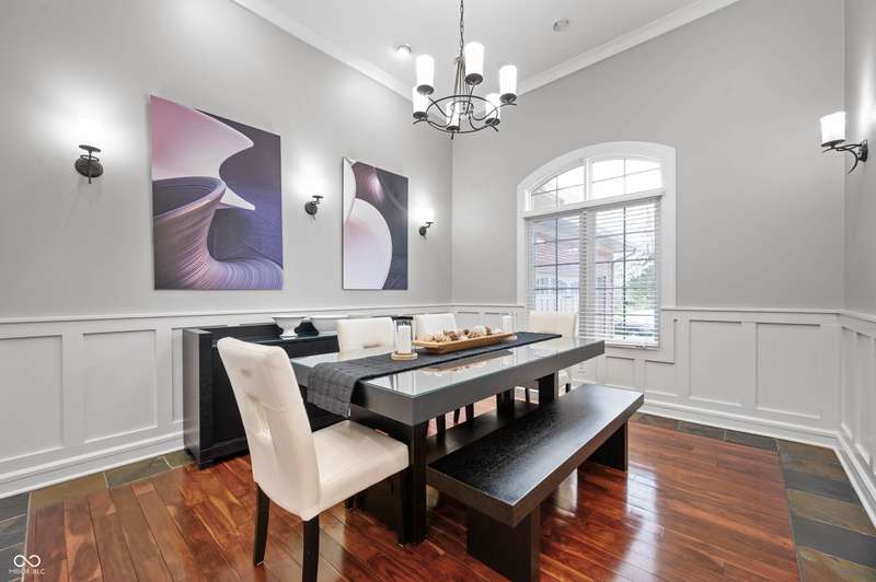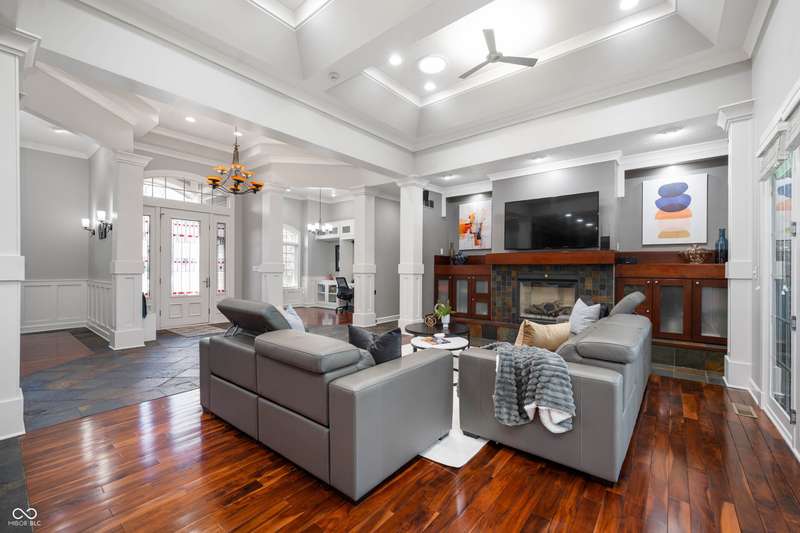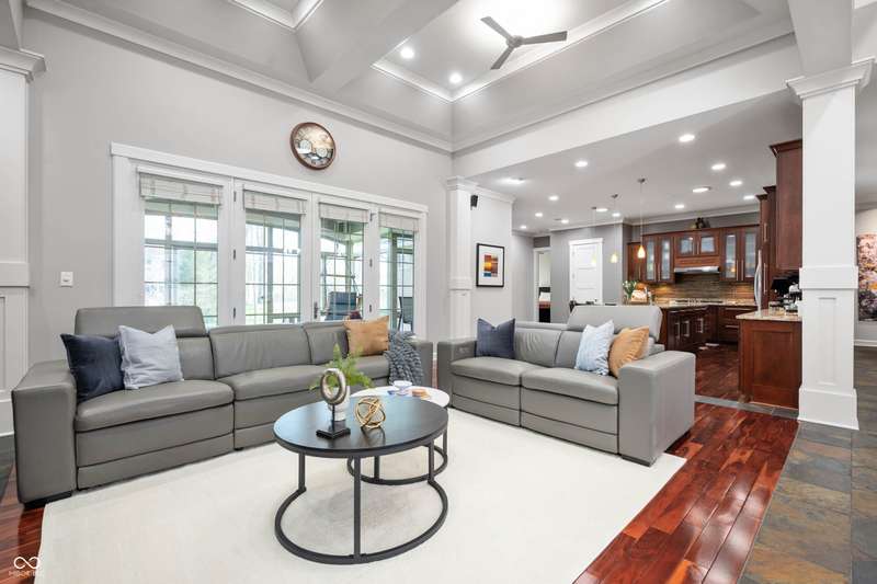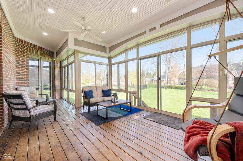 Welcome to a beautifully crafted custom-built, 1 owner ranch home that exudes warmth & elegance. This spacious 5-bedroom, 4.5-bath property is designed with an open floor plan that seamlessly connects the living spaces, making it perfect for entertaining or relaxing w/ family. High ceilings throughout, including in the basement, add to the feeling of grandeur, while recessed & tray ceilings bring a touch of sophistication. The heart of the home is the gourmet kitchen, showcasing exquisite Amish-made custom cabinetry, premium granite countertops, expansive island w/ integrated storage, & a meticulously designed layout that exudes elegance & flow. New gas cooktop, new refrigerator, new oven, & a 600 CFM exhaust fan ensure that the kitchen is both beautiful & functional. Brazilian cherry wood plank flooring graces the living room, dining area, office, & kitchen, while natural slate adds elegance to the foyer & hallways. All of the bedrooms, including basement bedroom, come w/ custom closets, offering plenty of storage space. Master suite includes a luxurious bathroom w/ a steamer for a spa-like experience. 3-season enclosed patio, accessible from the living room, kitchen, & master bedroom, provides a perfect spot to enjoy the outdoors while overlooking the huge backyard, which is ideal for creating a recreational area or giving large pets room to roam. The basement offers even more living space, complete w/ a theater room & plenty of natural light streaming through oversized window wells. Additional features include aluminum-framed entry doors & windows for low maintenance, a triple-lock safety mechanism for extra security, crown molding throughout the home, & a big garage w/ multiple shelves for storage.