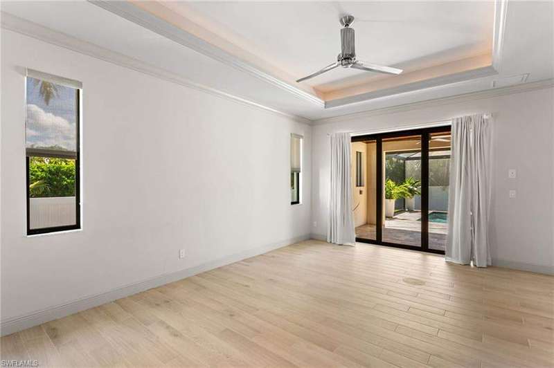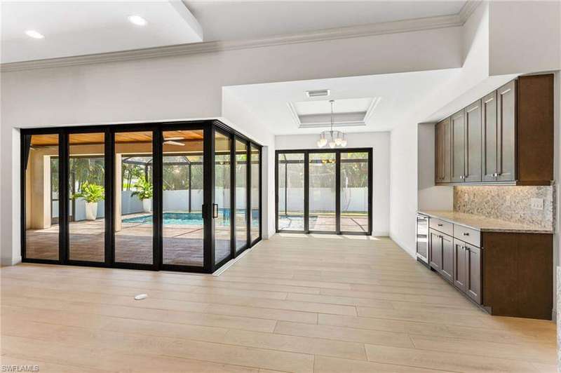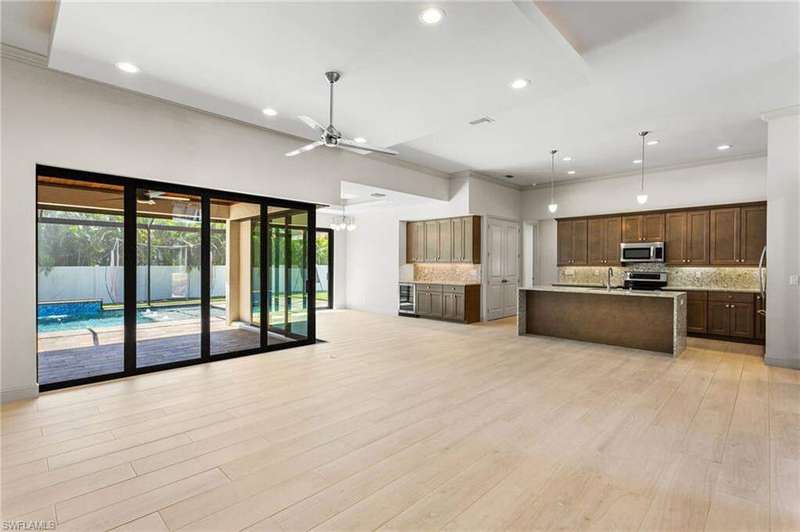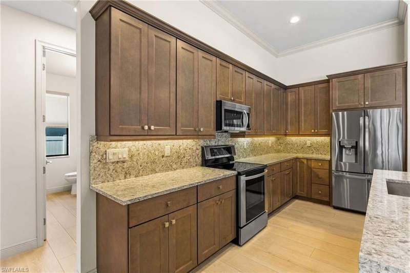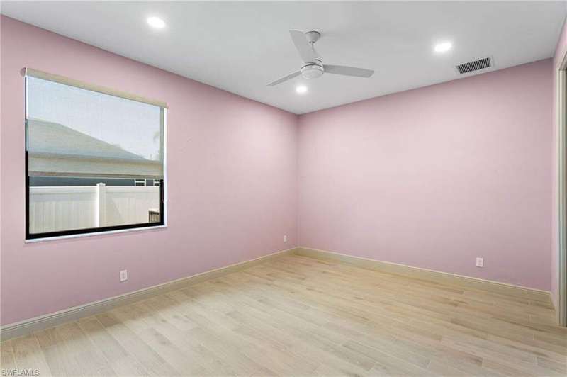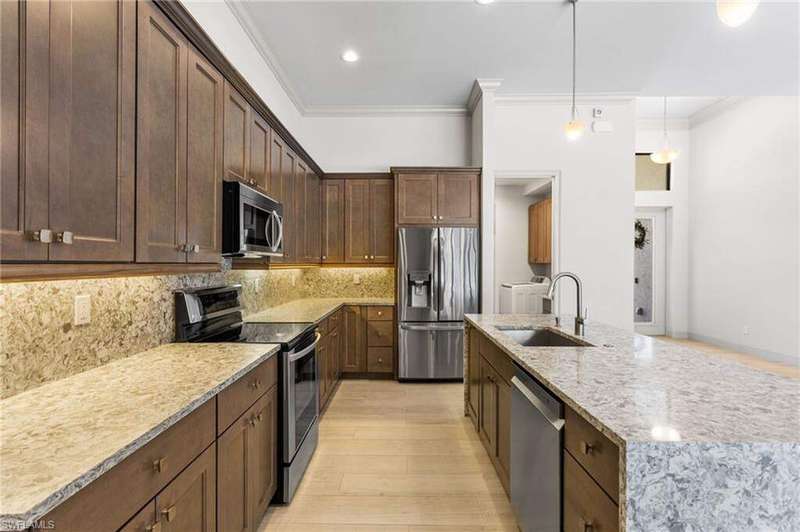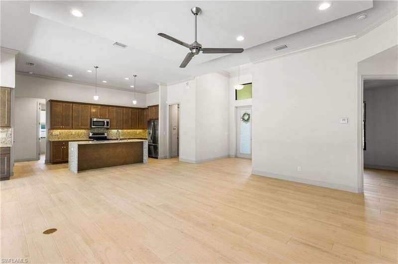 Located in the sought-after Southwest Cape Coral area, this stunning 3-bedroom + den, 3-bath home sits on an oversized corner lot with desirable Southern exposure. Designed for both comfort and style, this home features an open floor plan with soaring ceilings, elegant tray ceilings, and crown molding throughout-perfect for entertaining or relaxed living. Step outside to your private backyard oasis with a heated pool, sun shelf, tranquil water features, and a luxurious PebbleTec finish-ideal for enjoying Florida's year-round sunshine. The heart of the home is the chef-inspired kitchen, boasting quartz countertops, a large waterfall island, custom cabinetry, and premium stainless steel appliances. Impact windows and doors throughout and automatic hurricane shutters for the lania. Barkyard is partially turfed, perfect for outdoor activities. No expenses spared in this meticulous home. Conveniently located just minutes from Cape Harbour, top-rated restaurants, shopping, schools, and beautiful parks, this home offers the perfect blend of convenience and tranquility. Whether you're seeking a year-round residence or a luxurious winter retreat, this property is an exceptional opportunity in one of Cape Coral's most desirable neighborhoods.