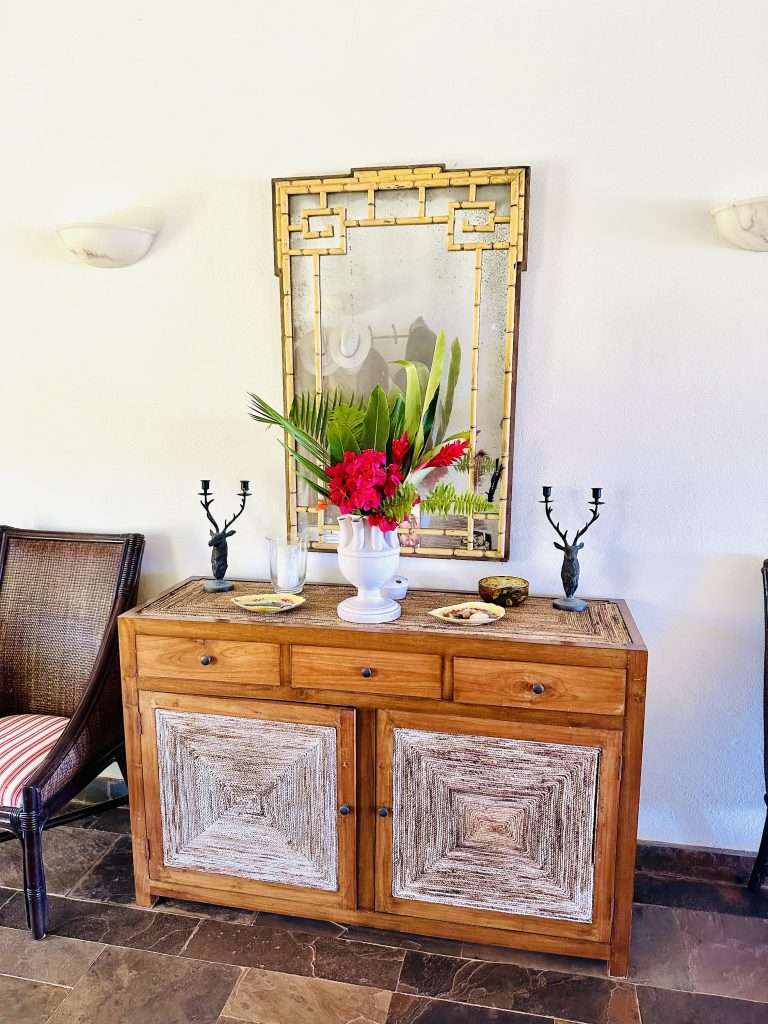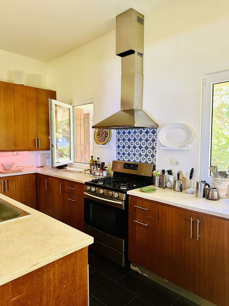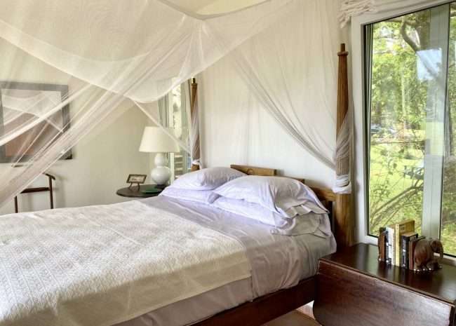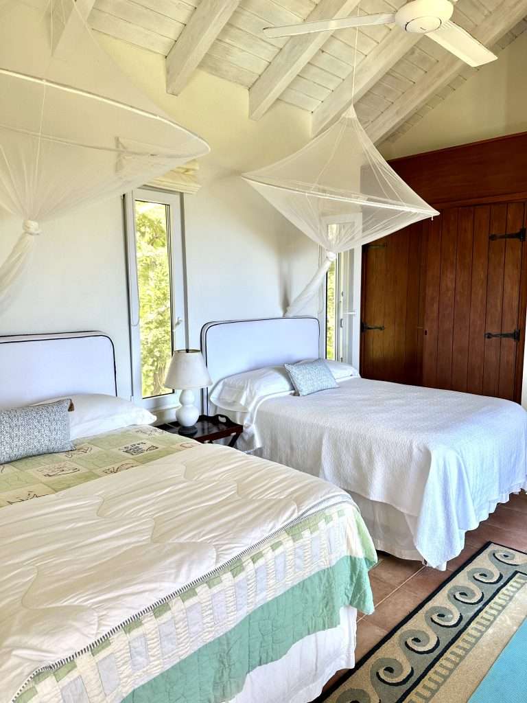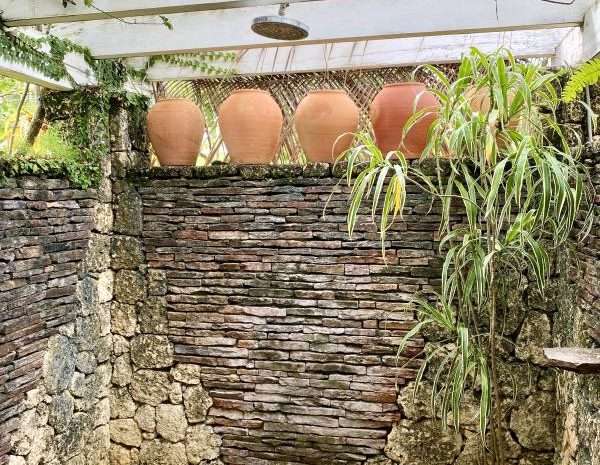 The master bedroom has its own inside and outside shower, and dressing room, and provides complete privacy away from the living areas. The guest pavilion is a two-story building that contains two bedrooms and two bathrooms. Both bedrooms have balconies with ocean views. The elevated hillside location of this property has constant cooling breezes off the ocean that are distributed by ceiling fans to provide great ventilation. The whole living area, bedroom floors, and pool deck are made out of the natural stone Coralina.