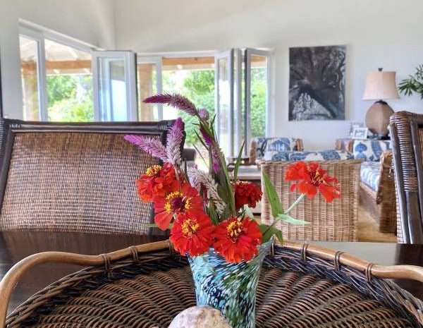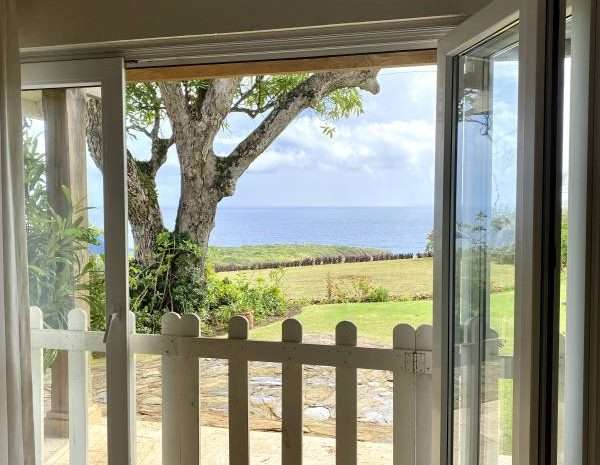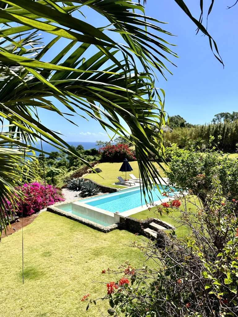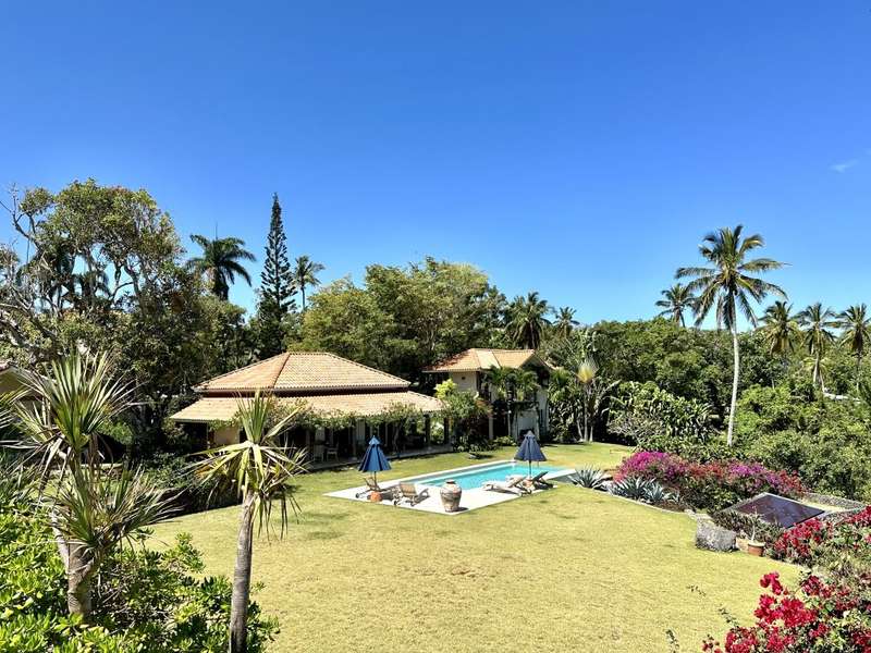 The property features the main pavilion that provides a large living area with a living room, dining room, kitchen, powder room, and office. The spacious kitchen is well-designed and equipped with a full range of modern appliances. A fully covered porch leads out to the gardens and private solar-heated swimming pool with panoramic ocean views.
