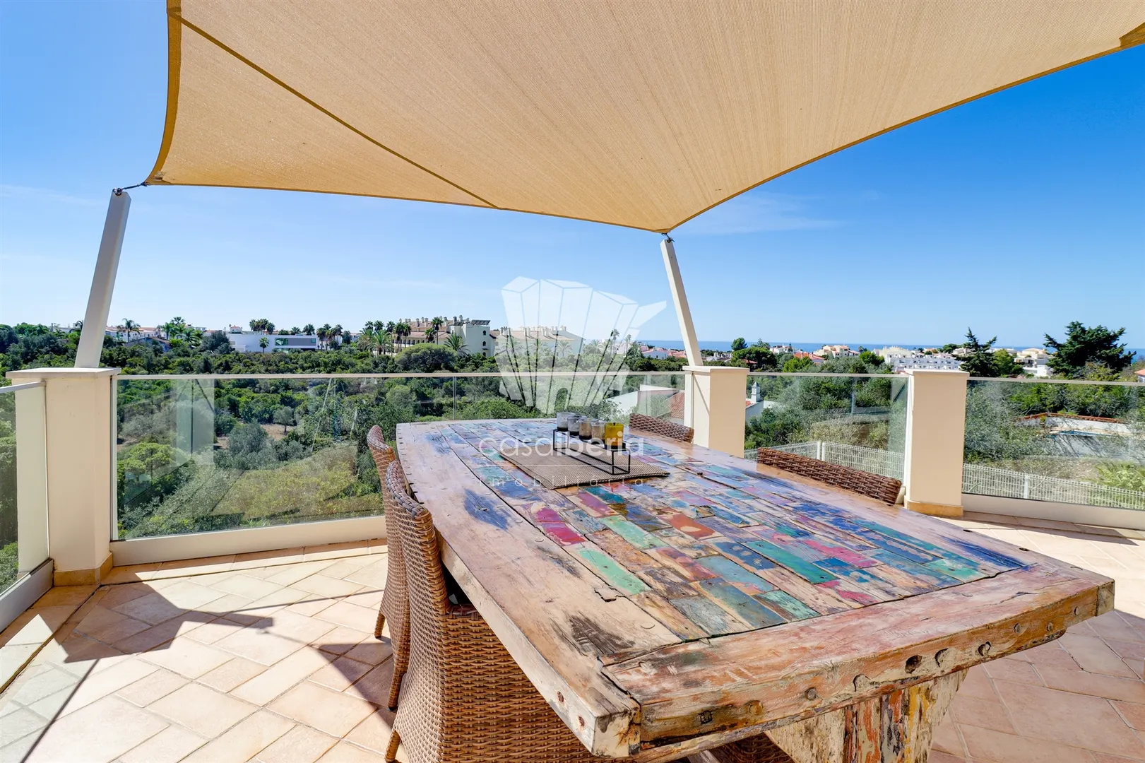 The higher level has a large balcony with sail shades, outdoor dining table and chairs and a comfortable lounge set. Just the perfect spot for a cool drink whilst watching the sun go down! Inside, there is the modern, well equipped open kitchen with high balcony a couple of high stools and the dining area. The master bedroom with en suite bathroom -'bath with a view'-and separate shower is to be found on this level too. From the staircase to the right, there is the master double bedroom with walk-in closet and en suite bathroom with separate shower, patio doors open up to a balcony.