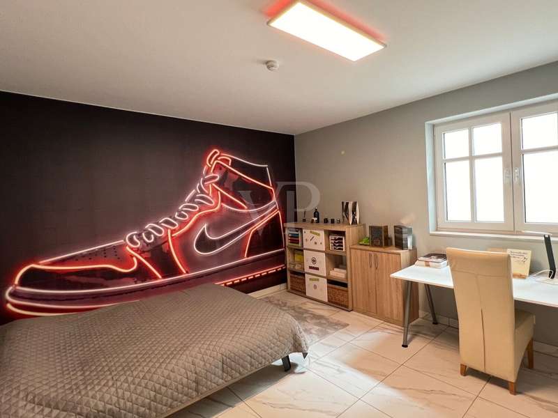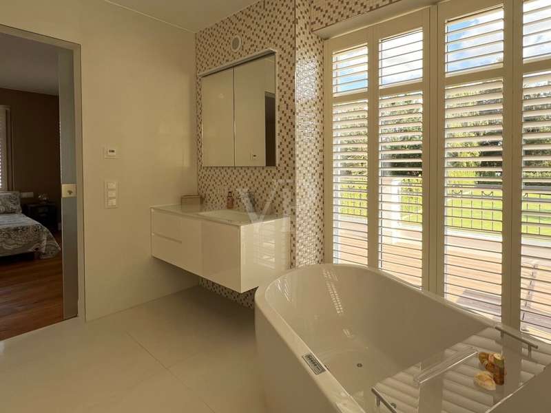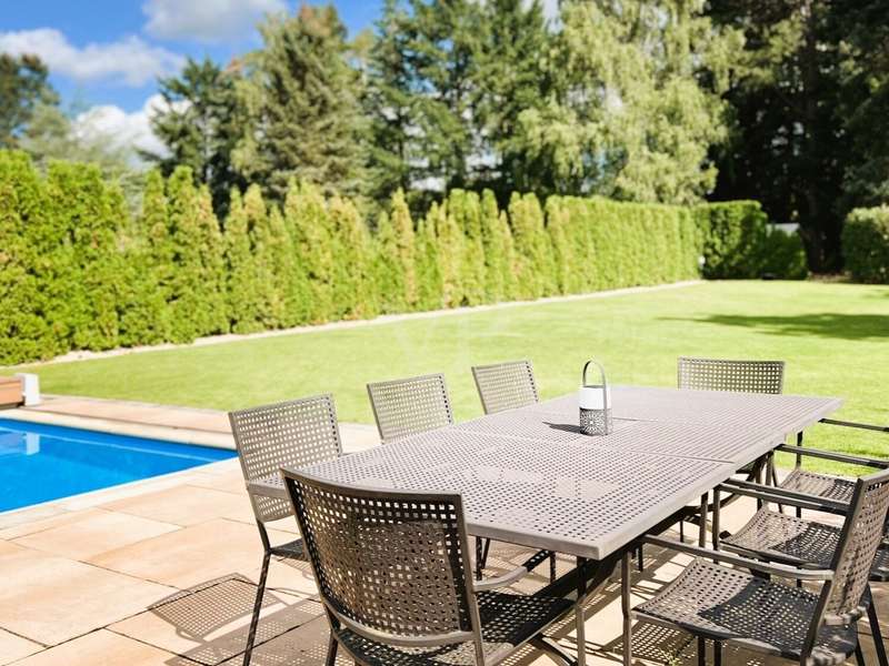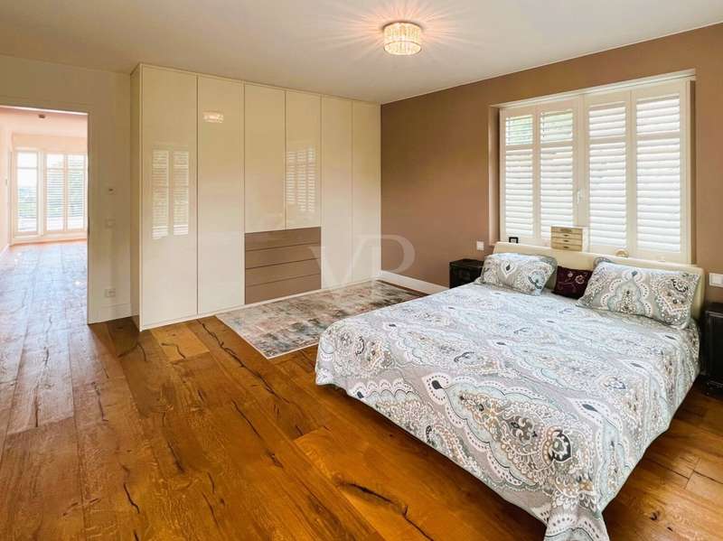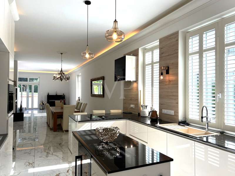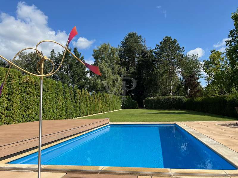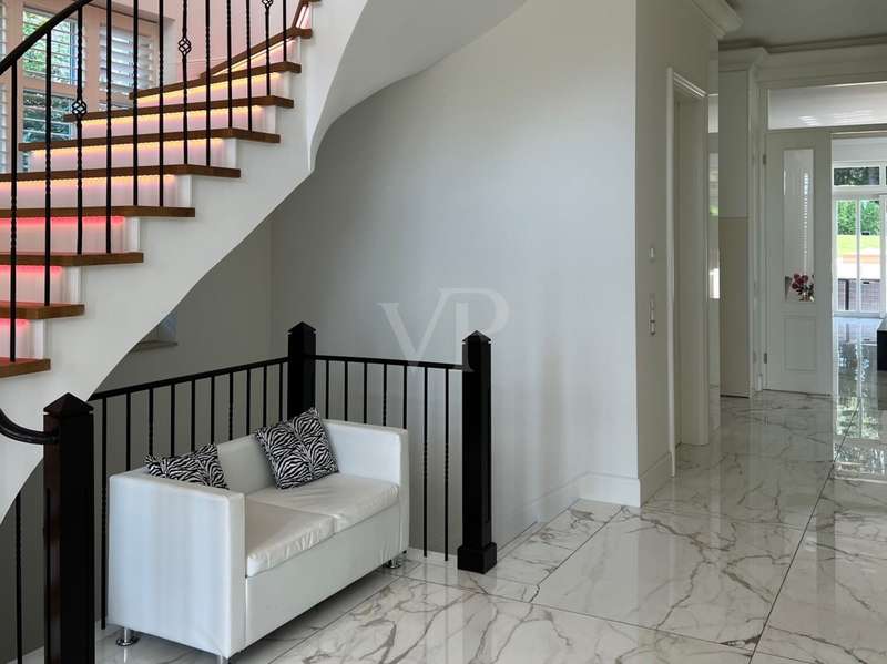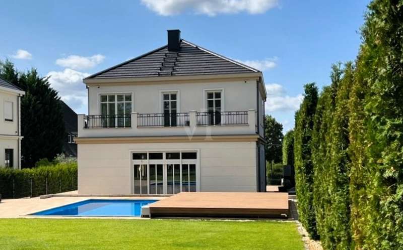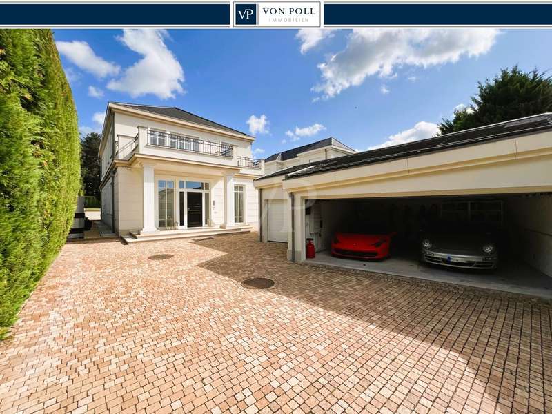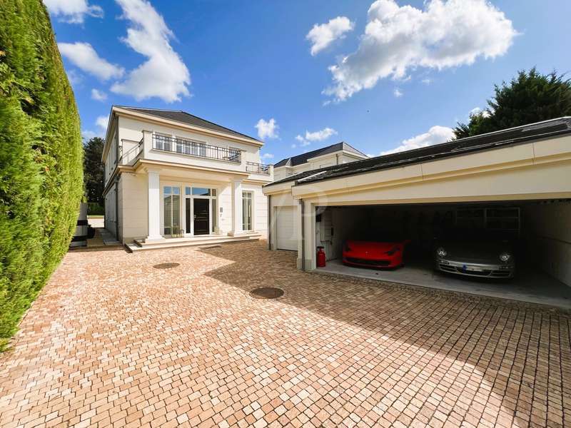 In a unique natural setting, we present a luxurious property with magnificent views of nature and the countryside. In a sought-after location in Bad Homburg, close to the Hardtwald forest, this prestigious property was built between 2019 and 2021 in solid construction with a white bathtub. Equipped with high-quality materials and supplemented by state-of-the-art technology (heat pump and photovoltaics), a feel-good place has been created here that offers maximum comfort, elegance and absolute privacy on approx. 416 m² of living and usable space and 1,625 m² of land! The foyer of the house impresses with exceptionally high ceilings. A hallway with bright, large-format floor tiles leads you past the staircase, guest WC and checkroom to the spacious living room on the first floor. Here you will find a cozy spot by the fireplace positioned freely in the living room. This can be experienced from three sides. Floor-to-ceiling windows flood the room with light and provide a view of the garden, terrace and pool. The dining area is ideally planned for a long table. This means that larger parties are also possible. Connected to this area is the open kitchen with high-quality appliances: as-new Miele electrical appliances, two ovens, Bora extractor system, wine fridge (Klarstein), side-by-side fridge (Samsung). From the living area you enter the barbeque terrace in front of the heated pool (approx. 4 x 8 m). The counter-current system can be switched on for a workout in the azure blue water. You can move the wooden deck by remote control to open or close the pool. A second sunny terrace is slightly elevated. The spacious garden is barely visible due to the surrounding hedges. It is easy to maintain and is equipped with a robot mower and an irrigation system. The view of the surrounding landscape is unique and a highlight! Experience this magical place, take a deep breath and enjoy the absolute peace and quiet in this natural setting. The upper floor of the town villa has two beautiful (children's) bedrooms, one of which has a loggia. Each room has its own bathroom. The spacious master bedroom has an en-suite bathroom. The free-standing whirlpool bath and the shower with rain shower provide a wellness feeling. Two large balconies on both sides of the villa with views of the neighboring gardens and the adjacent nature reserve are a further highlight. The wooden spiral staircase, illuminated with colored LEDs, leads to a comfortably converted attic studio with air conditioning (approx. 70 m² usable area). It is perfect as a home office or for guests. The intelligent room design with many, almost invisible built-in units provides enormous storage space. A shower room is available. The basement offers further, comfortably designed rooms, such as a party room with fitted kitchen, comfortably designed rooms for guests or hobbies. You can work out in the fitness room and then freshen up in the adjacent shower room. The technology and controls for the entire house have been brought together in a room in the basement. This is where the air/heat heating system, ventilation system with heat recovery, photovoltaic system including storage element and pool technology are set up. A storage room and a utility room with a laundry chute round off the space available in the house (usable areas). This fantastic property is completed by a large double garage with storage space in the roof and a separate single garage. Both are equipped with electric roller doors. The property offers several parking spaces for guests on the approx. 50 m long stately driveway. Contact us to get to know this unique urban villa with A+ energy efficiency soon!