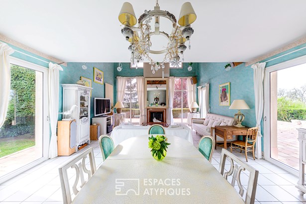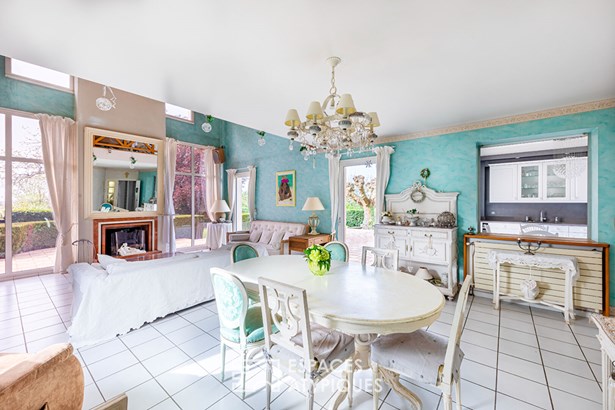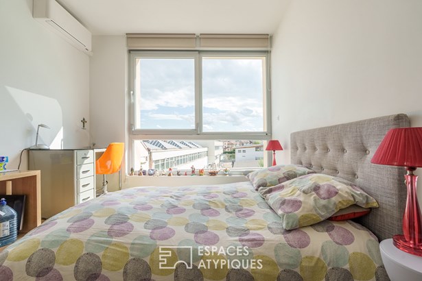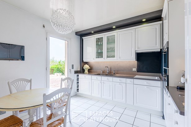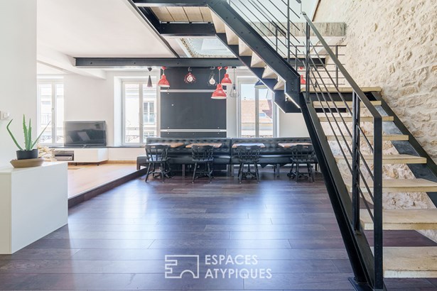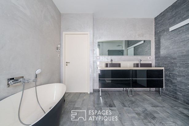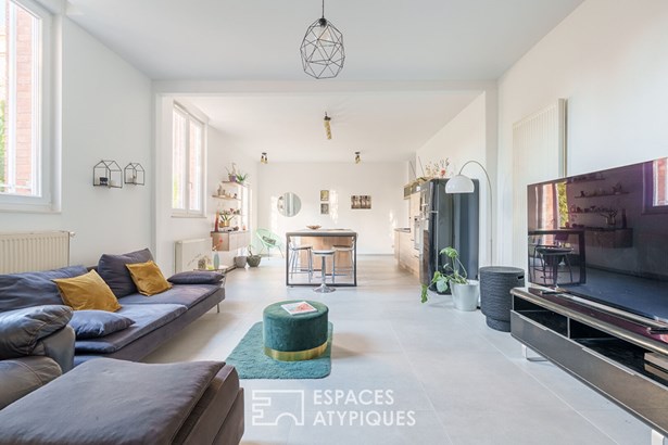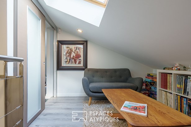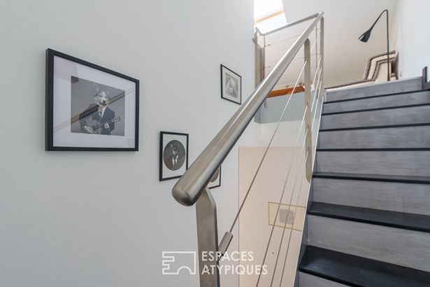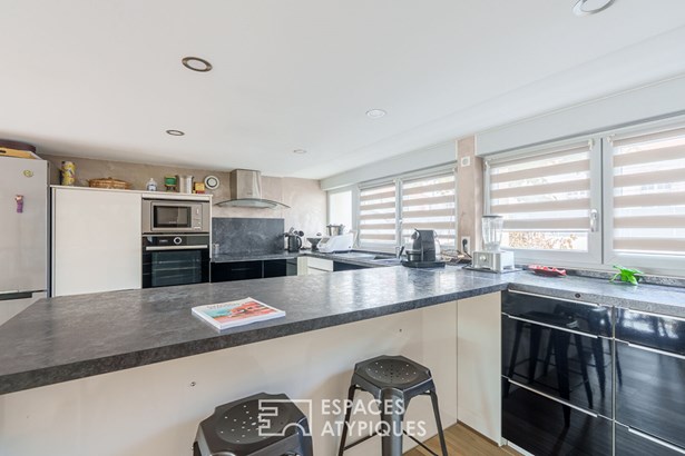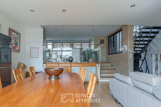The separate entrance opens onto a striking black metal staircase, which serves as a connecting thread between the different levels. The ground floor features a spacious 48 m2 living room extended by large bay windows opening onto the terrace and garden. The 16 m2 fitted kitchen, slightly raised like a mezzanine, overlooks the living area and creates a welcoming and functional atmosphere.