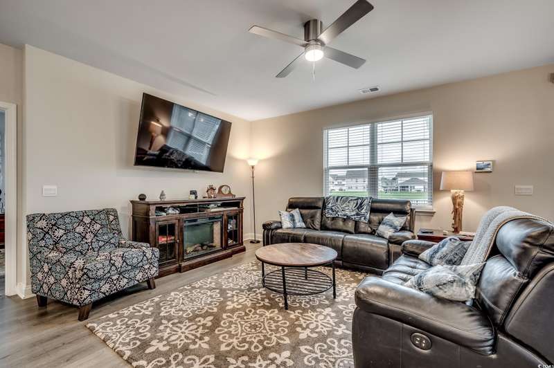 Welcome to this stunning 4-bedroom, 2.5-bath Belfort floorplan located in the highly desirable community of The Farm at Timberlake in Myrtle Beach. This thoughtfully designed home features a spacious first-floor primary suite complete with a walk-in closet and en-suite bath, offering both privacy and convenience. A first-floor laundry room adds to the home's functionality. The open-concept kitchen boasts modern appliances, abundant cabinetry, a breakfast bar, and flows seamlessly into the bright great room and dining area—perfect for everyday living and entertaining. Upstairs, you'll find three additional bedrooms, a full bath, and a versatile loft ideal for guests, a home office, or playroom. Enjoy outdoor living with a screened porch, private backyard, and patio—on a premium lot with a beautiful pond view, great for relaxing or hosting gatherings. The owner has added gutters and a sprinkler system enhancing exterior maintenance and protection. A two-car attached garage provides ample parking and storage. Located in the top-rated St. James school district and just minutes from shopping, dining, golf, the Intracoastal Waterway, and the beach. Community amenities include: Two outdoor pools, fitness center, open-air pavilion, playgrounds, fishing dock, walking trails, and an indoor pickleball court. The Farm at Timberlake offers a vibrant lifestyle with year-round events and activities.