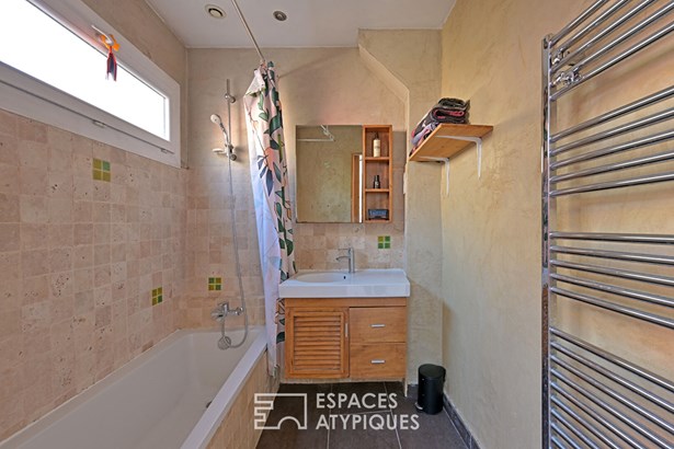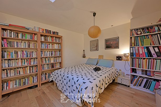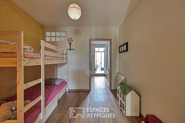 The ground floor opens to the spacious 64 m2 garage, a rare bonus space perfect for an artist's studio or a professional activity. A first bedroom is also located on this level.