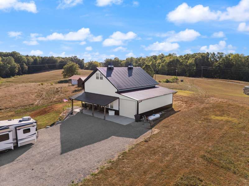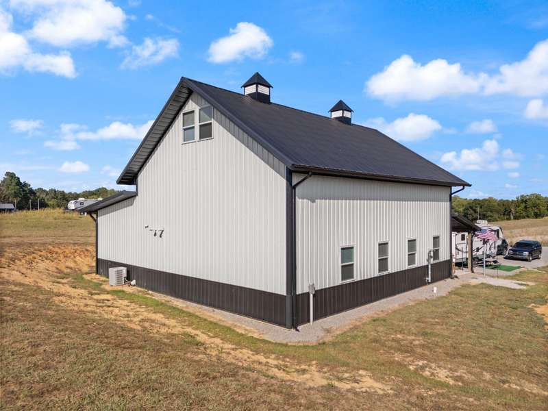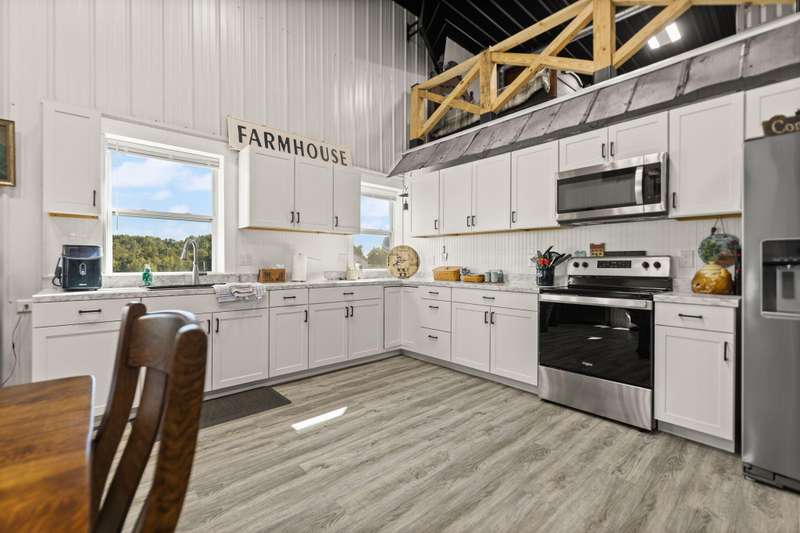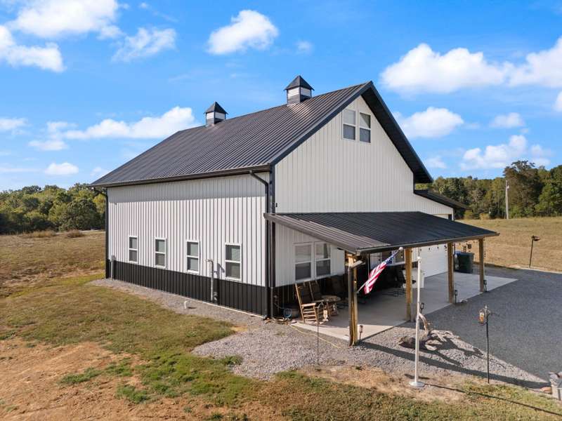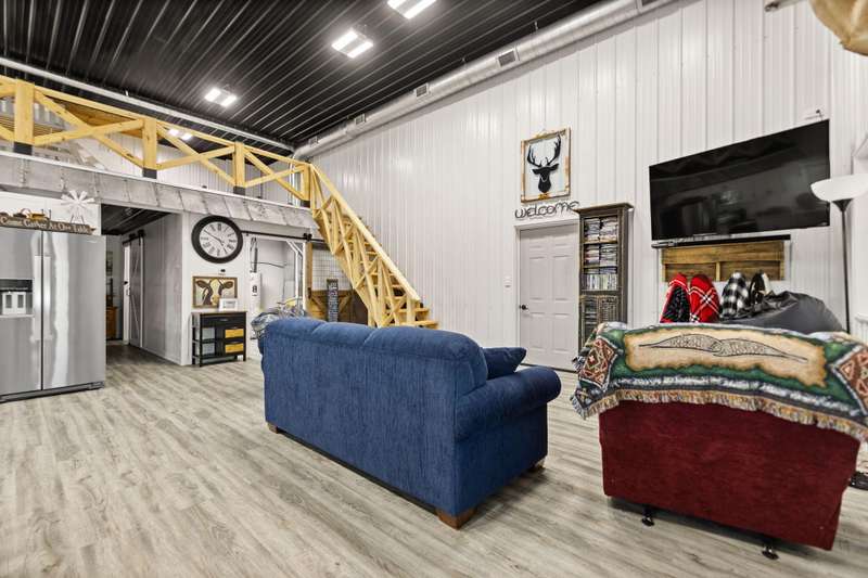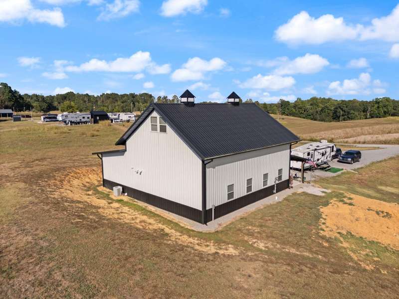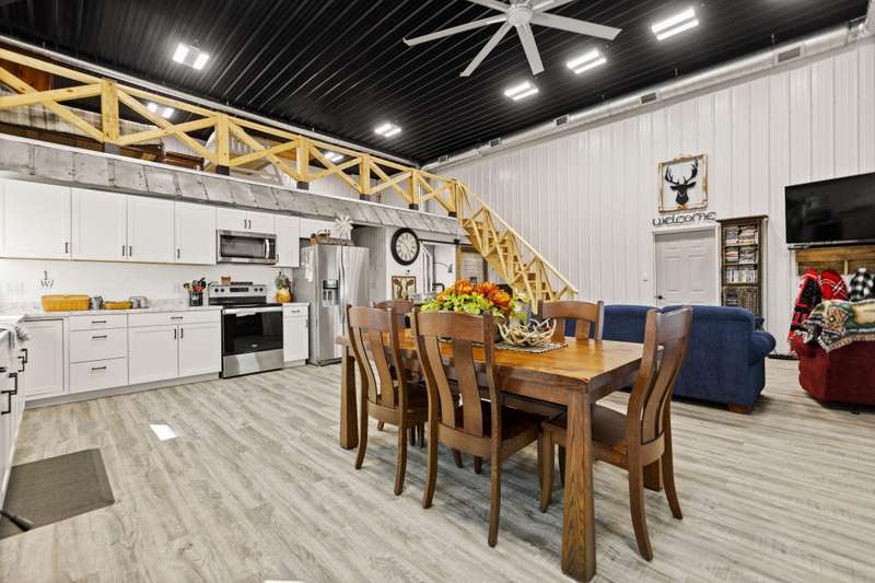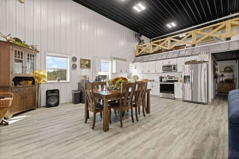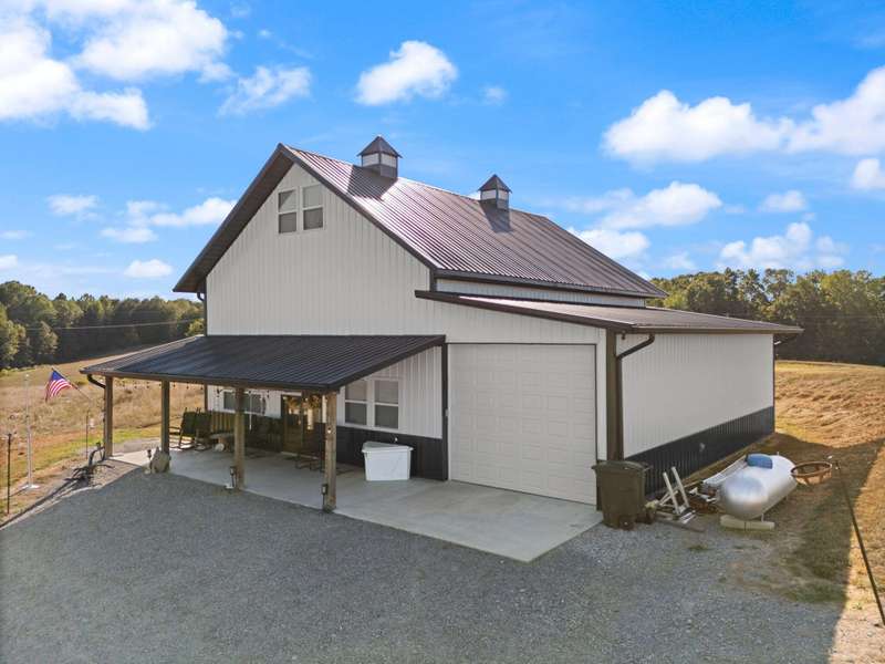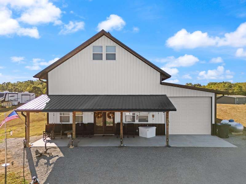 Custom barndominium built in 2022 featuring 1,680 sq. ft. of finished living space on a 0.67-acre lot. This home offers 2 bedrooms and 1 full bath with one bedroom on the main floor and a loft bedroom with space for multiple beds, accommodating up to 12 guests. The third floor is spray-foamed and partially floored, providing potential for an additional 480 sq. ft. of living space. The attached 14x40 garage is also spray-foamed for efficiency. Comfort is provided by a heat pump for cooling and a propane floor furnace with pellet stove backup. Most furnishings remain, along with kitchen appliances, washer, and dryer. Launch your boat just 3 miles away at the end of Park Forest Rd and enjoy quick access across the lake to Conley Bottom Marina. City water, septic tank, and excellent lake-area location approximately 10-12 miles to Wolf Creek Marina by car. A versatile property ideal as a primary home, lake retreat, or rental investment!