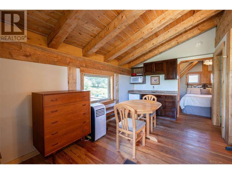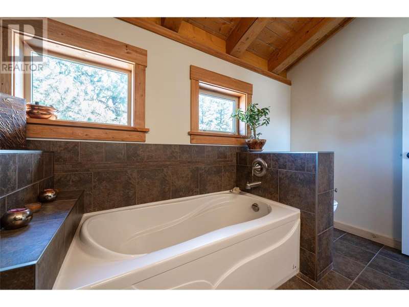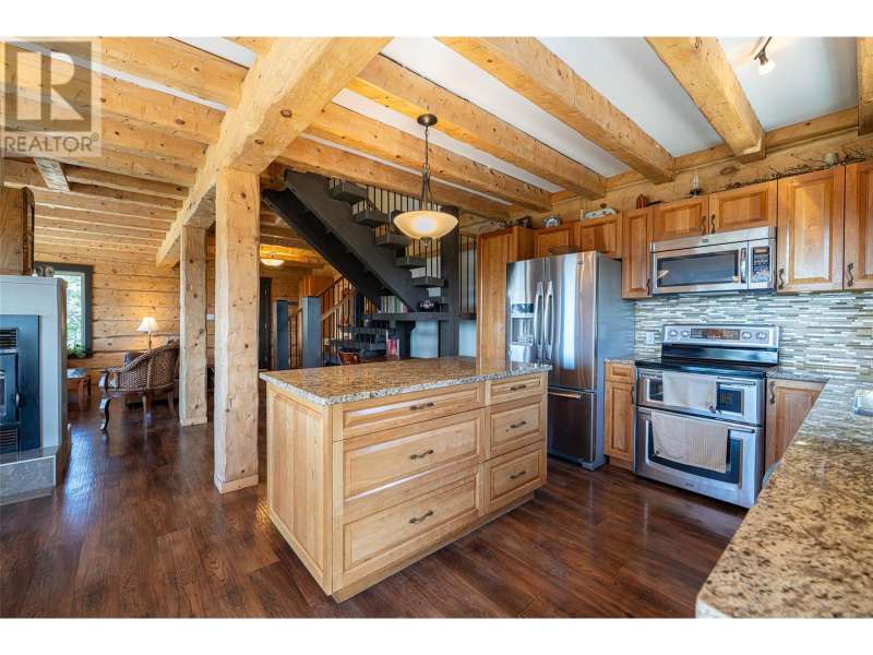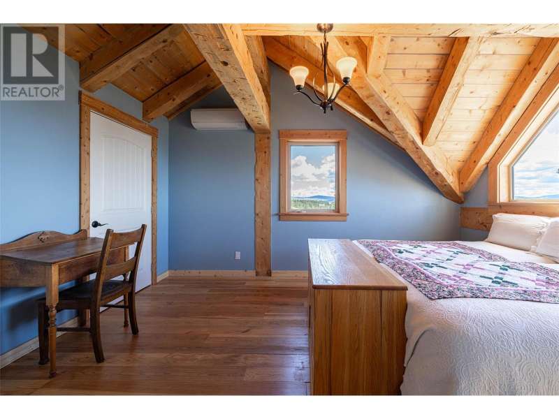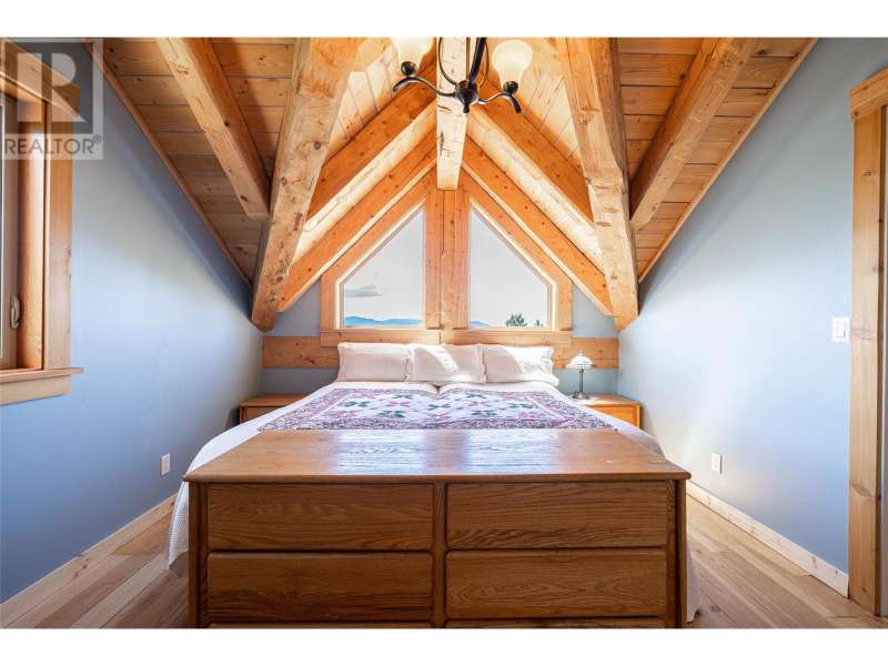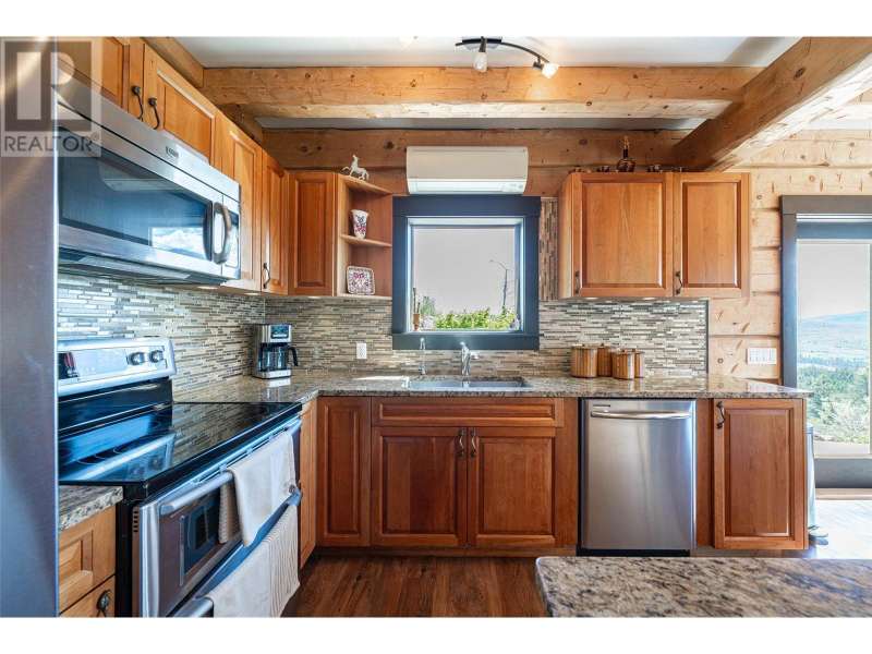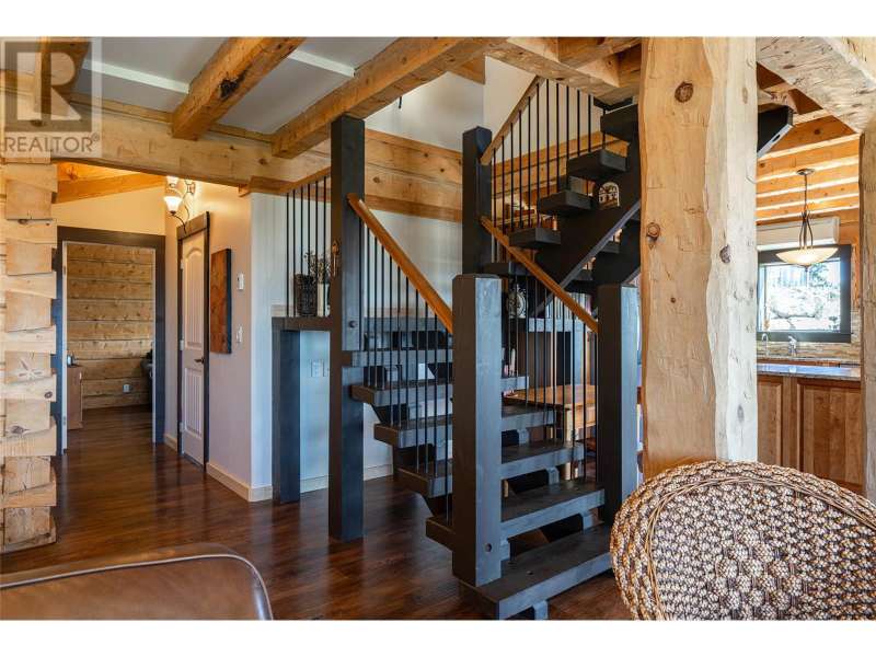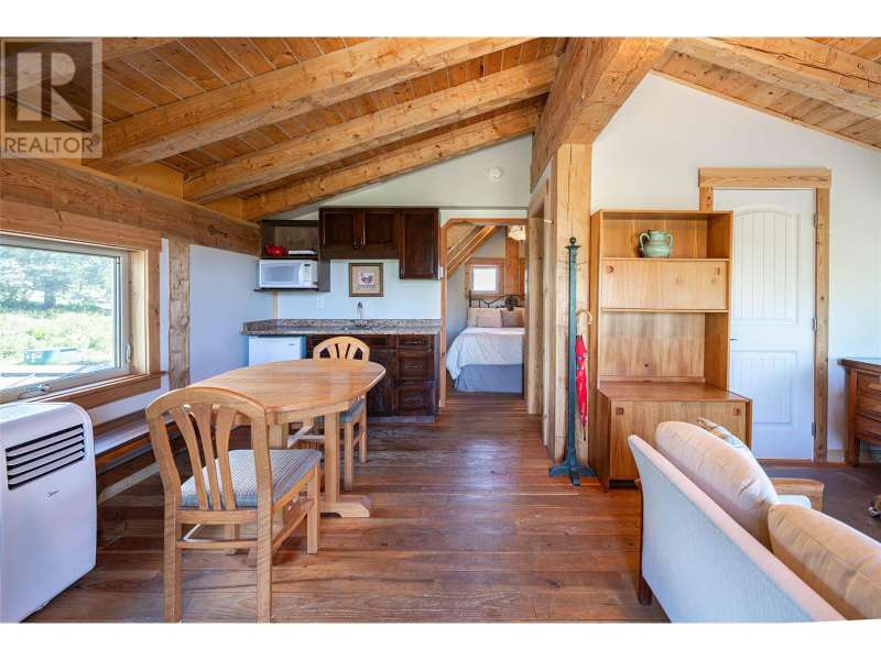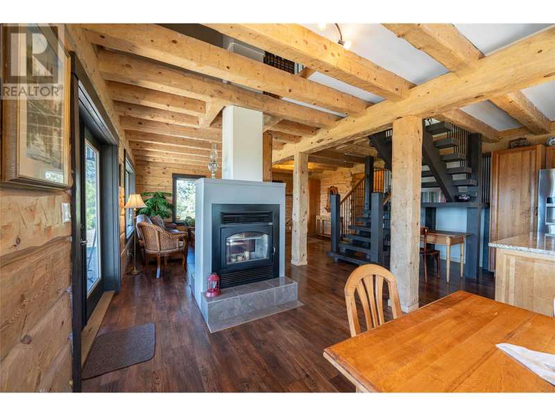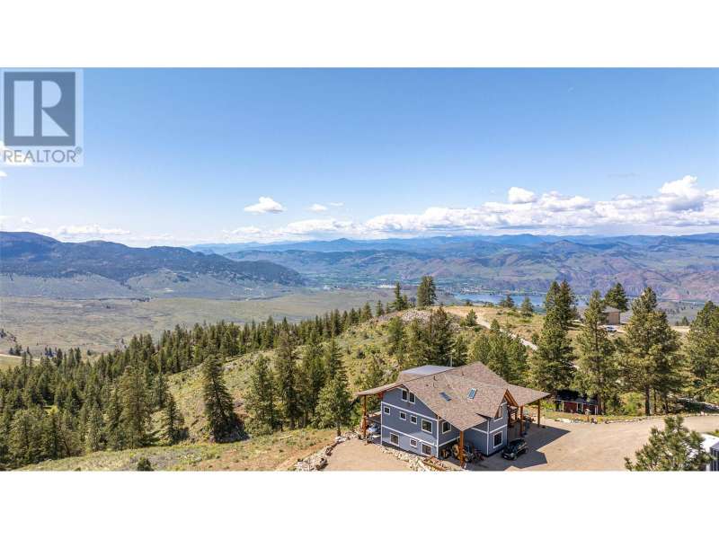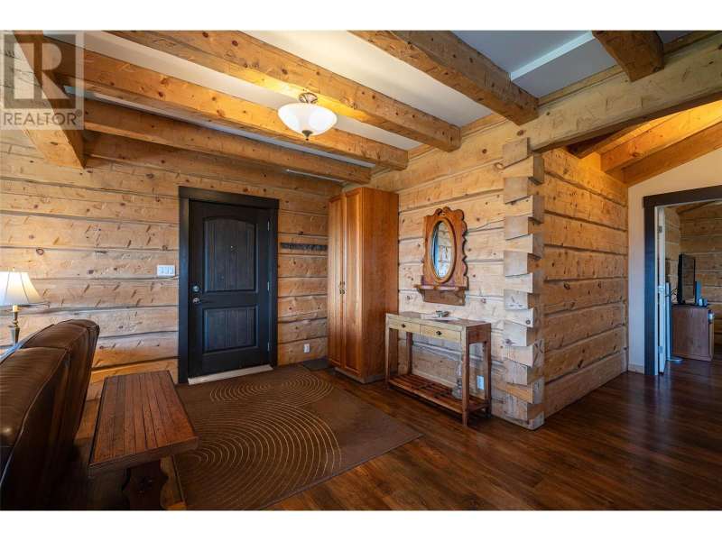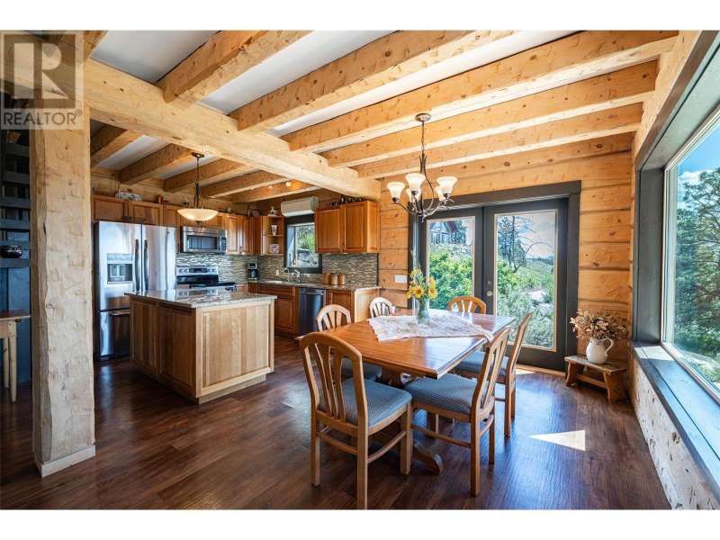Welcome to Anarchist Mountain where natural beauty and architectural craftsmanship meet in a peaceful and quiet atmosphere. Just 15 km from the charming town of Osoyoos, this rare European-style custom dovetail log home is set on 2.5 South facing private acres with breathtaking meadow and mountain views. Designed with timeless appeal and quality in mind, this unique residence features vaulted ceilings, exposed beams, and large picture windows that flood the interior with natural light and warmth. Front covered porch helps keep cooler in the summer. The open-concept layout is anchored by a stunning double-sided wood-burning fireplace, and radiant in-floor heating ensures year-round comfort. A potential primary bedroom on the main floor adds flexibility to the thoughtful layout. A spacious, heated three-car garage includes a fully self-contained 450 sq ft carriage suite above with kitchenette, ideal for guests, a private office space or rental income. Outside, enjoy a hot tub overlooking a professionally landscaped yard complete with a fire pit, stonework, and native wildflowers. Additional features include a high-producing well, underground power, and proximity to Mt. Baldy, perfect for hiking, cycling, snowshoeing, and cross-country skiing. This one-of-a-kind mountain retreat offers peace, privacy, and endless opportunities for outdoor living. A true must-see. (id:7434)