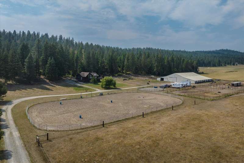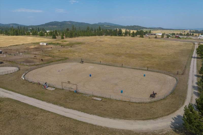 The private gated entry at this special equine facility leads to a lovely home & fully-utilized property equipped for boarding, training or breeding. It’s located 20 min North of Spokane. The 110’ x 140’ enclosed barn features a 60’ x 110’ indoor arena w/heated viewing room; 9 lg stalls, w/attached paddocks, a wash/grooming stall, 2 tack rooms, heated bathroom, hay/storage & more. The 18 a. property includes a 140’ x 220’ outdoor arena, multiple outdoor pens of varying sizes. Pens are set up w/energy-free, year-round automatic waterers. The home highlights a spacious & inviting feel with cathedral ceilings, great room, & large kitchen. Spacious primary suite w/ a jetted tub & walk-in tile shower. The daylight basement hosts two additional bedrooms, bathroom & family room. The exterior was recently updated w/an efficient heat pump. The low-maintenance yard extends to a concrete walk-out back patio w/built-in bench, perfect for entertaining. Amazing opportunity to own this gem!