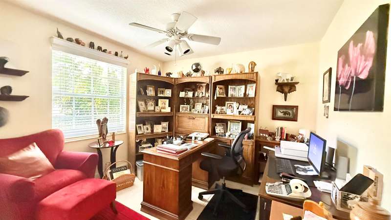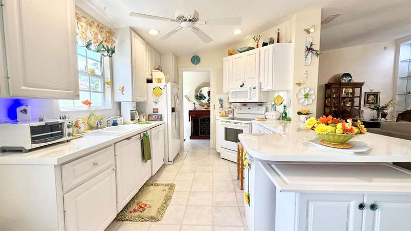 Sought-after Expanded Regent model featuring 3 bedrooms, 2 bathrooms, plus a versatile den with sliders leading to the covered patio and an additional bonus - The roof was replaced in 2019!! The open layout boasts vaulted ceilings in the great room, built in entertainment center and ceramic tile flooring throughout (wood flooring in principal bedroom) The principal suite offers an en-suite bath with double sinks, a large walk-in shower, and walk-in closet. Two guest bedrooms share a full bath with a tub/shower combo. Additional features include a laundry room with utility sink, central vacuum, and security system. Enjoy the covered, screened patio with skylight and tranquil garden views in a very quiet location.
