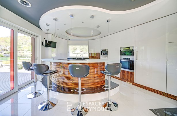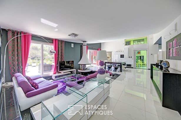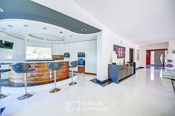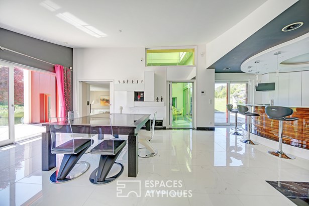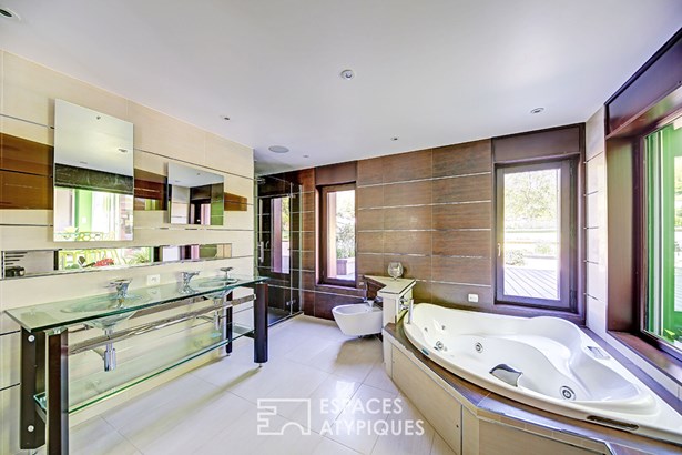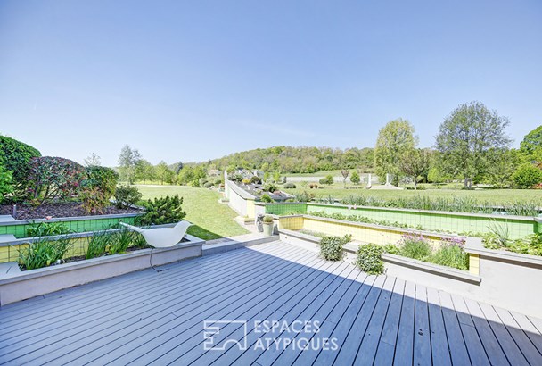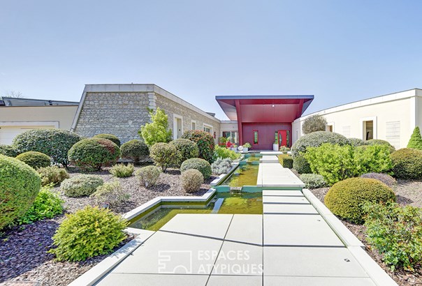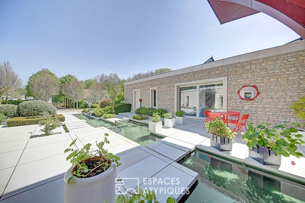 Majestic contemporary residence at the gates of western Paris, where dreams mingle with reality. Nestled in the heart of a two-hectare green setting, crossed by a singing stream, this sumptuous building rises, bathed in light, over an area of 299 sqm.