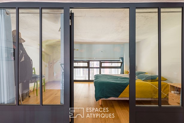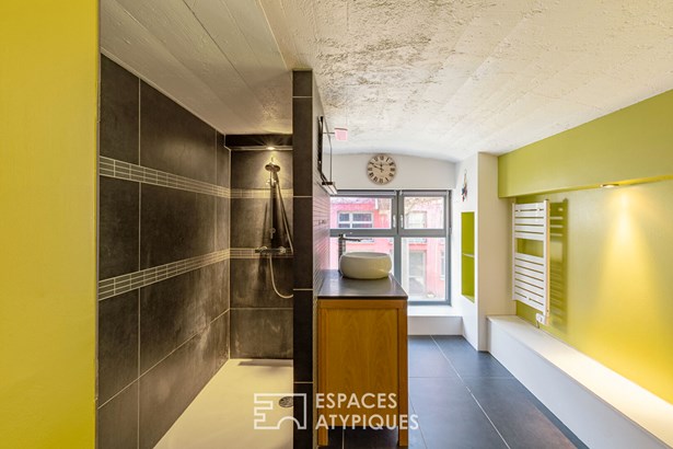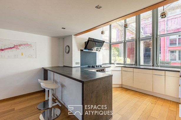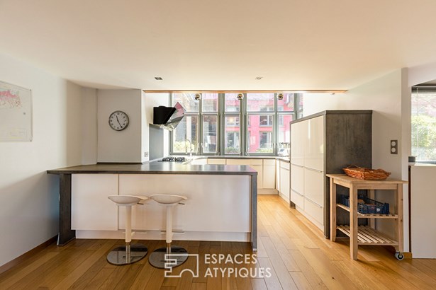 The building's industrial architecture is reflected in the raw materials and clean lines, giving the place a distinctive personality. On the first floor, two bedrooms benefit from pleasant volumes accessible from an elegant staircase combining metal and wood. The bathroom is sober and elegant, blending in perfectly with the rest of the house.