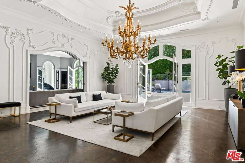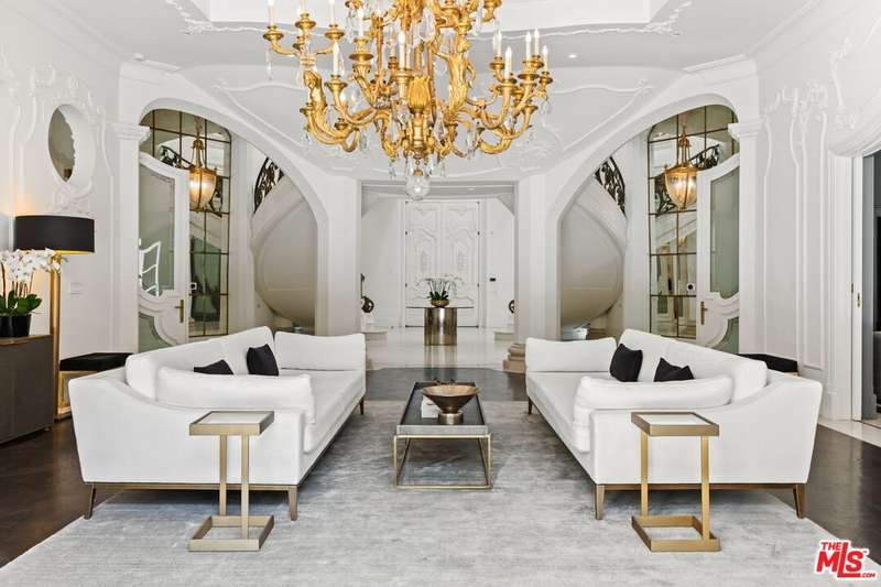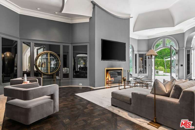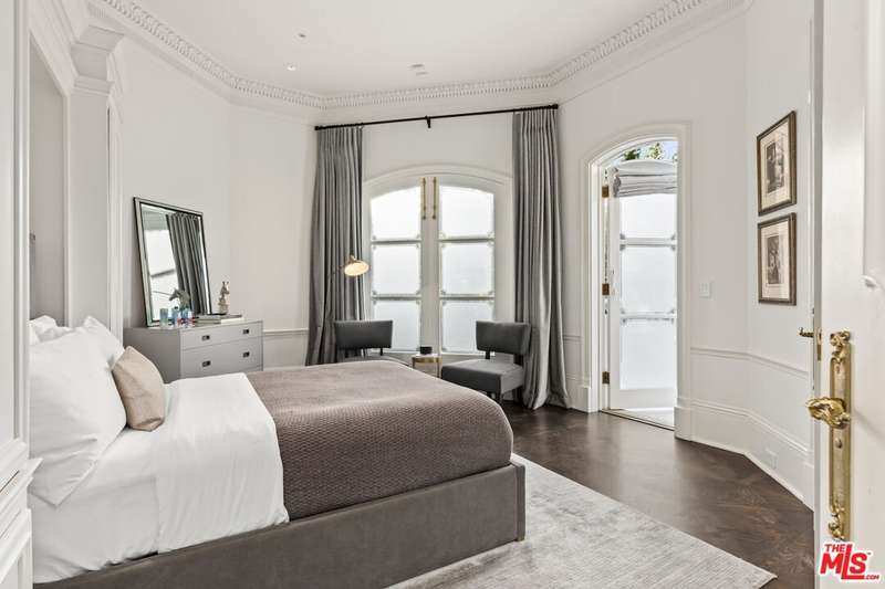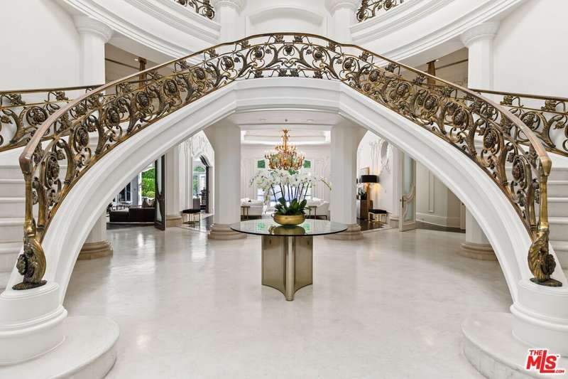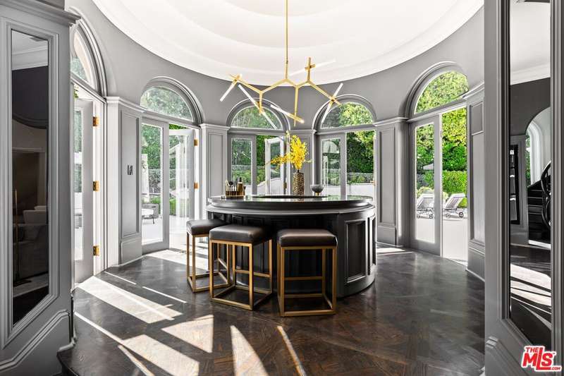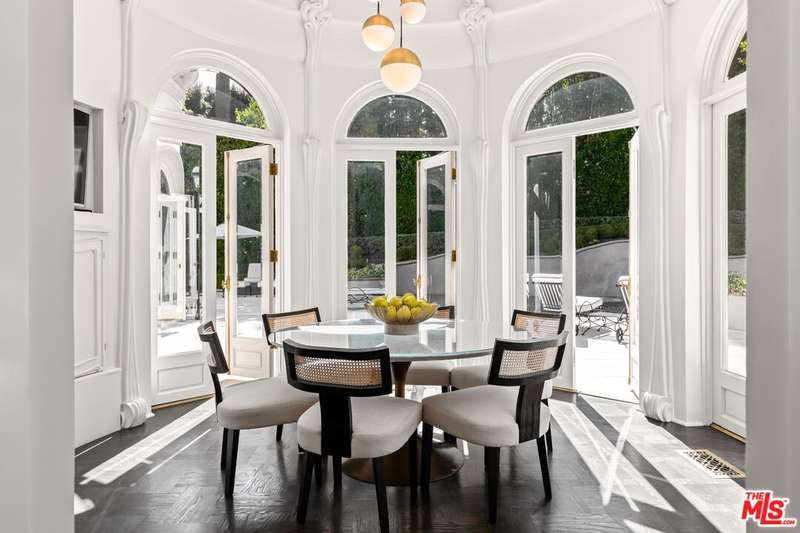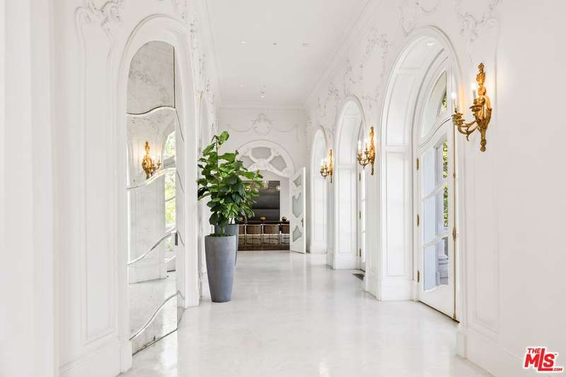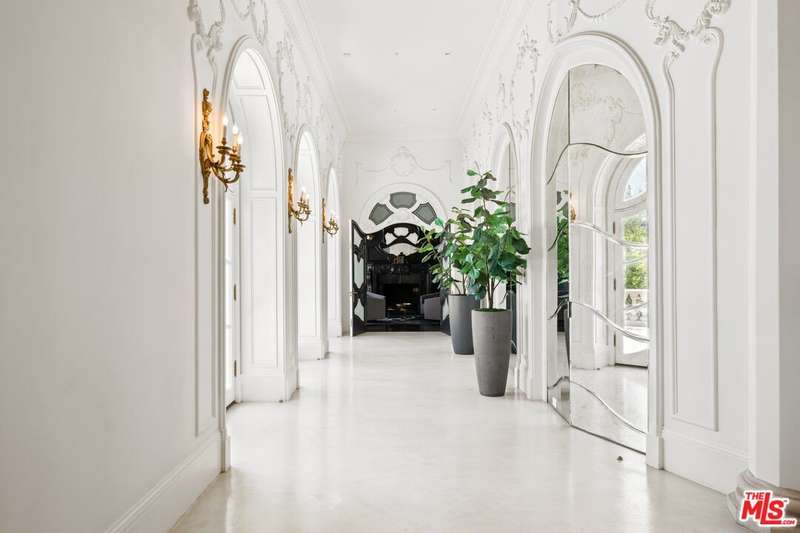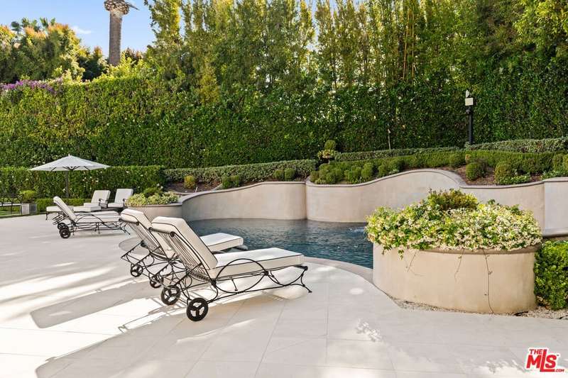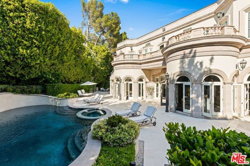 This stunning private estate, located in the prestigious city of Beverly Hills, combines timeless classical architecture with sleek contemporary interior design. Enter through grand double doors into an impressive foyer featuring soaring 30-foot ceilings and a striking bronze dual staircase, leading to a seamless indoor-outdoor layout. The formal rotunda entrance sets a tone of elegance, inspired by the refined style of the Peninsula Hotel in Paris. Blending European architectural elements, this home is a masterpiece of craftsmanship and detail.With 8 bedrooms, 12 bathrooms, and an array of formal spaces including family, living, and dining rooms with fireplaces, along with a library, bar, and media room, the estate is designed for both luxury and comfort. The custom-designed kitchen, created by Martin Pierce, includes a butler's pantry and top-of-the-line appliances. The master suite features dual bathrooms, spacious walk-in closets, and an attached private office.The impeccably landscaped grounds are an oasis, featuring a cascading pool, spa, shaded seating areas, and vibrant gardens. Ideal for hosting large gatherings, the property also offers a warm and welcoming atmosphere for intimate family living.