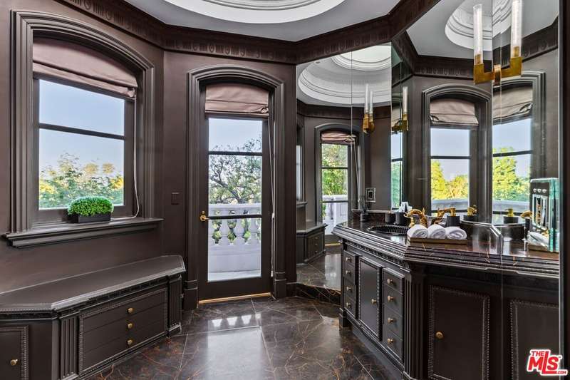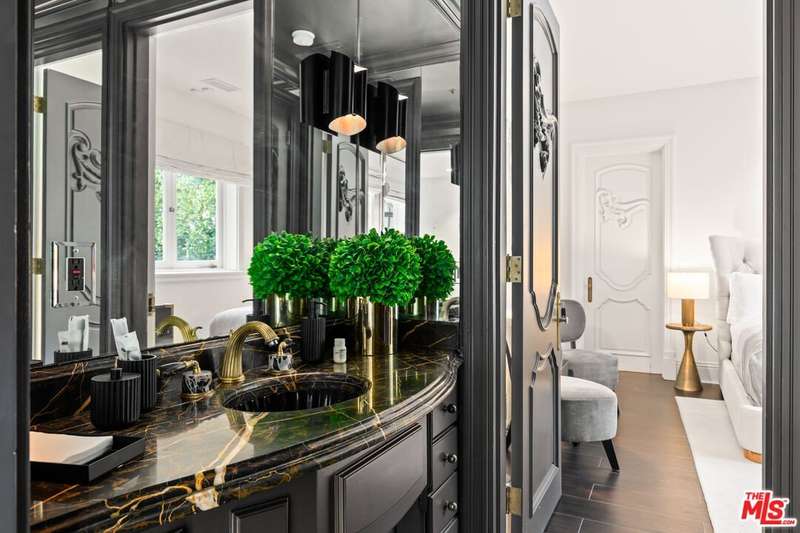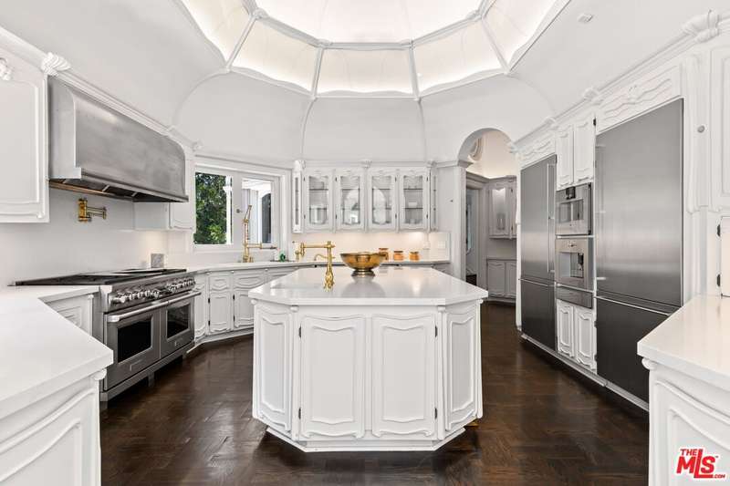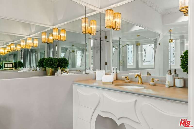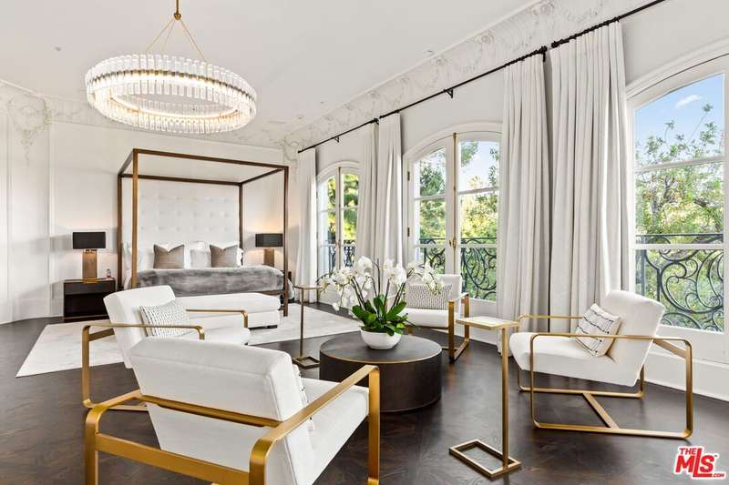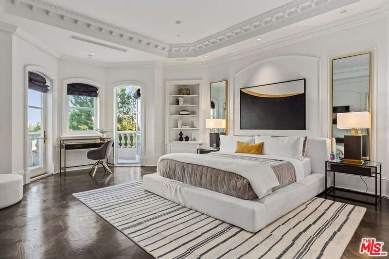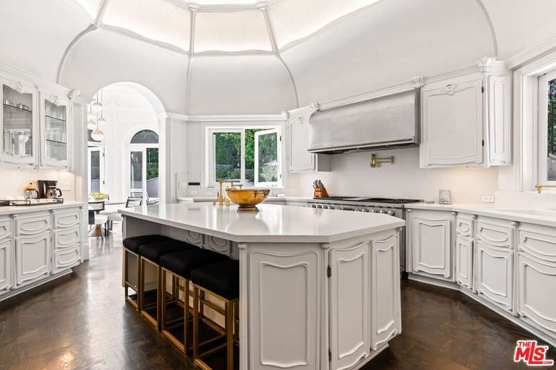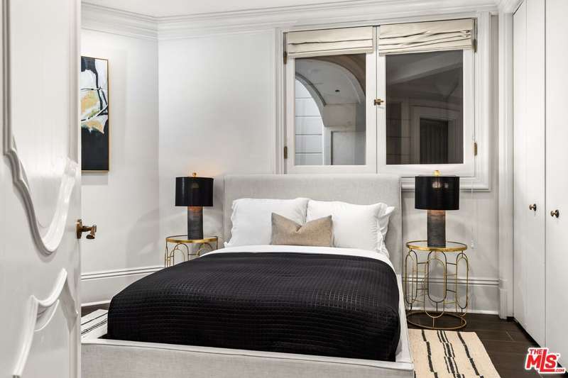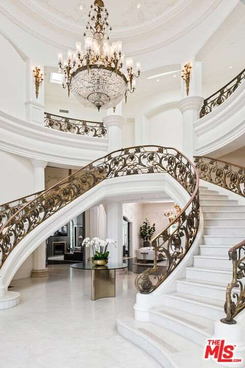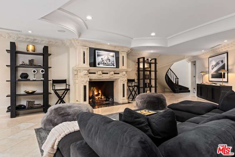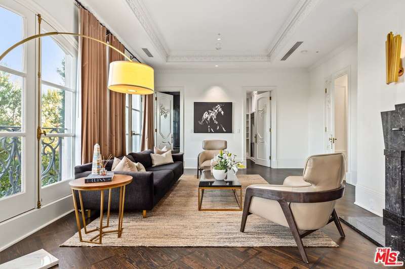 This stunning private estate, located in the prestigious city of Beverly Hills, combines timeless classical architecture with sleek contemporary interior design. Enter through grand double doors into an impressive foyer featuring soaring 30-foot ceilings and a striking bronze dual staircase, leading to a seamless indoor-outdoor layout. The formal rotunda entrance sets a tone of elegance, inspired by the refined style of the Peninsula Hotel in Paris. Blending European architectural elements, this home is a masterpiece of craftsmanship and detail.With 8 bedrooms, 12 bathrooms, and an array of formal spaces including family, living, and dining rooms with fireplaces, along with a library, bar, and media room, the estate is designed for both luxury and comfort. The custom-designed kitchen, created by Martin Pierce, includes a butler's pantry and top-of-the-line appliances. The master suite features dual bathrooms, spacious walk-in closets, and an attached private office.The impeccably landscaped grounds are an oasis, featuring a cascading pool, spa, shaded seating areas, and vibrant gardens. Ideal for hosting large gatherings, the property also offers a warm and welcoming atmosphere for intimate family living.