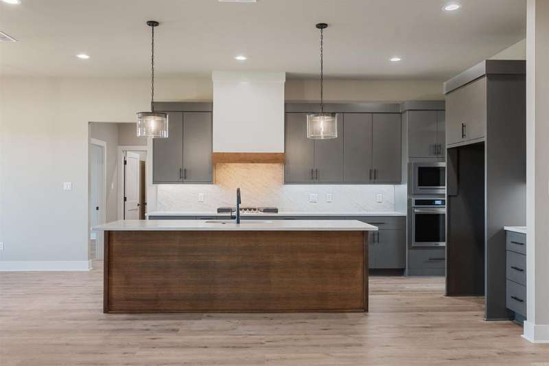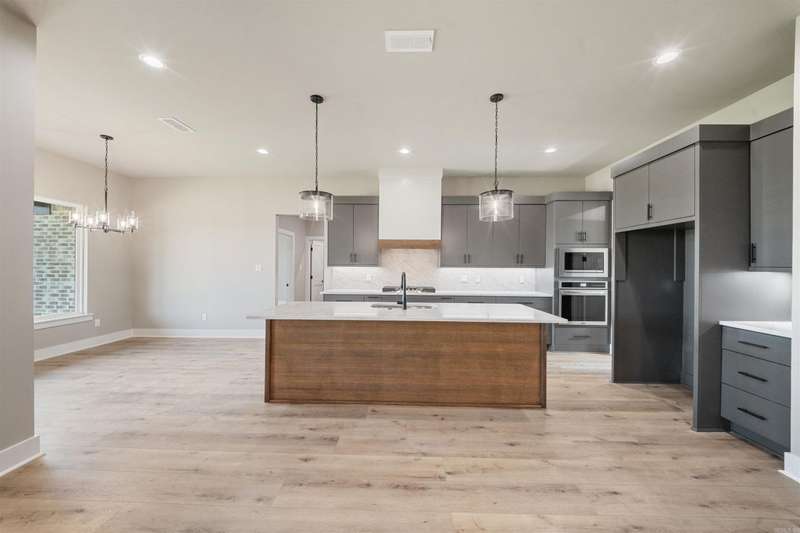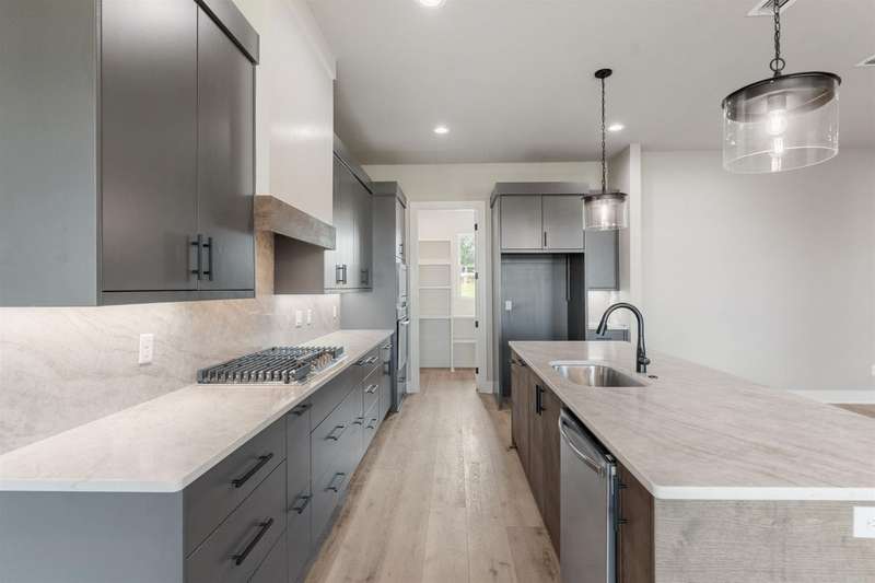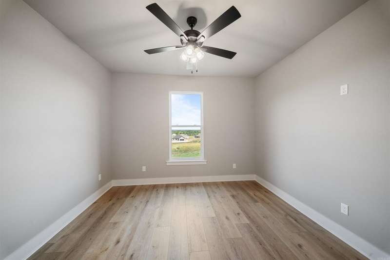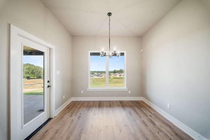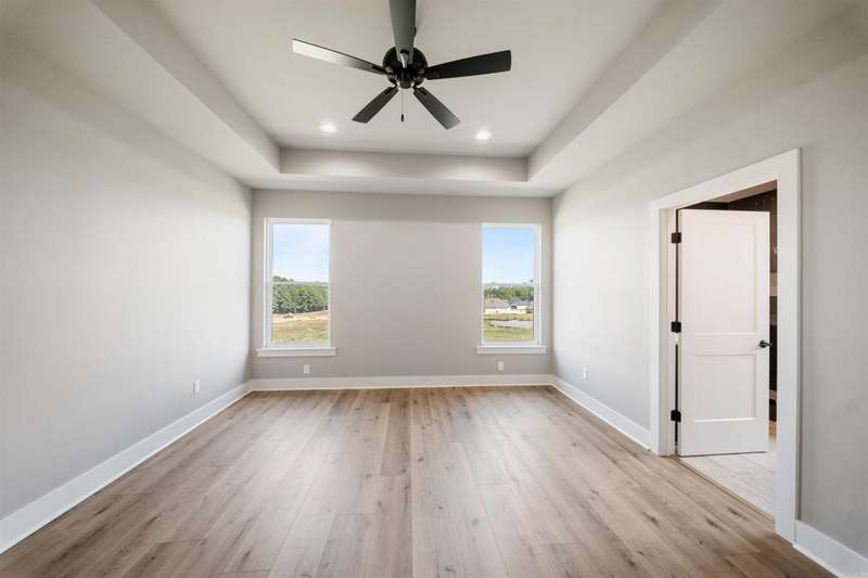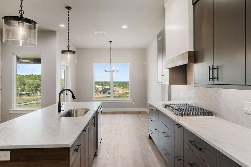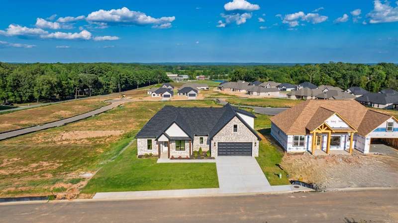 This home has a great view, covered back porch, extra landscaping! Two car garage, Home has LVP flooring, office, great room over looks kitchen with large island, wall oven, gas cooktop, extra large walk in pantry. Primary bedroom has custom ceiling . Primary bath has custom tile shower with free standing tub. Two other bedrooms have bathroom with double sinks. Bedroom upstairs with full bath.