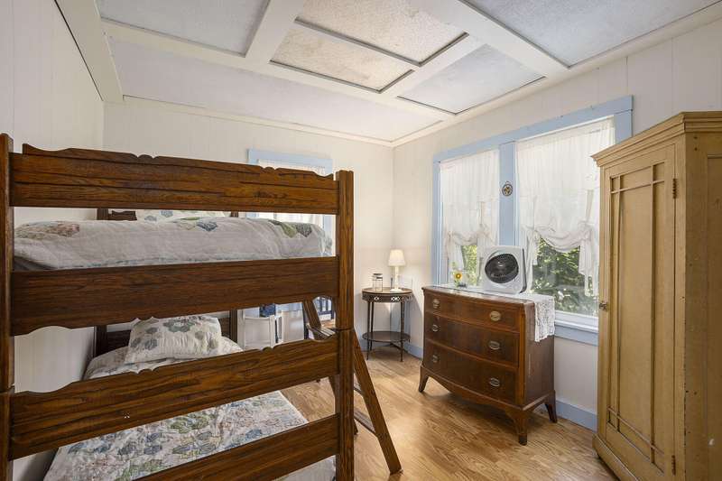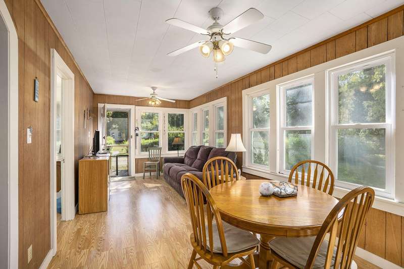 Discover this cozy summer cottage in the sought-after Mt. Pleasant lakeshore community, where residents enjoy 1,300 feet of sandy Lake Michigan beach, accessible by a sturdy tram. Community amenities include a spacious playground with recreation hall, basketball court, playground equipment, and plenty of green space for outdoor fun. The cottage has been nicely maintained with recent updates: new vinyl siding, trim, and soffits (2024), a newer roof and windows (approx. 10 years), an updated bath, and a large 11' x 26' screened porch added about 8 years ago-perfect for summer evenings. With a little decorating and light refreshing, this home could become a true dollhouse retreat. Sitting on four lots (140' x 100'), the property provides generous yard space and wooded area, offering privacy and room to play.