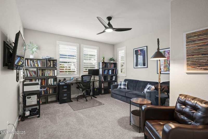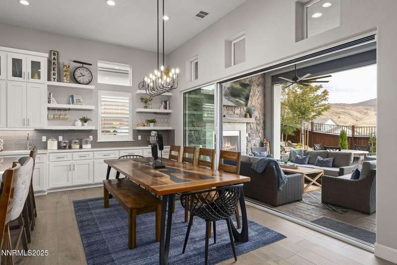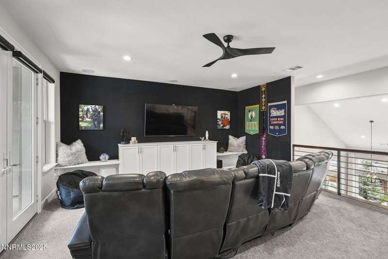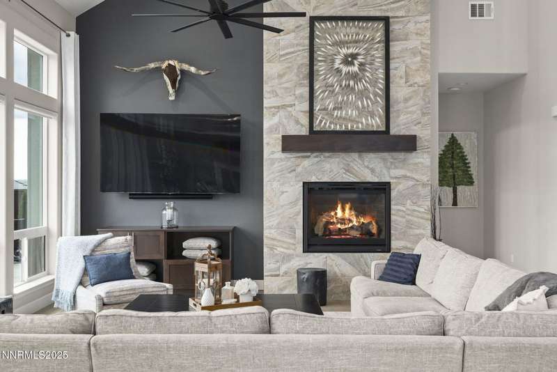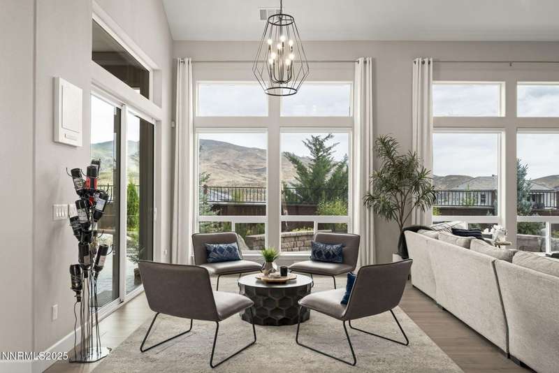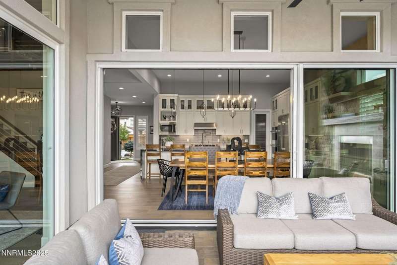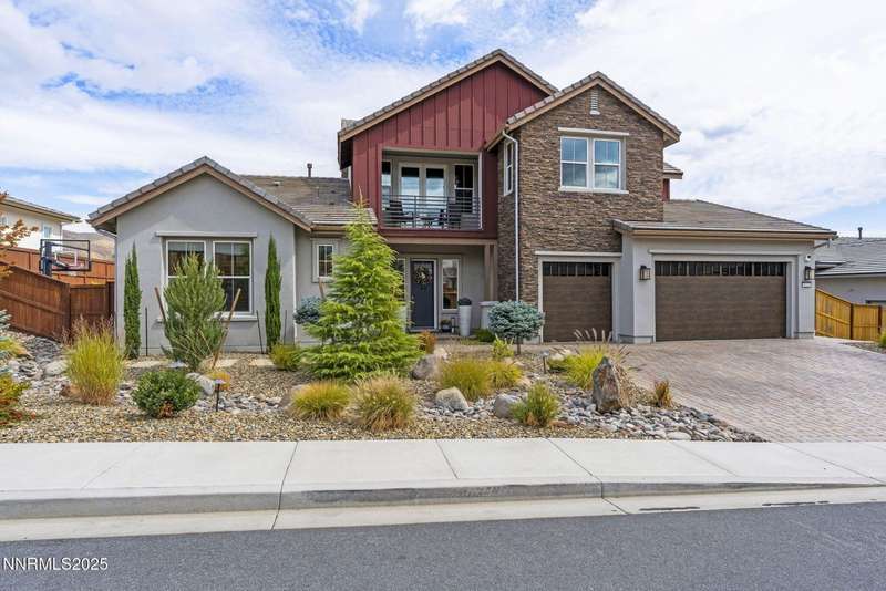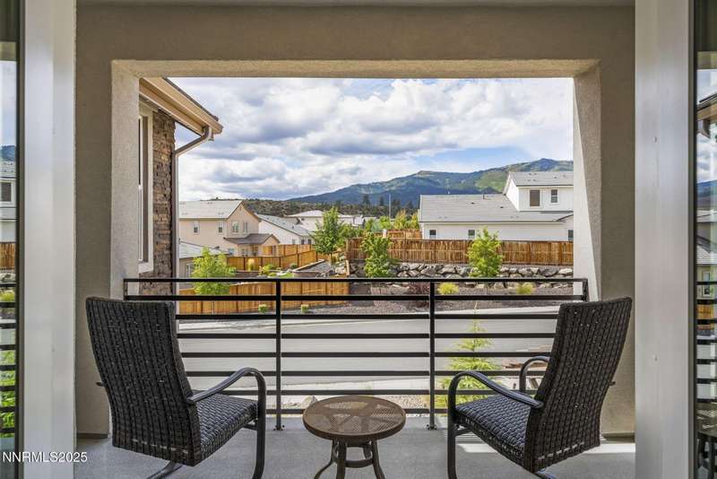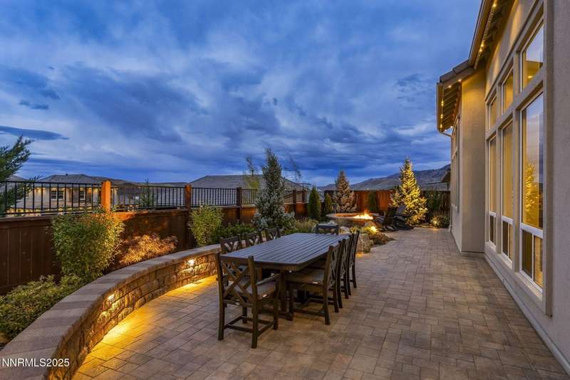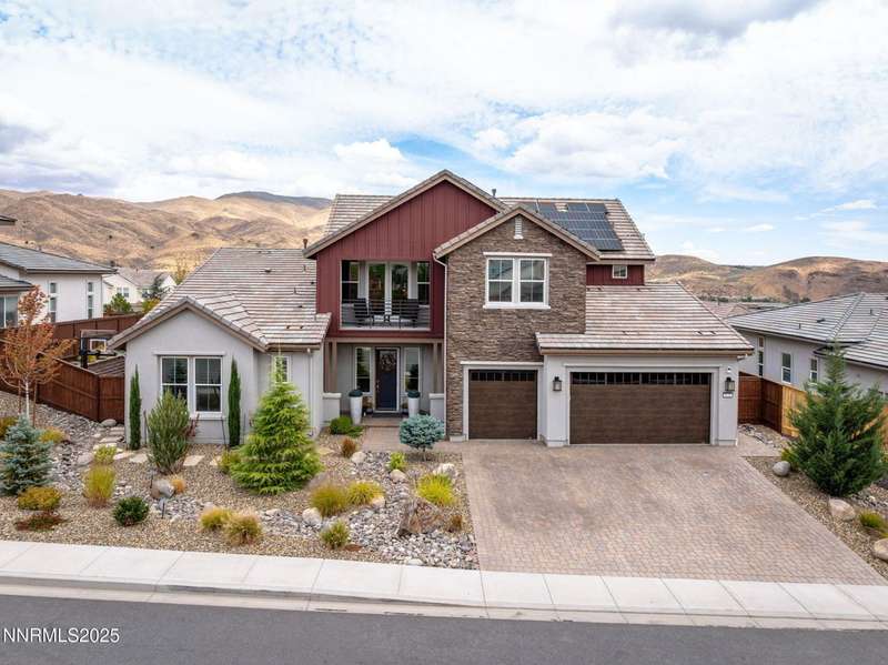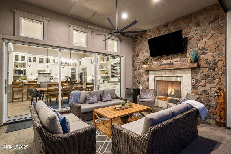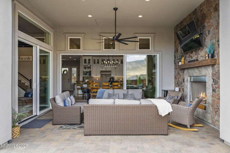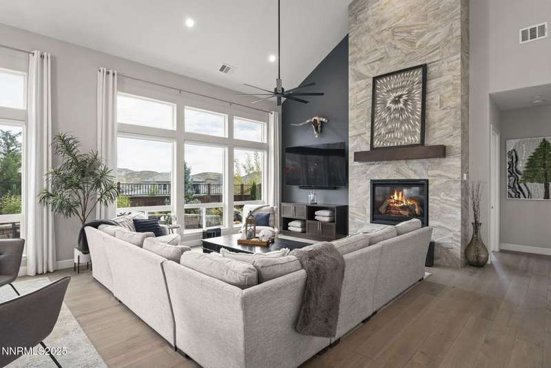 Stunning luxury Verdi home on a premium lot with no rear neighbors and breathtaking mountain views. The main-level primary suite offers a cozy fireplace and spa-inspired finishes, while the chef's kitchen features JennAir appliances, granite waterfall island, farmhouse sink, pot filler, and extended cabinetry. Custom shutters, hardwood floors, surround sound, and built-ins elevate the interior. Enjoy seamless indoor-outdoor living with retractable screens, a covered patio with fireplace, and an entertainer's backyard complete with professional landscaping, waterfall, fire pit, fire table, built-in Coyote gas grill & large Kamado Joe charcoal grill, a custom half basketball court, and Bullfrog spa. Owned solar with EV charger, permanent lighting, whole-home water system, and a custom gym with HVAC add convenience and comfort. Experience the best of both worlds-peaceful living just minutes from shopping, dining, downtown Reno, and only a short drive up to Truckee, CA and year round mountain activities! Welcome home!
