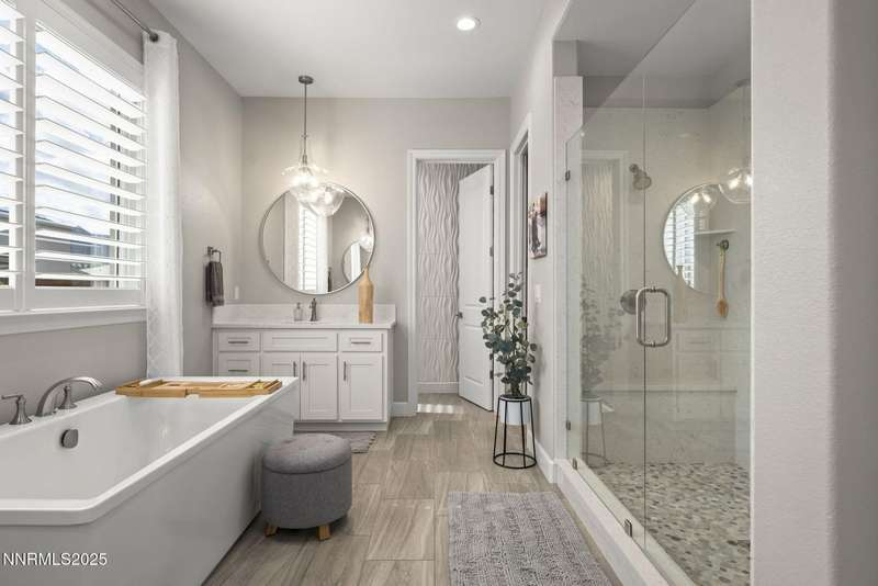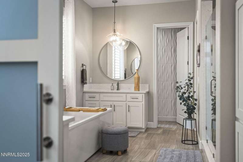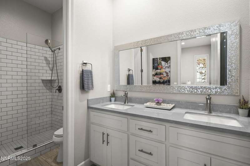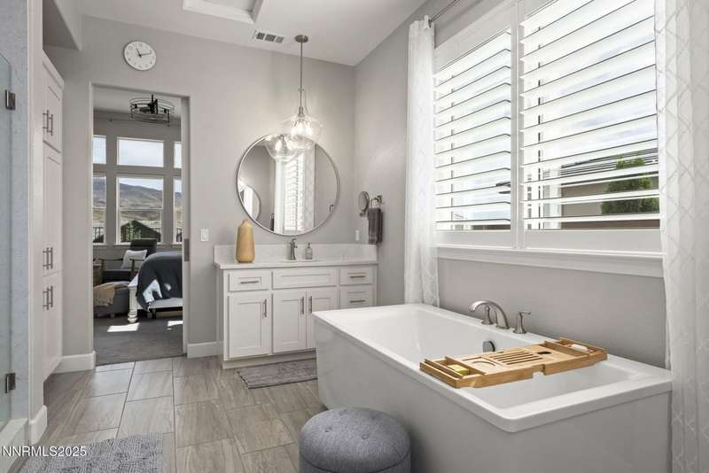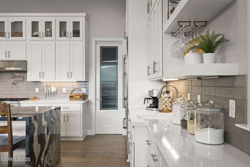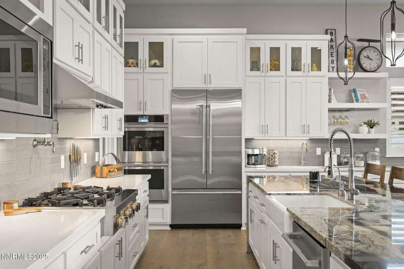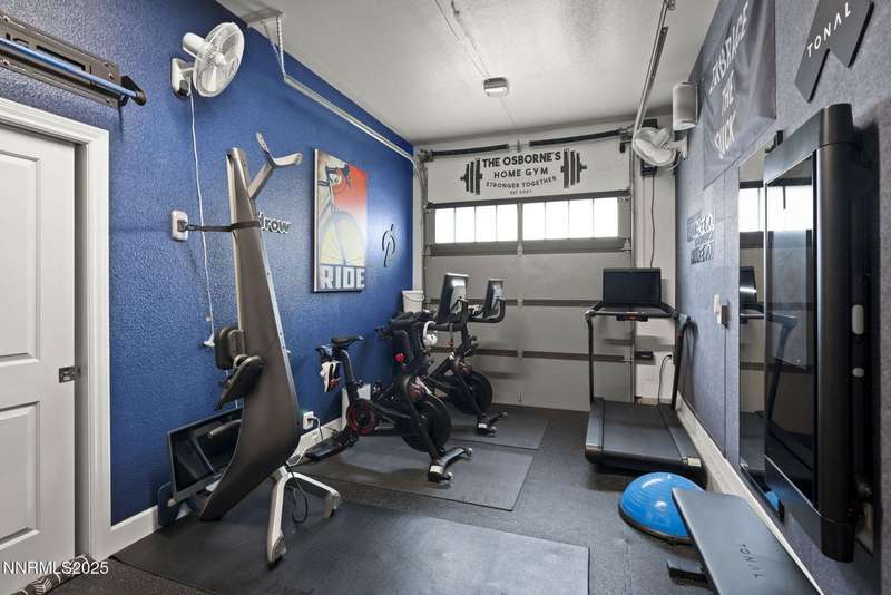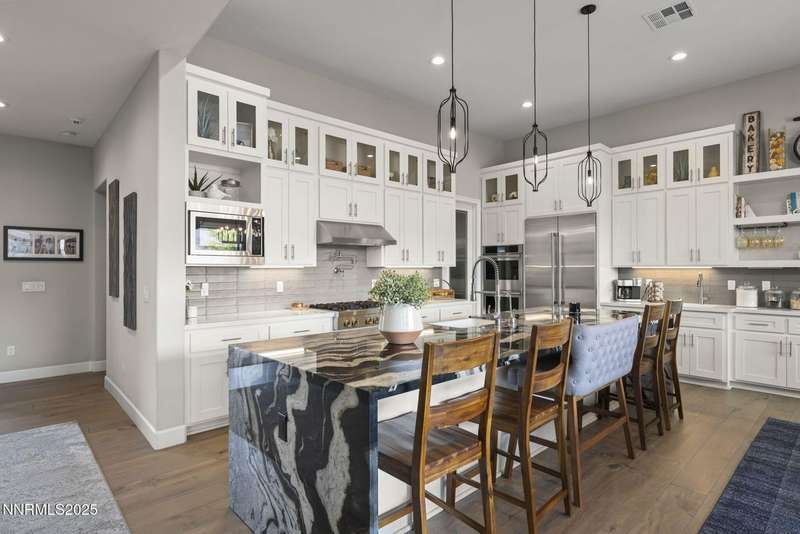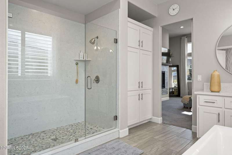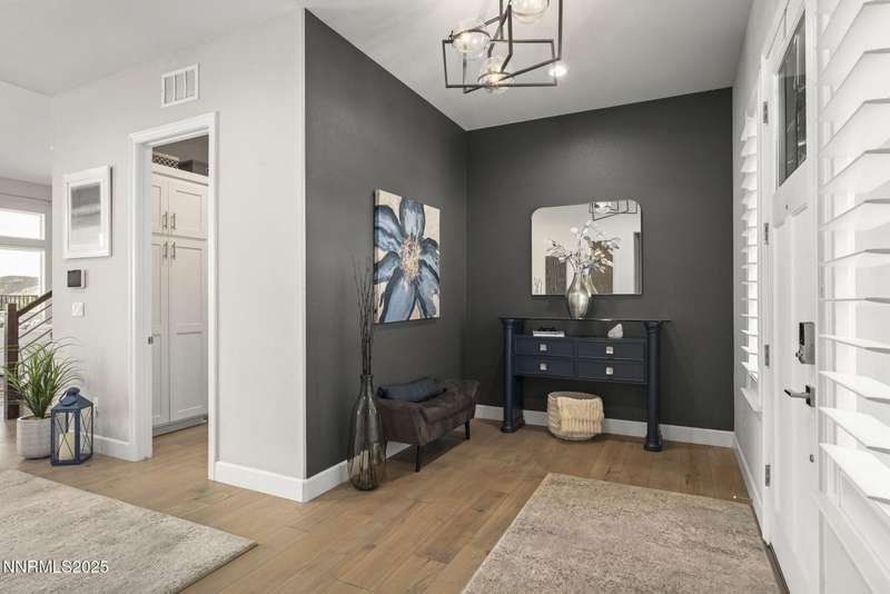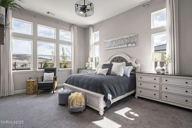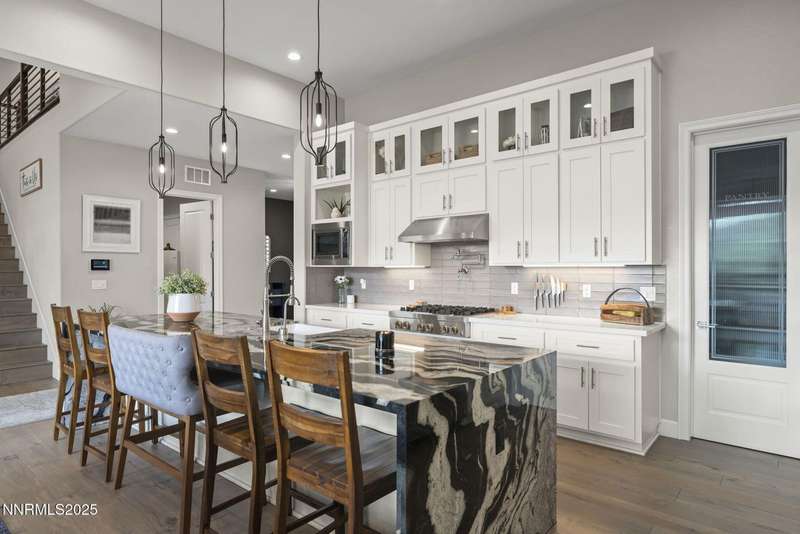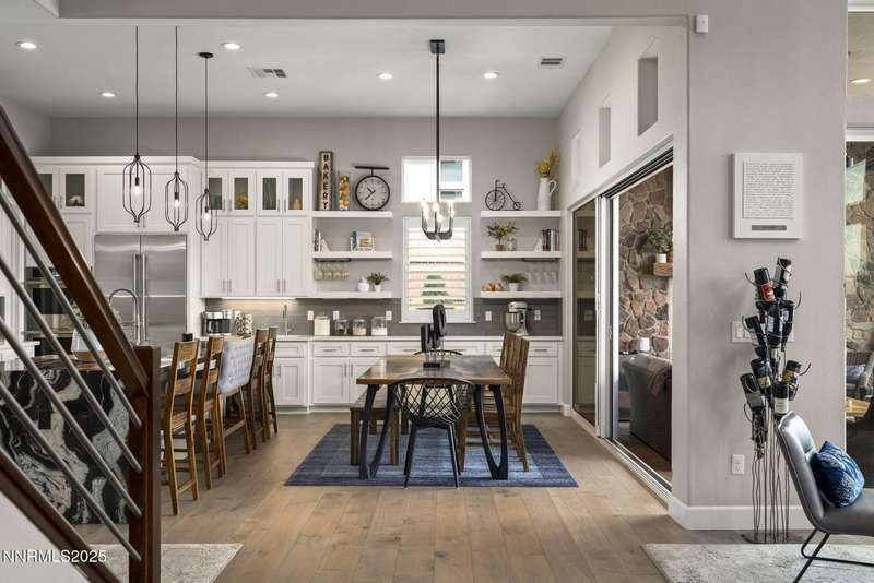Stunning luxury Verdi home on a premium lot with no rear neighbors and breathtaking mountain views. The main-level primary suite offers a cozy fireplace and spa-inspired finishes, while the chef's kitchen features JennAir appliances, granite waterfall island, farmhouse sink, pot filler, and extended cabinetry. Custom shutters, hardwood floors, surround sound, and built-ins elevate the interior. Enjoy seamless indoor-outdoor living with retractable screens, a covered patio with fireplace, and an entertainer's backyard complete with professional landscaping, waterfall, fire pit, fire table, built-in Coyote gas grill & large Kamado Joe charcoal grill, a custom half basketball court, and Bullfrog spa. Owned solar with EV charger, permanent lighting, whole-home water system, and a custom gym with HVAC add convenience and comfort. Experience the best of both worlds-peaceful living just minutes from shopping, dining, downtown Reno, and only a short drive up to Truckee, CA and year round mountain activities! Welcome home!