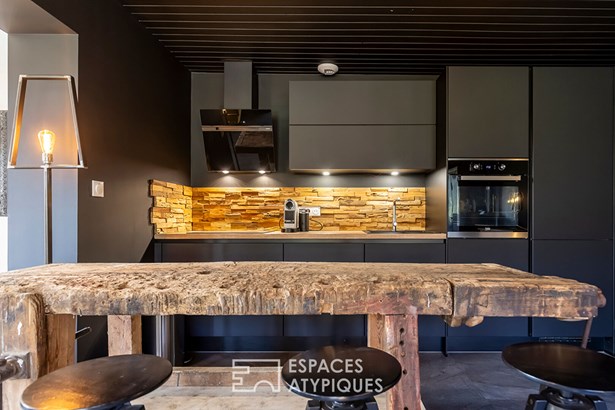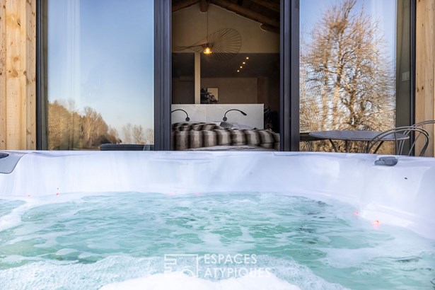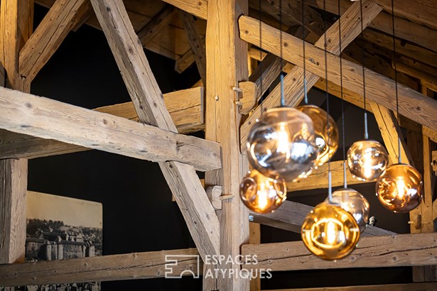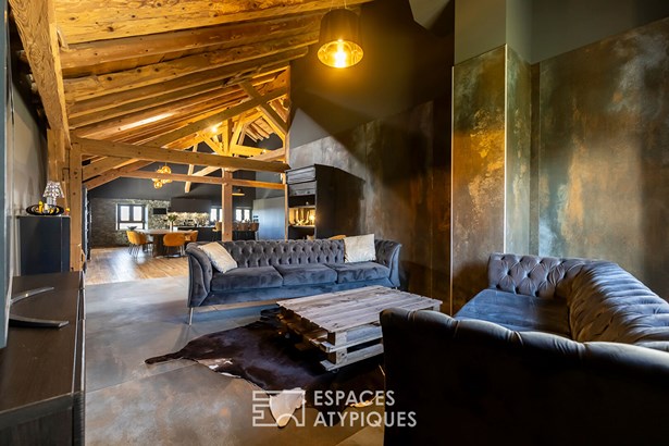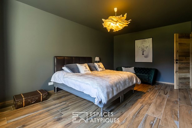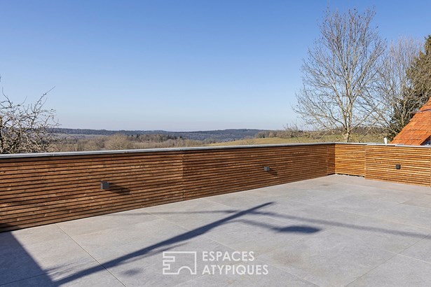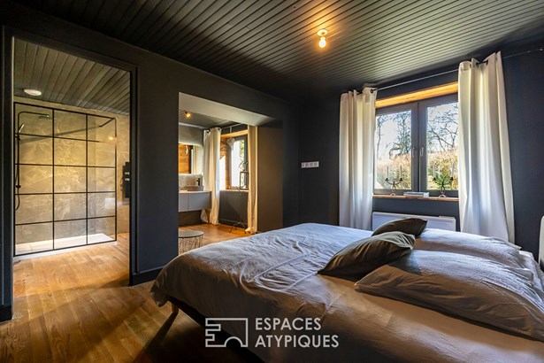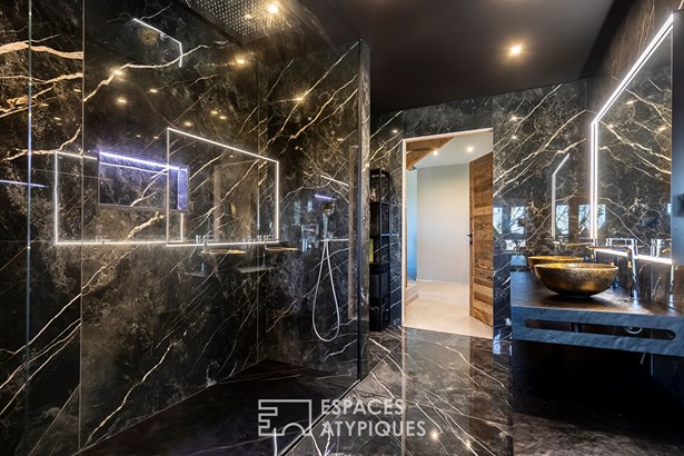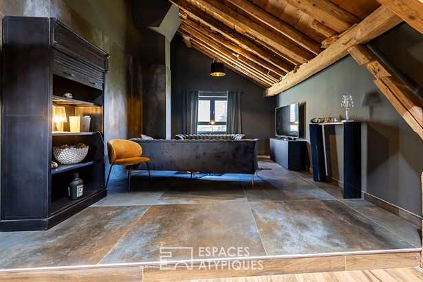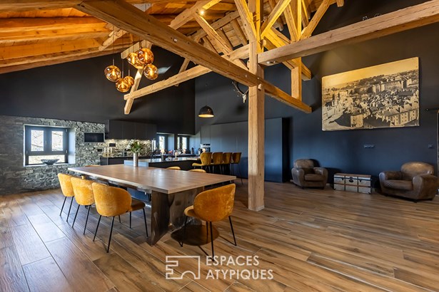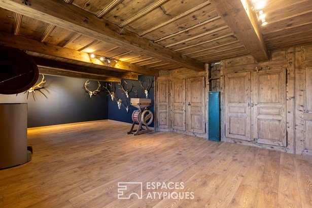 The second accommodation, arranged upstairs in the old barn, deploys 226 m 2. It houses a spectacular living room with open kitchen of more than 100 m2 enhanced by exposed beams and a cathedral roof, with direct access to a terrace of 100 m2 offering a panoramic view. Three bedrooms, a bathroom and a master suite of 43 m2 with dressing room, bathroom and toilet make up this level. On the old barn deck, a relaxation area with jacuzzi completes this exceptional floor.