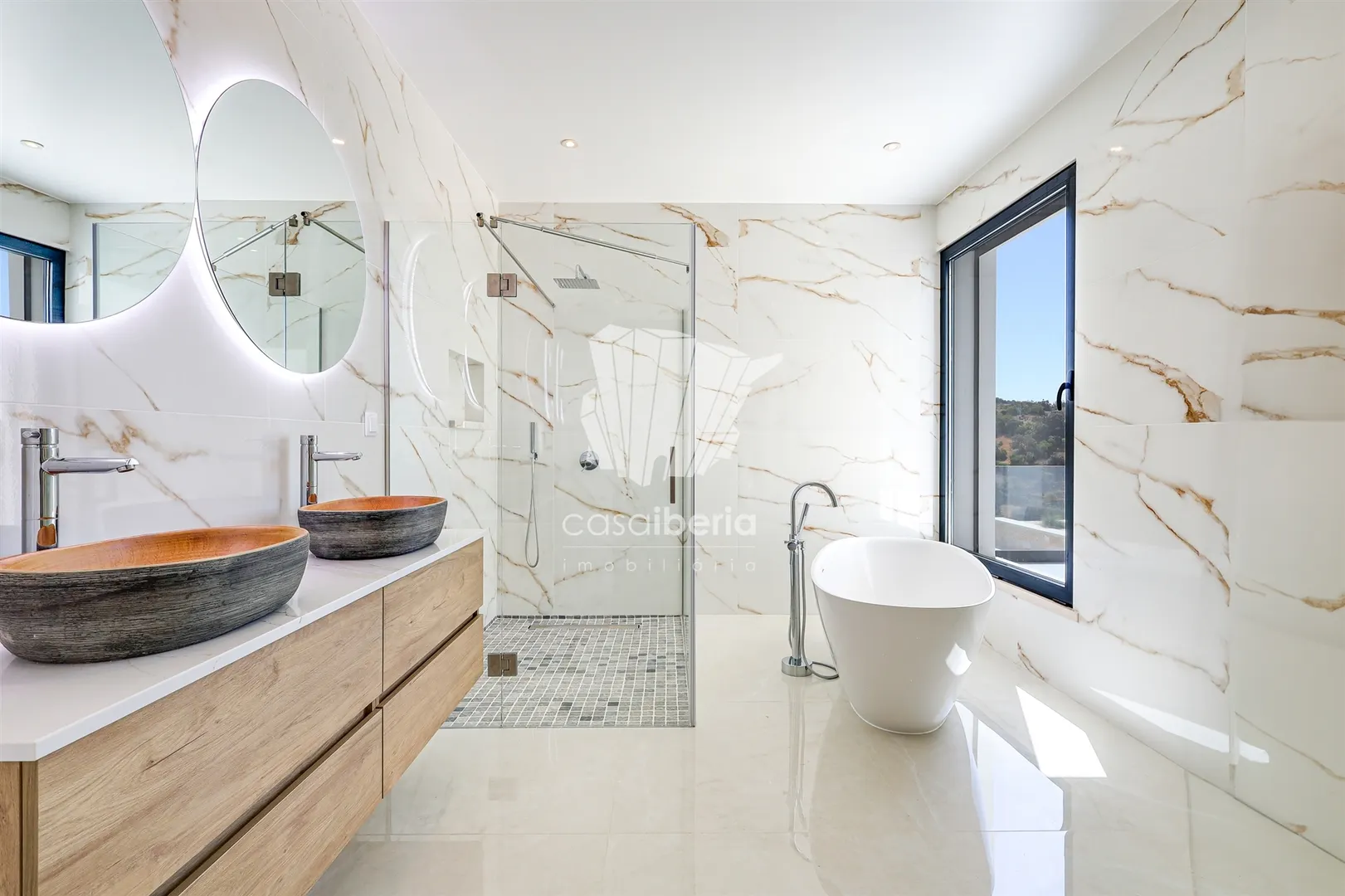 Outside, there is an impressive infinity pool with a jacuzzi, providing a perfect setting to relax and enjoy the panoramic views of the garden.