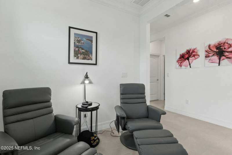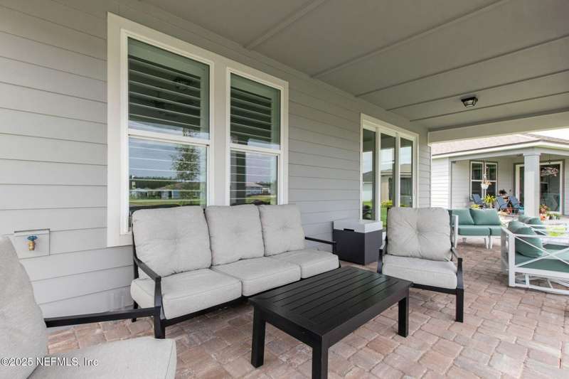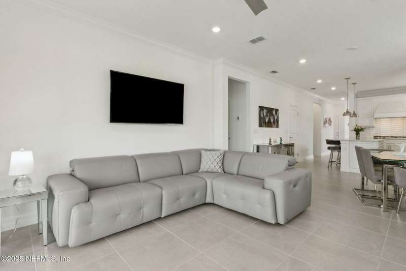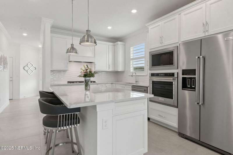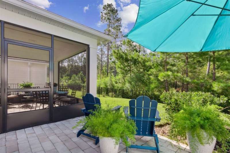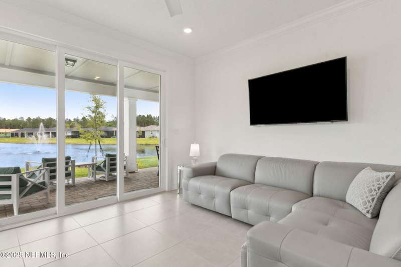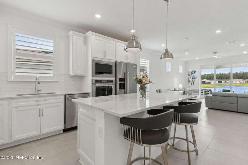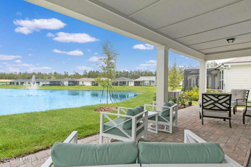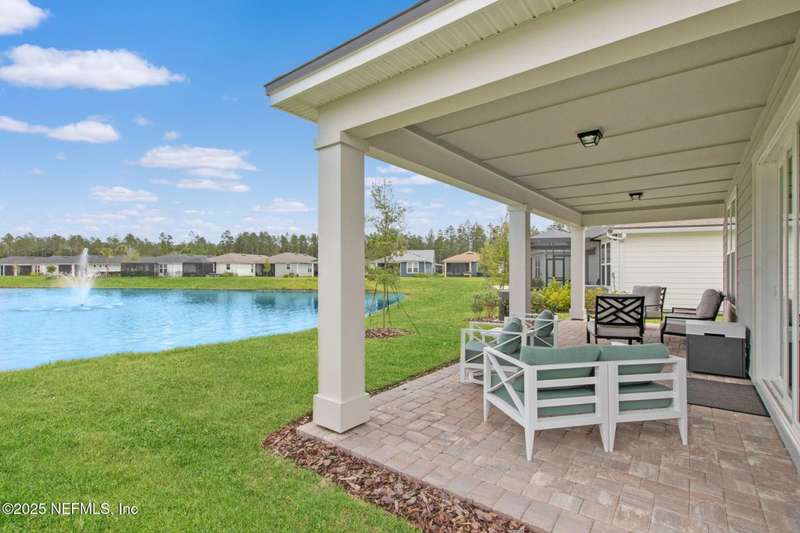 Discover this beautifully crafted 2024-built pond view home in a premier 55+ active adult, guard-gated community. Featuring 2 spacious bedrooms, 2 full bathrooms, and a versatile office/bonus room, this home offers the perfect combination of luxury and low-maintenance living.Enjoy breathtaking pond views with dual fountains right from your family room, kitchen & master suite, creating a peaceful, scenic backdrop every day. The open-concept layout flows effortlessly into a gourmet kitchen complete with quartz countertops, stainless steel appliances, custom backsplash and a large center island-ideal for entertaining. The expansive master suite is a true retreat with the perfect amount of natural light shining through. The master bath boasts double vanities w/ quartz countertops, an extended glass-enclosed walk-in shower and a generously sized walk-in closet. Step outside to your covered and extended paver lanai, perfect for relaxing and enjoying the serene water views. Other great features include plantation shutters, water softener, washer/dryer, spacious 2-car garage w/ epoxy floor, full irrigation system and located in a natural gas community. This home offers quality finishes, modern design, and exceptional amenities in a highly desirable neighborhood. Del Webb Wildlight offers a resort lifestyle to their residents (20% of the community is available for under 55), with an abundance of social events and a list of amenities a mile long - glistening pool w/ spa, 16k sqft clubhouse, tennis, pickleball, fire pit area, abundance of nature trails and so much more! Don't miss this rare opportunity to live like you are on vacation everyday schedule your private showing today!