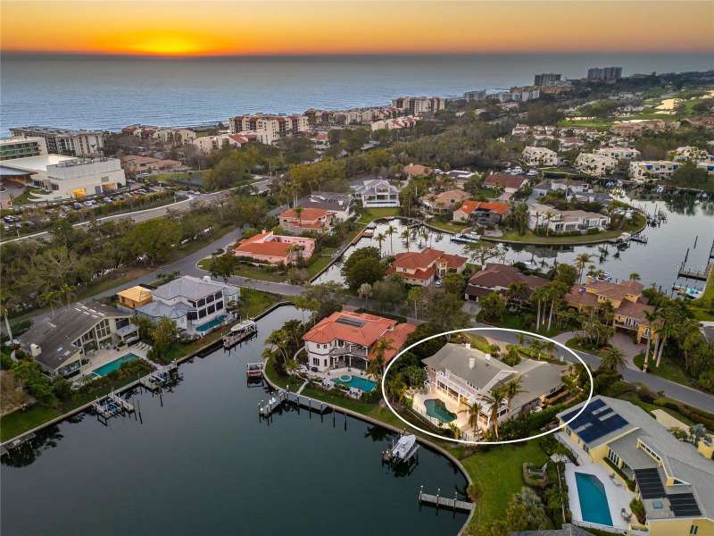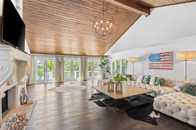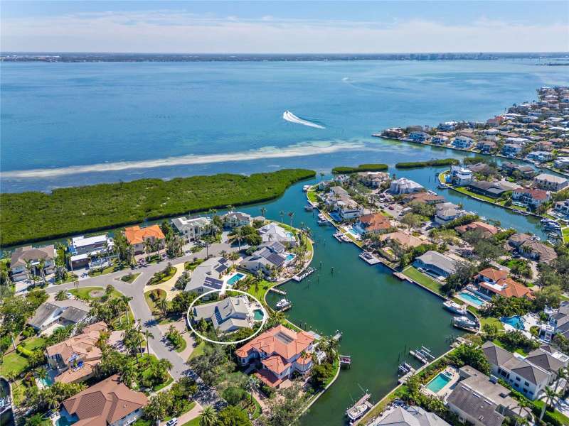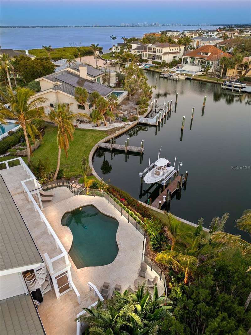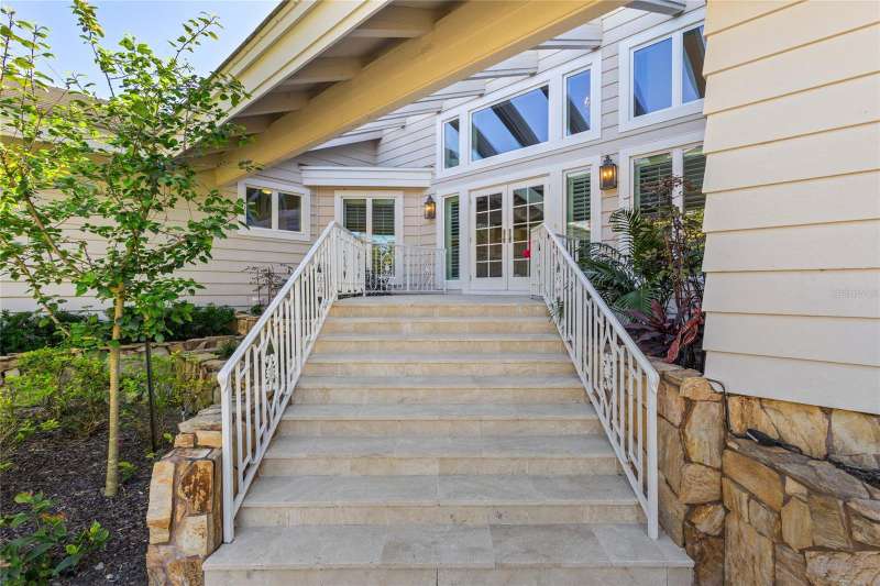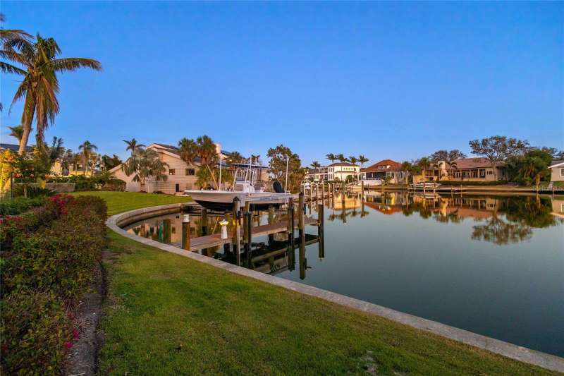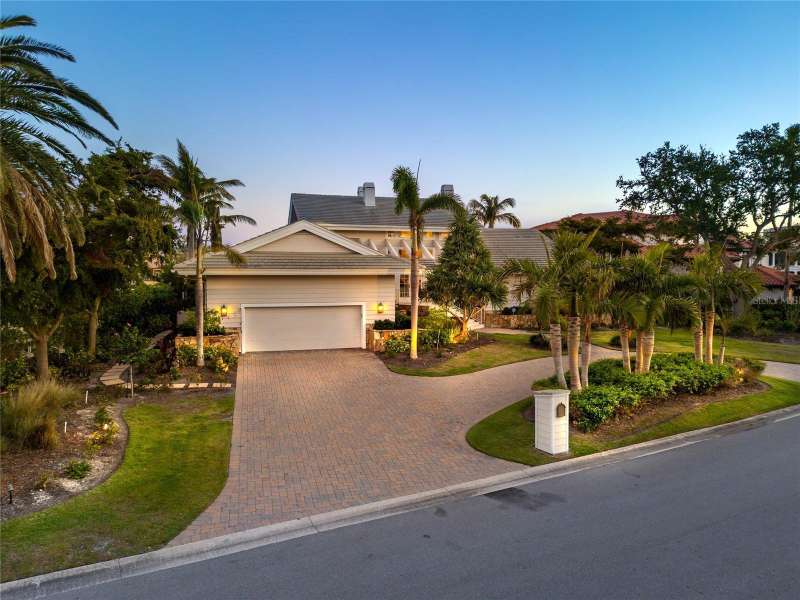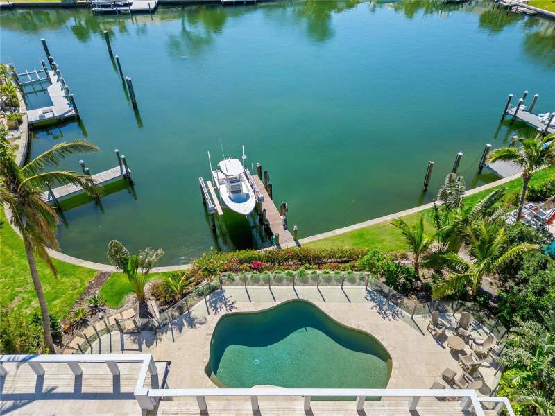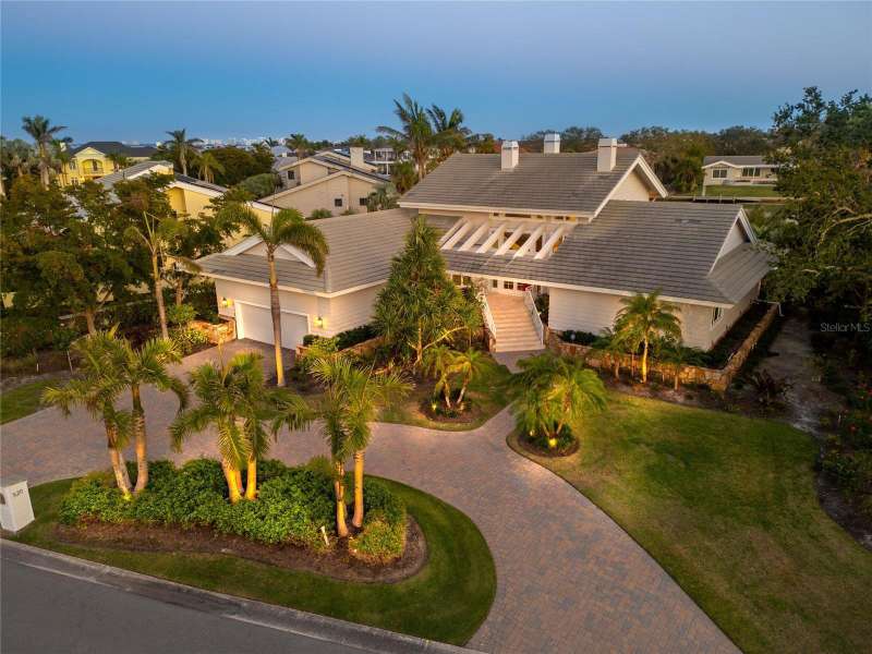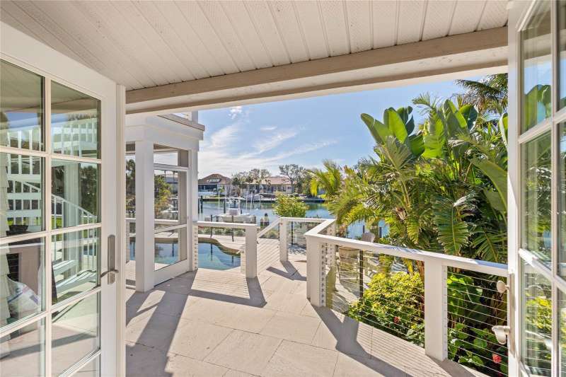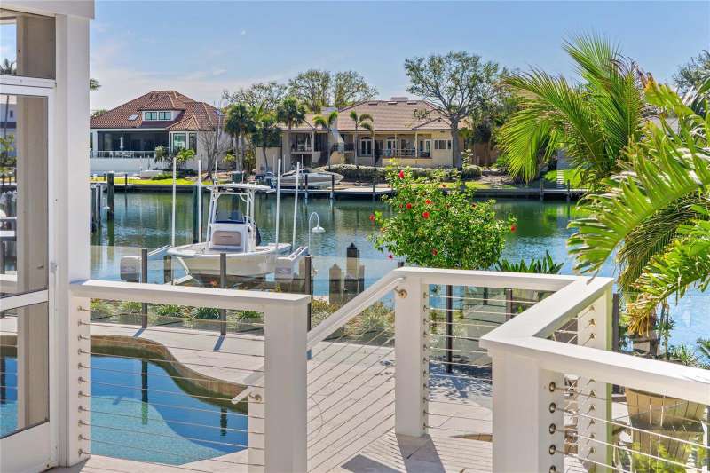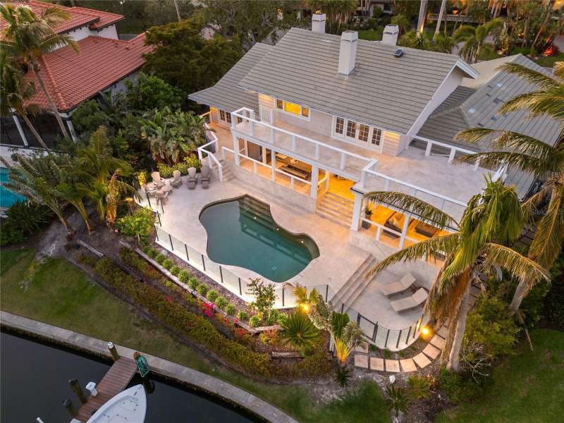 This exquisite two-story waterfront home located in the coveted Harbor section of Bay Isles has been meticulously renovated to embody modern elegance and luxurious coastal living. Surrounded by lush tropical landscaping, the home welcomes you through an elegant French door entrance into the grand foyer, where soaring ceilings, gleaming travertine flooring, and a striking wrought iron floating staircase with rich, dark wood steps set the tone for the refined elegance that unfolds throughout the home. The lower level boasts a bright and airy open space with hardwood floors throughout, creating a welcoming atmosphere that effortlessly combines sophistication with the timeless beauty of natural materials. The spacious family room is anchored by a stunning fireplace with decorative columns and an elegant mantel, complemented by French doors leading to the expansive waterfront lanai, reinforcing the home's seamless connection to its stunning natural surroundings. A culinary enthusiast’s dream, the generously sized kitchen features a large island with a waterfall granite countertop, custom cabinetry, ample storage space, and high-end stainless steel appliances, including a six-burner gas range and double ovens. Adjacent to the kitchen, the dining area and great room spaces flow seamlessly into each other. The great room is both grand and inviting, showcasing a dramatic wood-clad cathedral ceiling that adds warmth and character. A second stone fireplace enhances the ambiance, while three sets of French doors that open onto the lanai offer an effortless transition between indoor and outdoor living. Also on this level are two generous guest suites, each with a full bath, one with direct lanai access, and a den with full bath. Upstairs, the primary suite is a true retreat. Floor-to-ceiling windows illuminate the space, and French doors open to a spacious private balcony, offering captivating water views that create a peaceful escape. A cozy fireplace adds to the intimate atmosphere, while the spa-inspired en-suite bath indulges with marble flooring, soaking tub, dual vanities, frameless glass walk-in shower, and water closet, all overlooking the serene waterway. The outdoor living space is equally spectacular, designed for both relaxation and entertaining. The expansive lanai features multiple covered areas with a rich wood-clad ceiling and retractable screens, a sun-drenched open-air section, and a stunning saltwater pool with travertine decking framed by verdant tropical landscaping. Just beyond the pool, a private dock with a boat lift sits on a deep-water basin and wide canal with no bridges to Sarasota Bay, offering quick and direct access for boating enthusiasts. Bay Isles Beach Club membership is included. This extraordinary home seamlessly blends elegance, comfort, and the unparalleled beauty of waterfront living, creating a sanctuary that is as functional as it is breathtaking.
